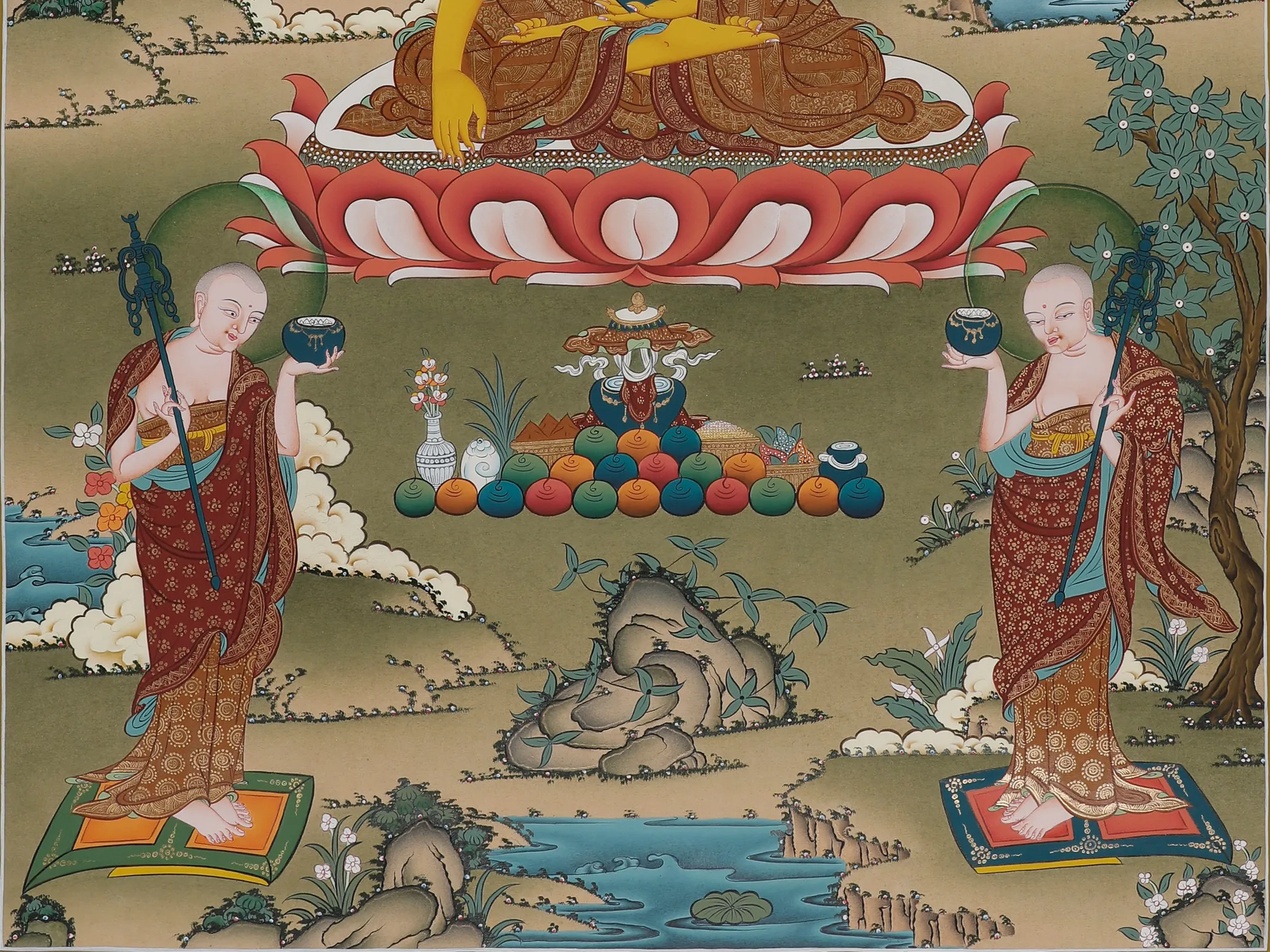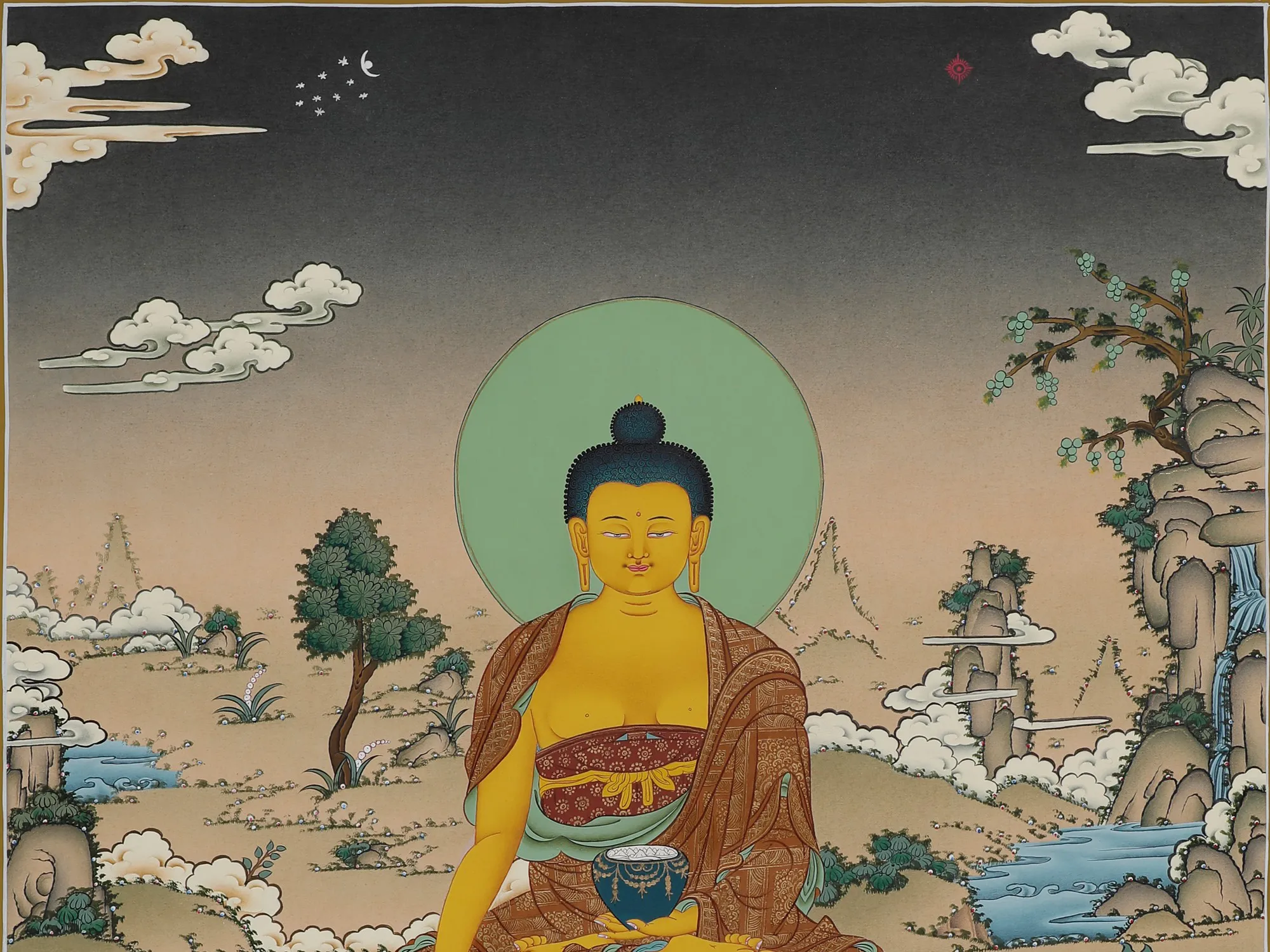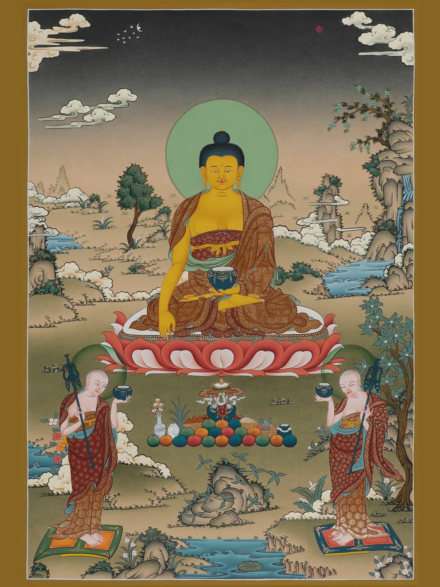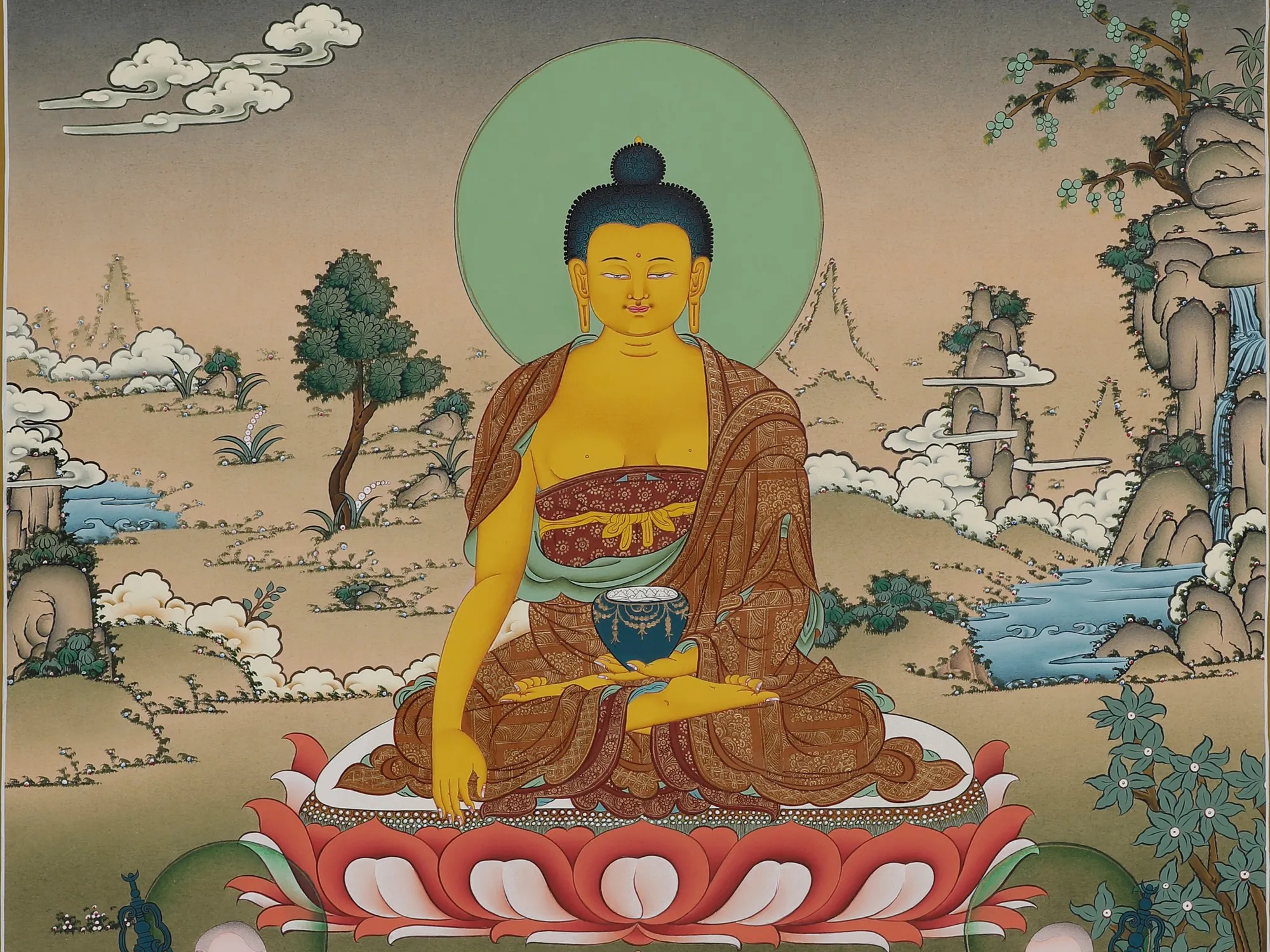 Amitabha or Amitayu Buddha embodies the fundamental of carrying out good karma in the cycle of birth and death, from our past lives. As a Bodhisattva, he’s associated with Dharmakara. Accompanied by his two disciples; he is seated in a meditative posture - appearing far drawn in dhyana; holding the vase of elixir that promises the longevity of the soul’s spiritual journey.