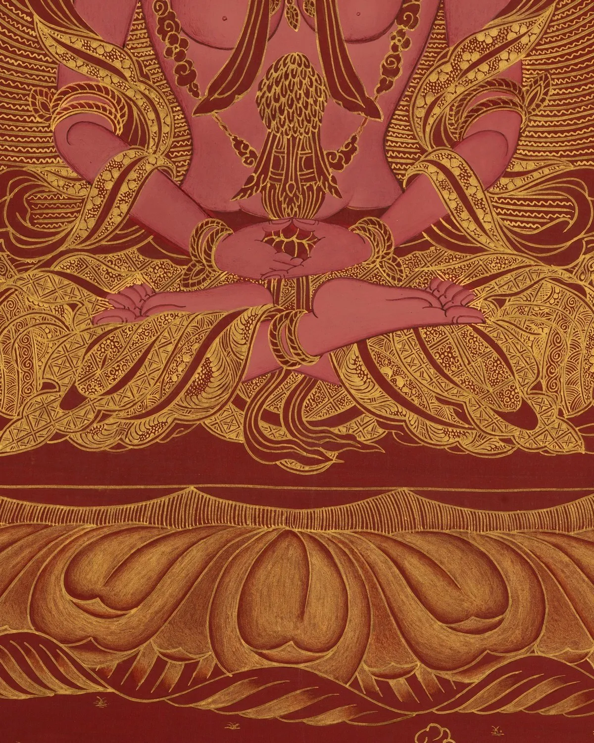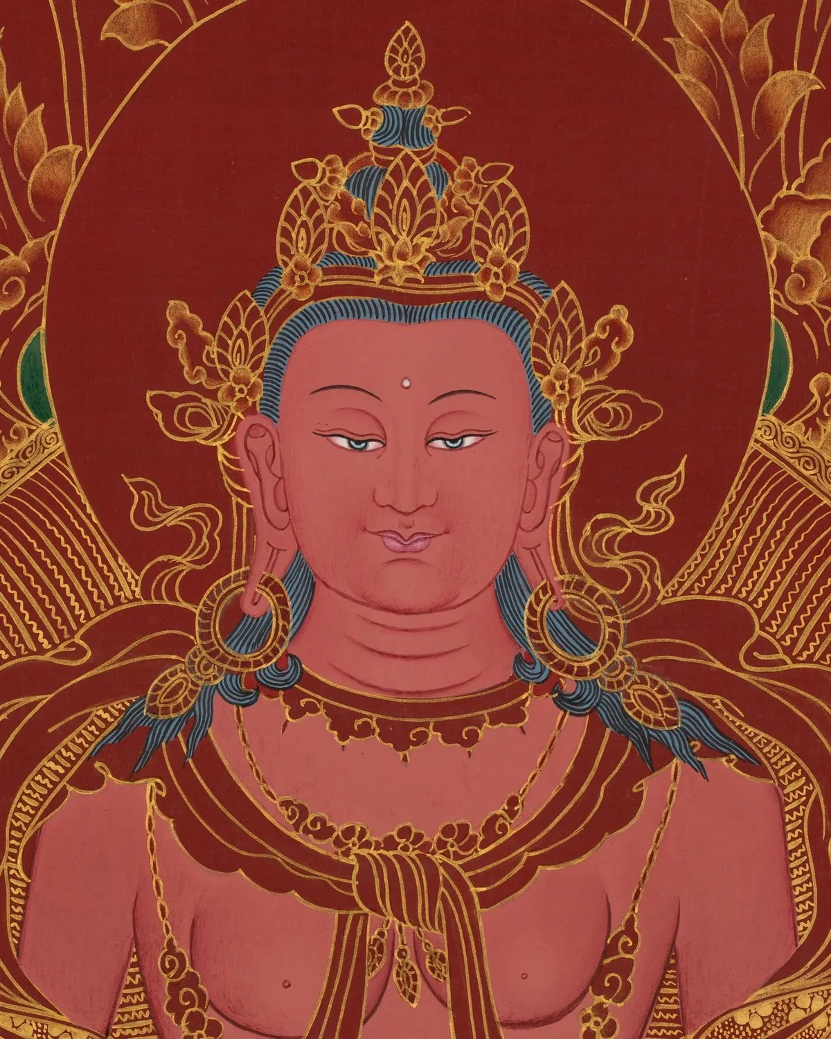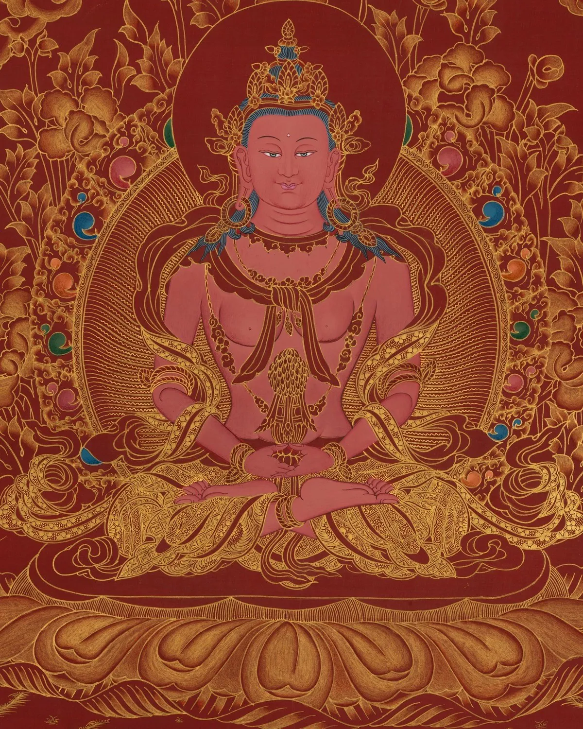 From Bodhisattva collection, Aprarmita/Amitayus Thangka (Brocadeless Thangka) (Pure 24 Carat Gold,Gouache and acrylic colors on Cotton Canvas)
