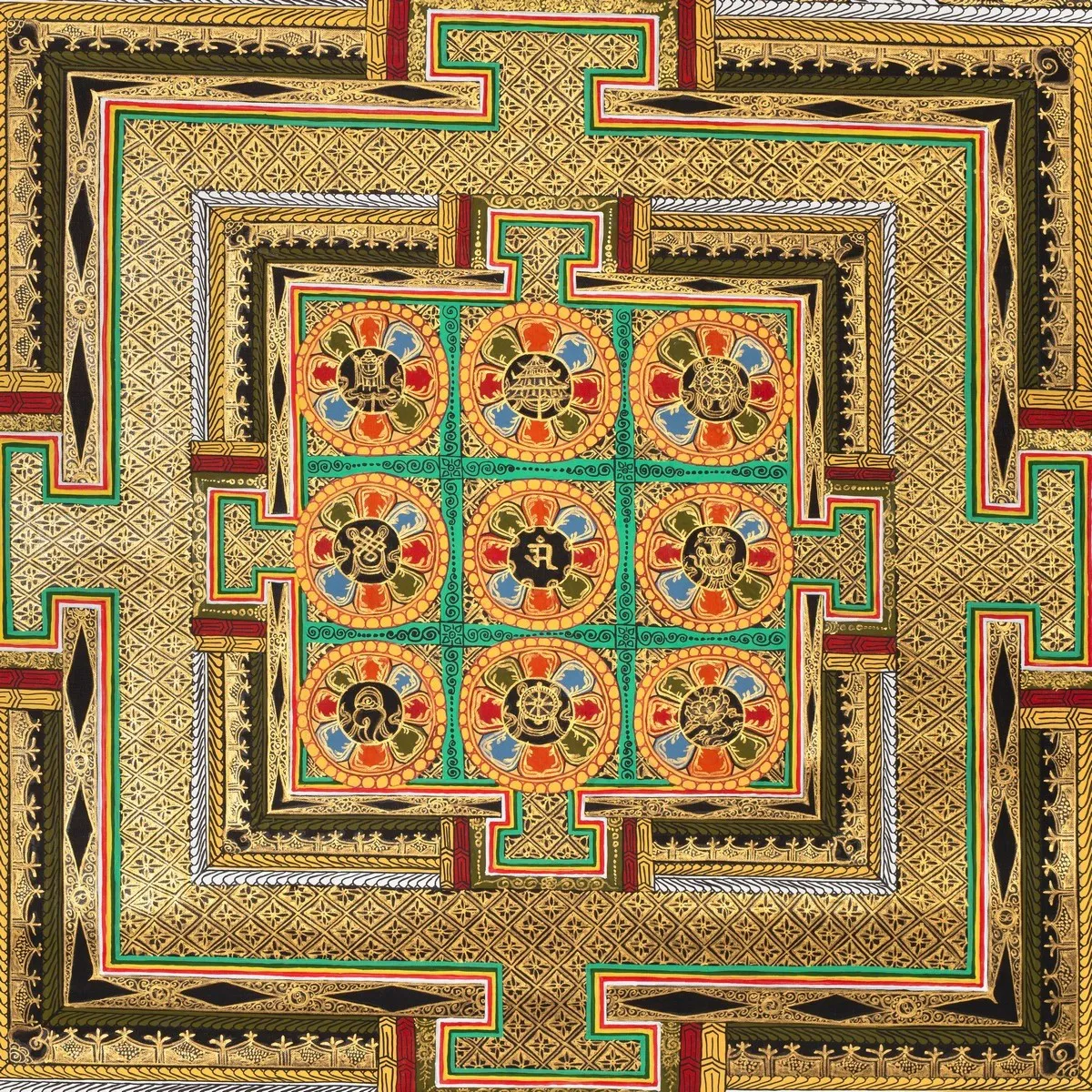 From Buddhist Thangkas collection, Auspicious Mandala with 24 carat gold work (Brocadeless Thangka) (Pure 24 Carat Gold,Gouache and acrylic colors on Cotton Canvas)