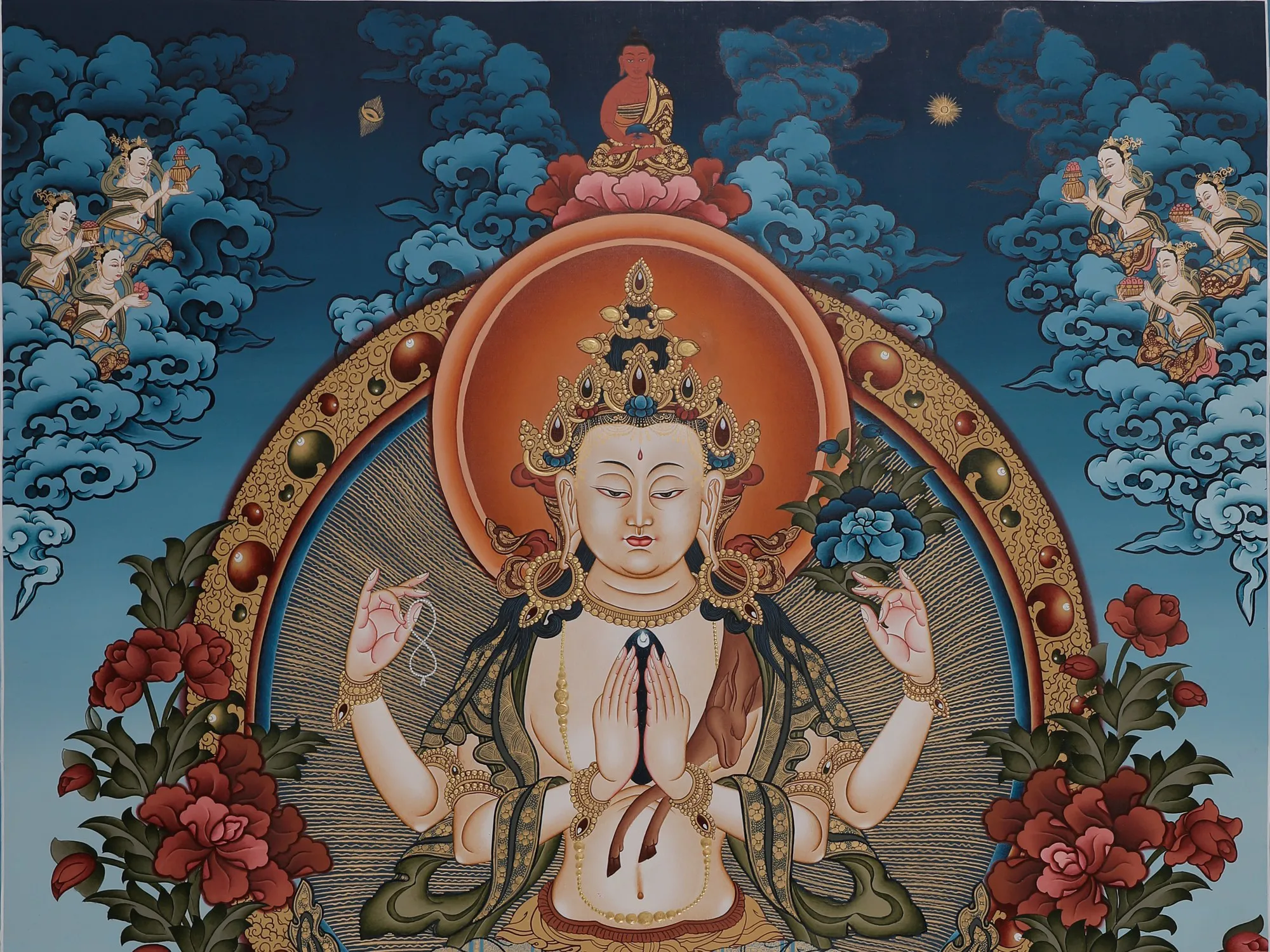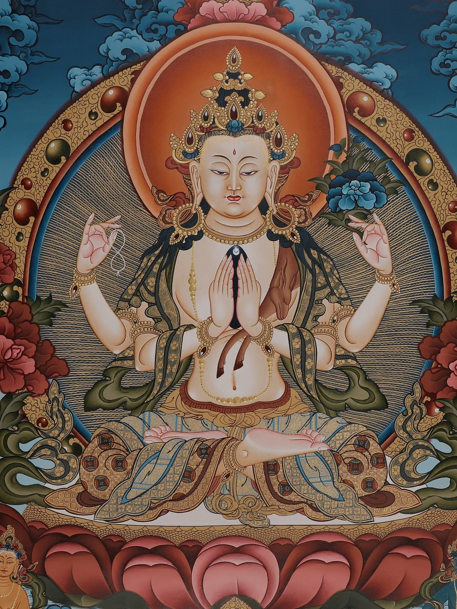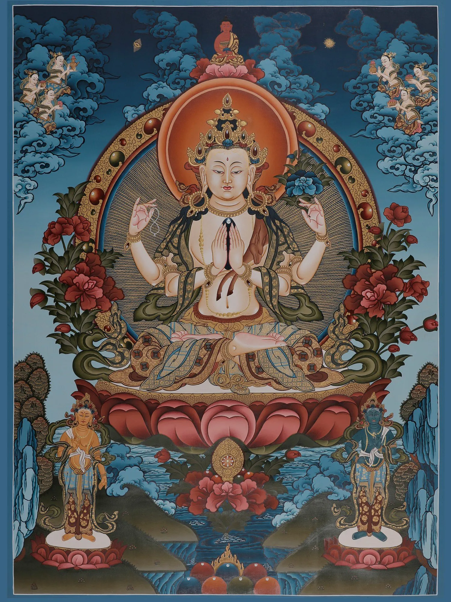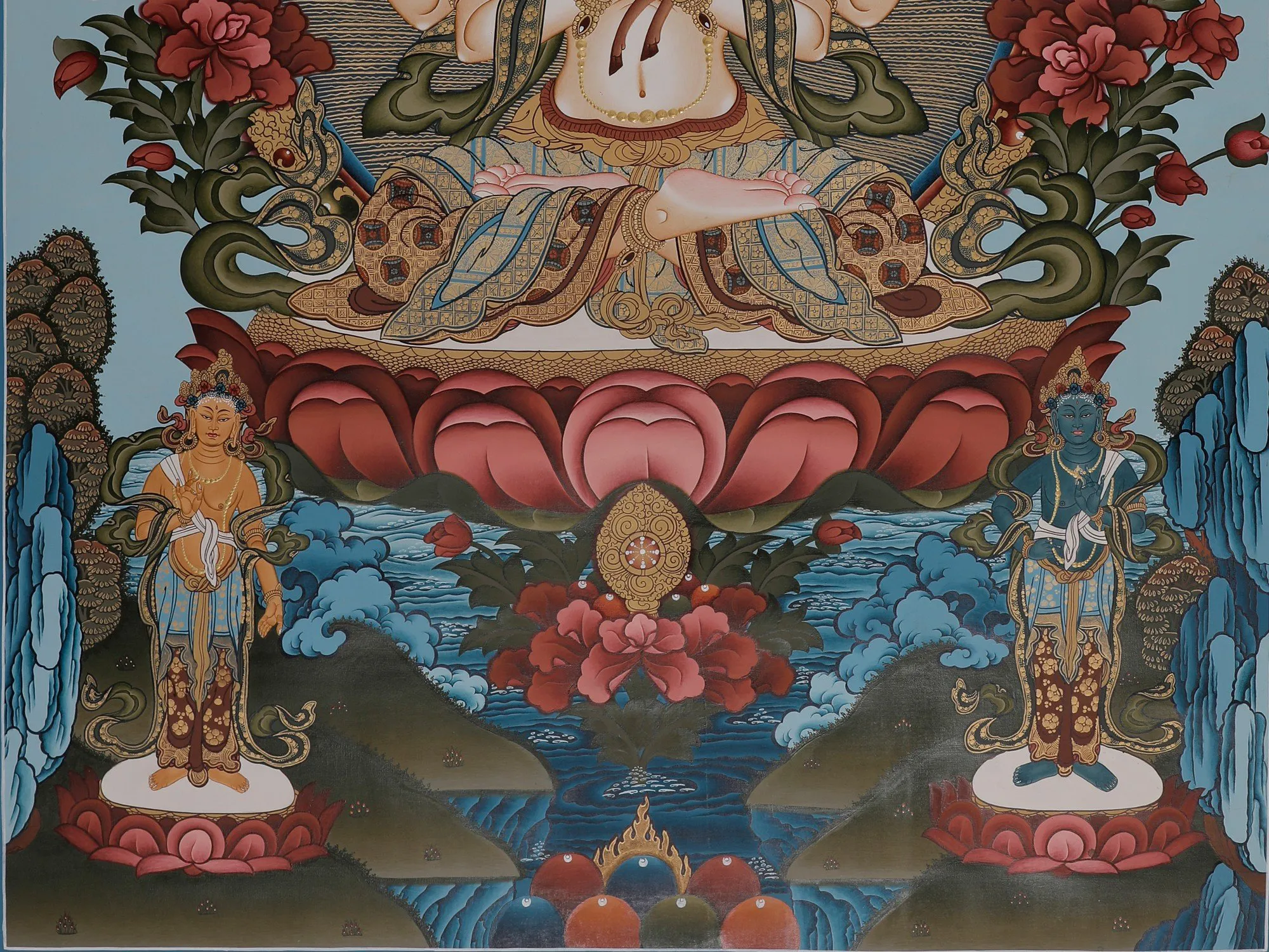 TheBrocadeless Thangkapainting of Lord Kharchari is a captivating masterpiece that portrays thedivine essence of this revered deity. Executed with remarkable precision andskill, the painting depicts Lord Kharchari, also known as the Six-ArmedMahakala, in all his awe-inspiring glory. It is Crafted on a vibrant canvaswithout the use of brocade, the painting showcases intricate details andvibrant colors, bringing the deity to life. Lord Kharchari is portrayed withsix arms, each holding symbolic attributes, representing his power and abilityto protect and liberate beings from suffering. The absence of brocade allowsfor a more intimate connection with the deity, inviting devotees to immersethemselves in his divine presence and seek solace and guidance.