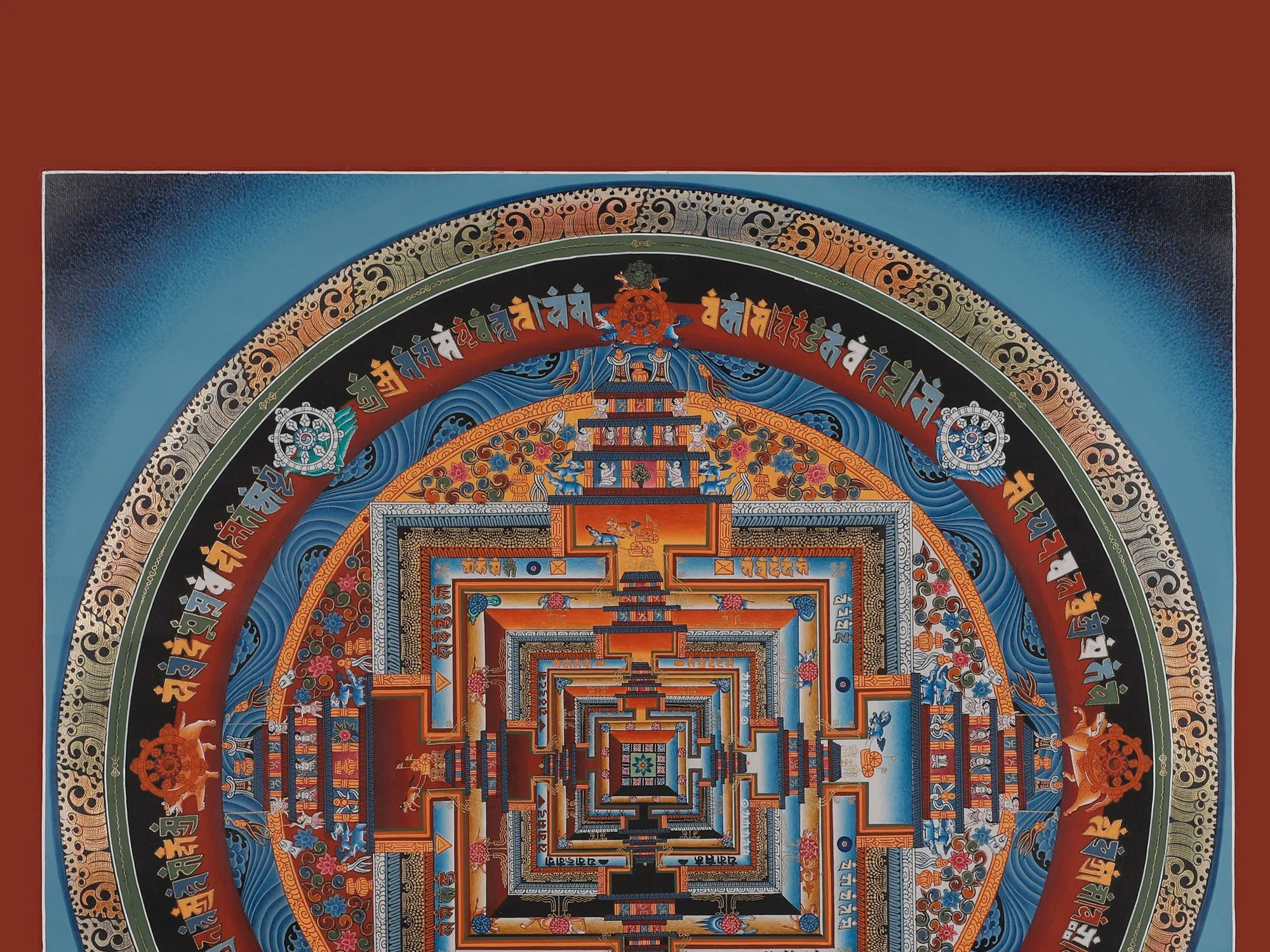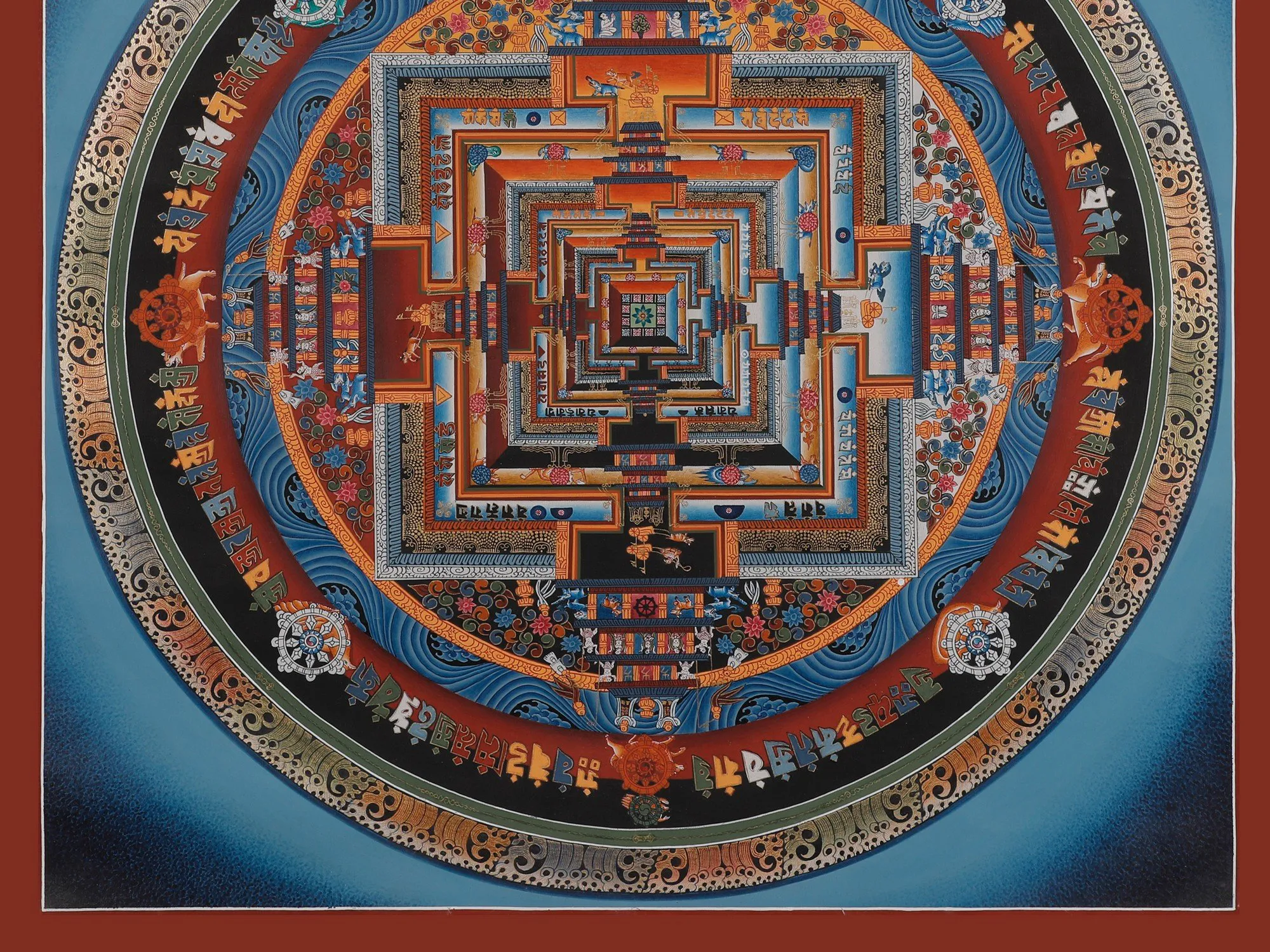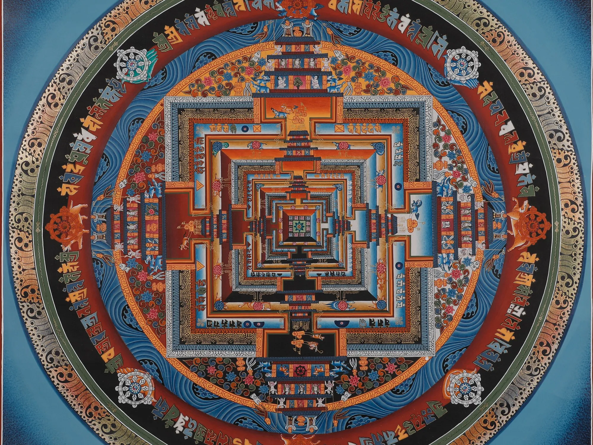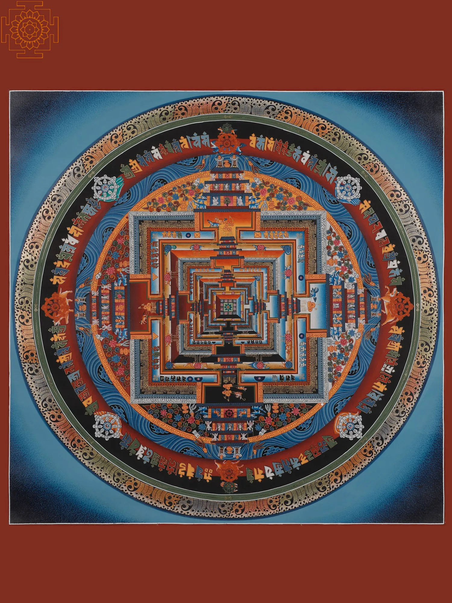 The Kalachakra Mandala isa highly intricate and symbolic diagram utilized in Tibetan Buddhism,representing the universe's interplay of time and space. "Kalachakra"means "Wheel of Time" in Sanskrit, and it is associated with theKalachakra Tantra, a profound Buddhist text. It offers methods for achievingenlightenment that Gautama Buddha himself taught in India. The art symbolizestime and impermanence and appears as a visual aid for meditation and spiritualpractices. Moreover,it purifies negative karma, offering healing and protection. The Buddhist Thangkas paintingincorporates elements of pure 24-carat gold and acrylic paint, creating avisually stunning representation of profound Buddhist teachings in a harmoniousand transformative manner.