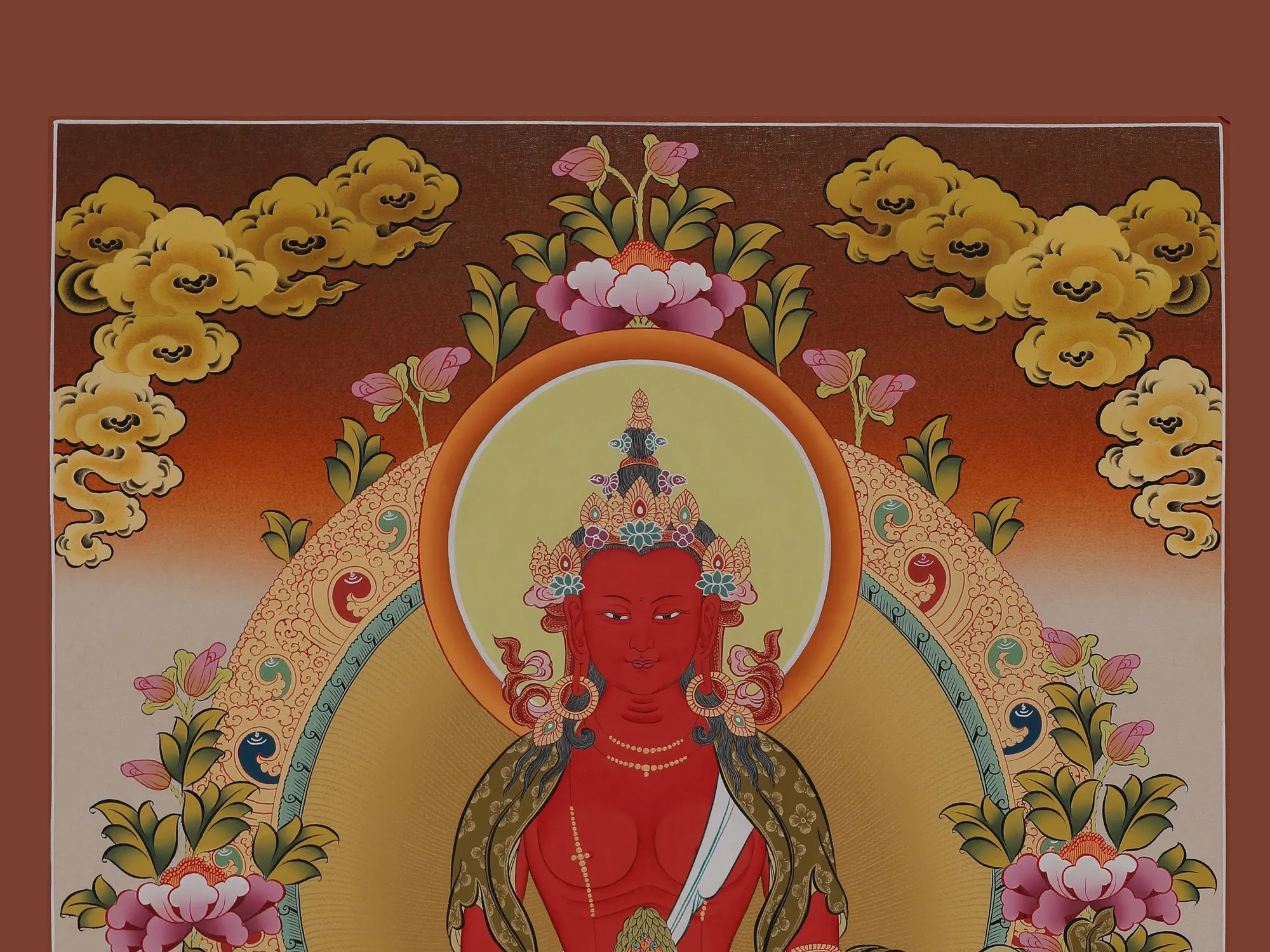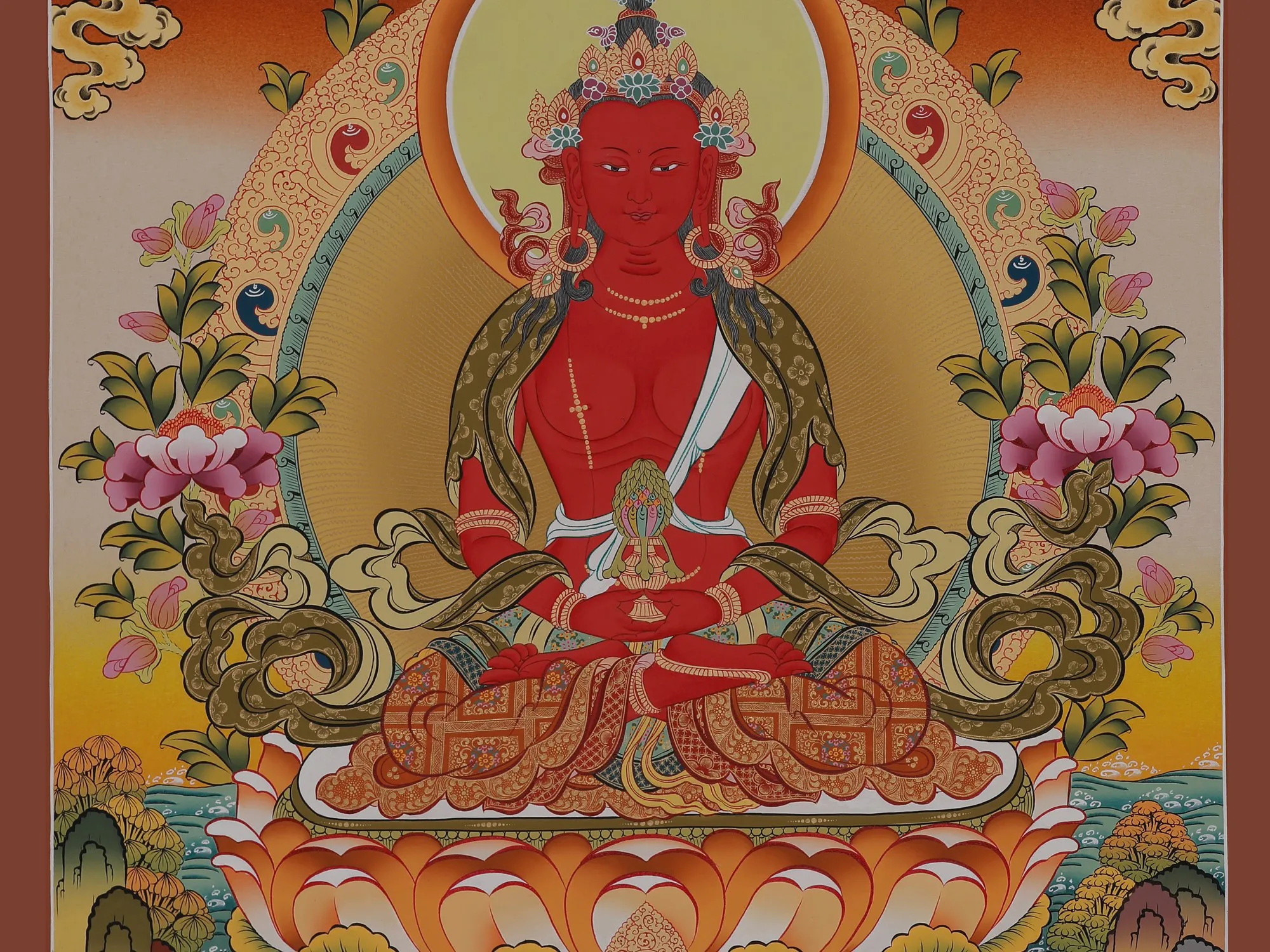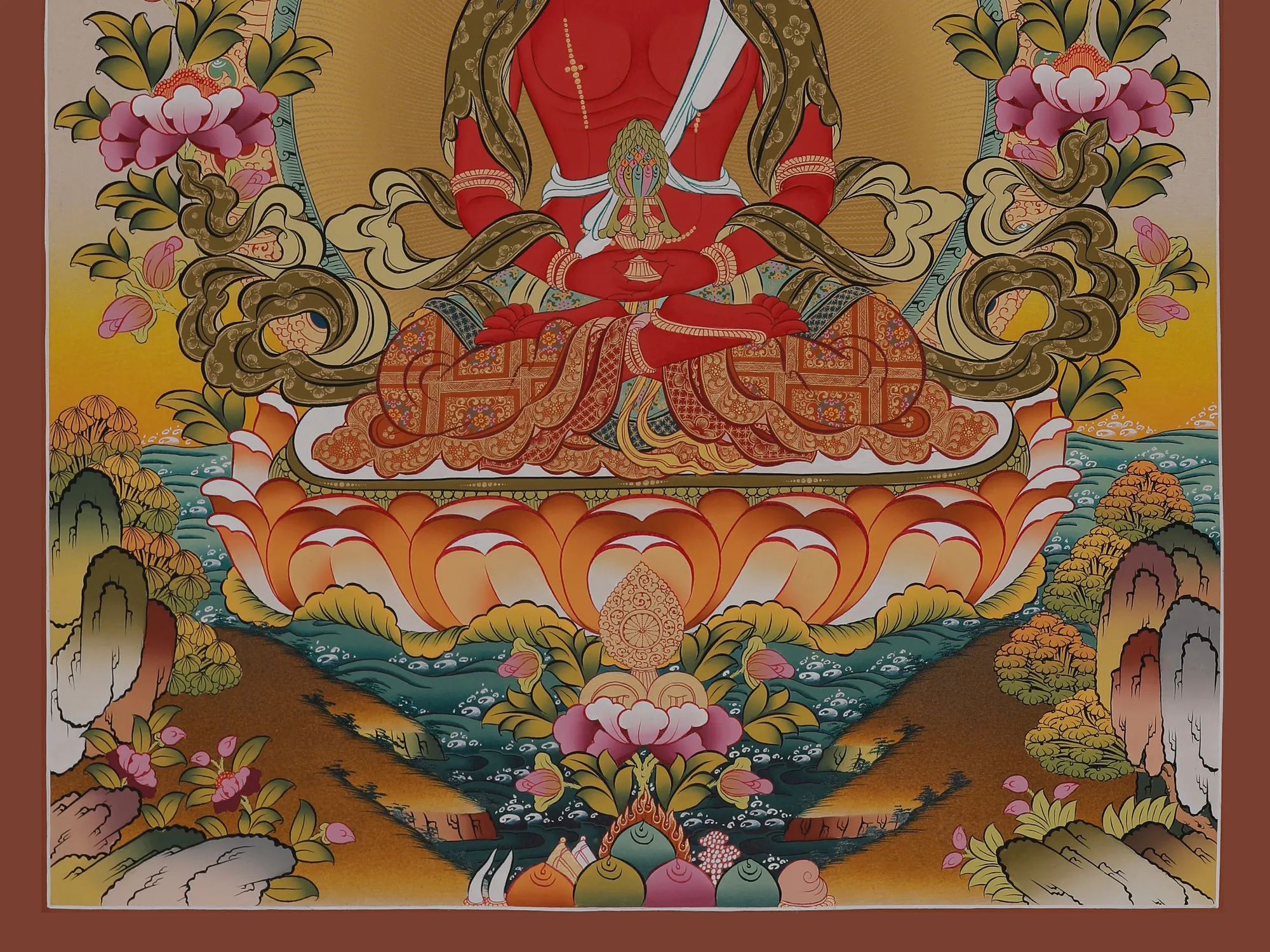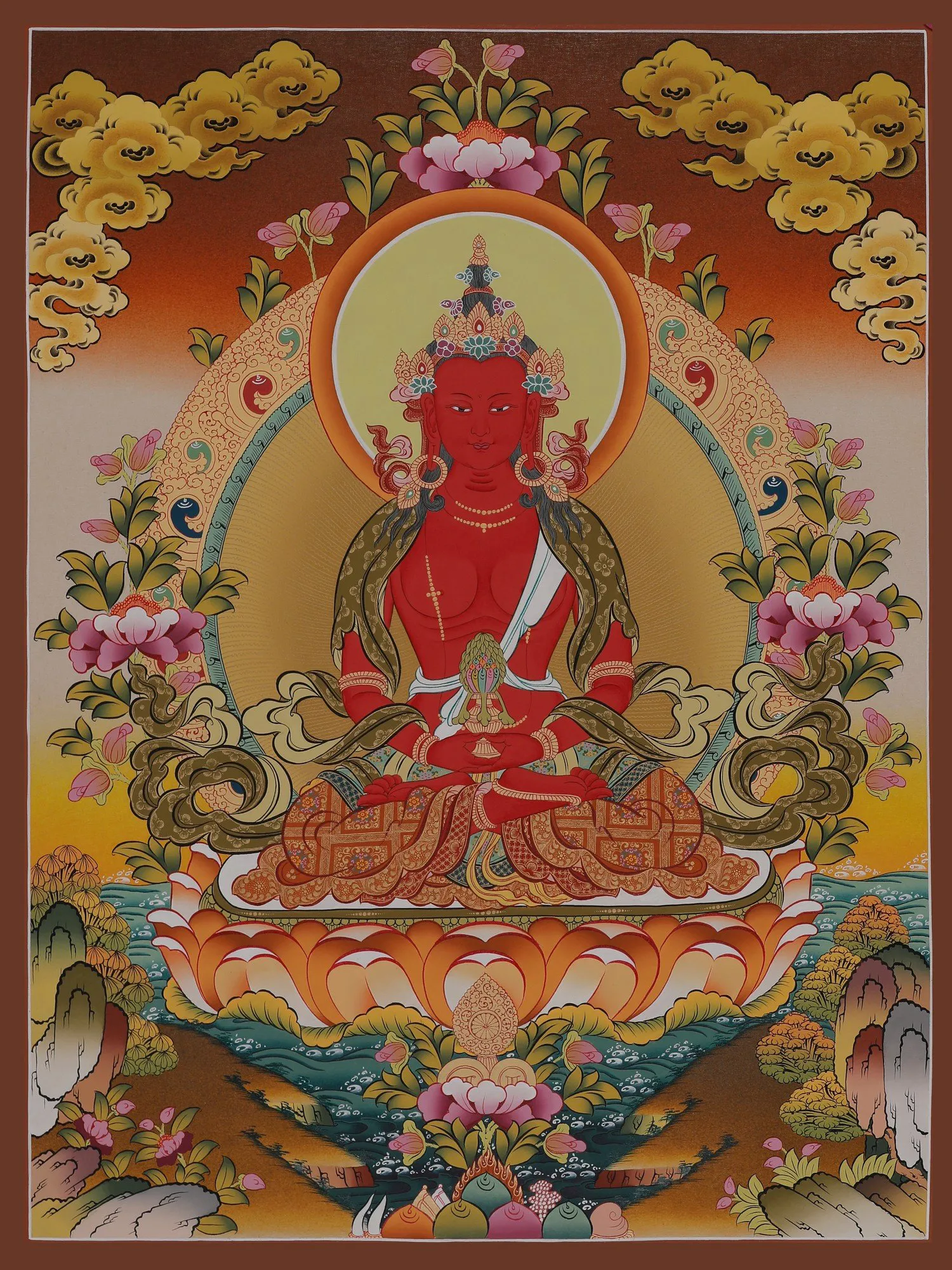 He who knows Samsara, Buddha who’s the enlightened one is painted with the astonishing technique of Thangka here. In the base of yellow tones, Buddha is seated in the center over his lotus throne, that’s bejeweled on the head. A Halo behind his face highlights his divinity while he sits in the Dhyana mudra holding the vase of wisdom and higher thought. Buddha, who’s red represents fortune and virtue here, makes the intention of our karma kind and considerate.