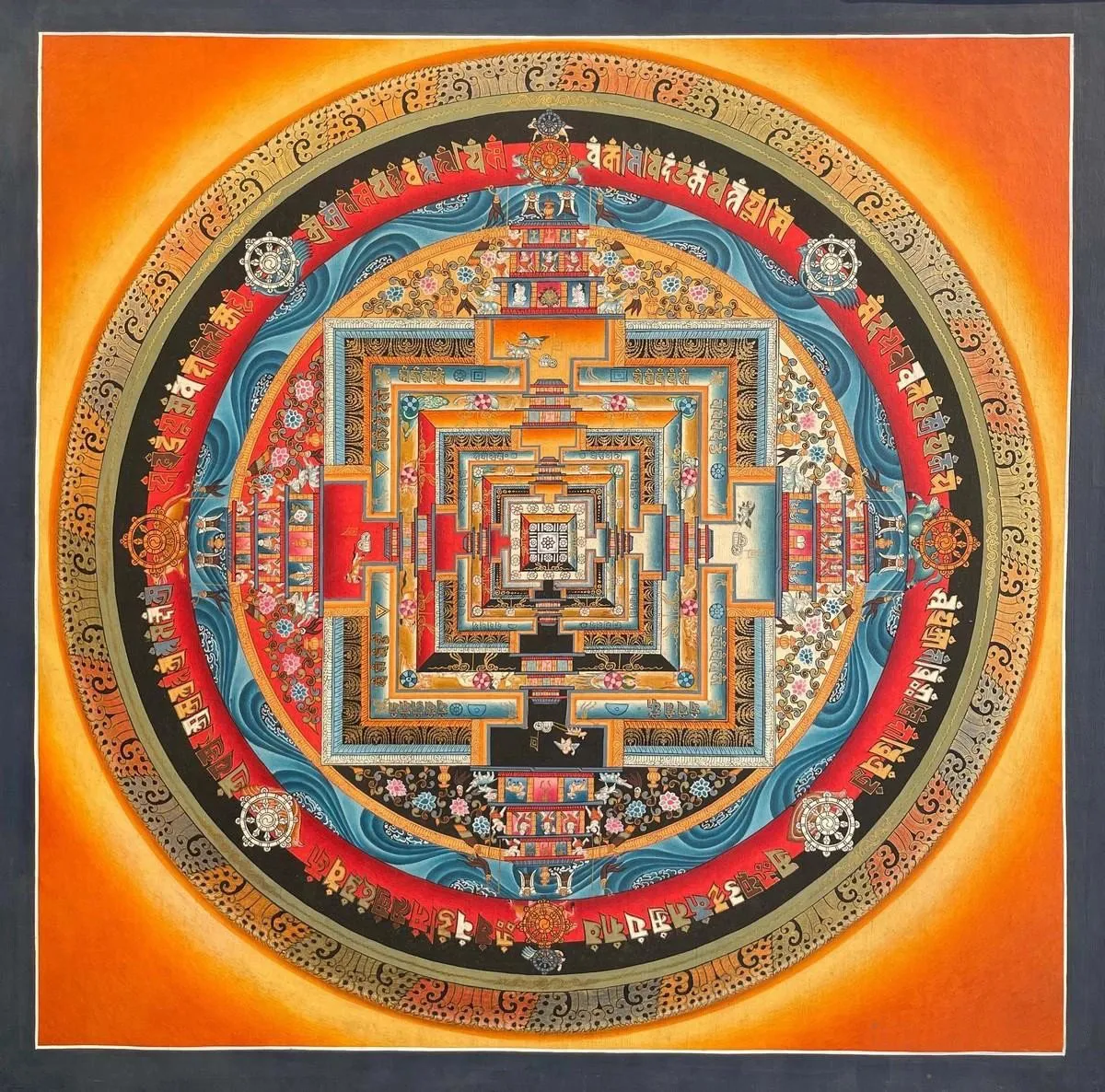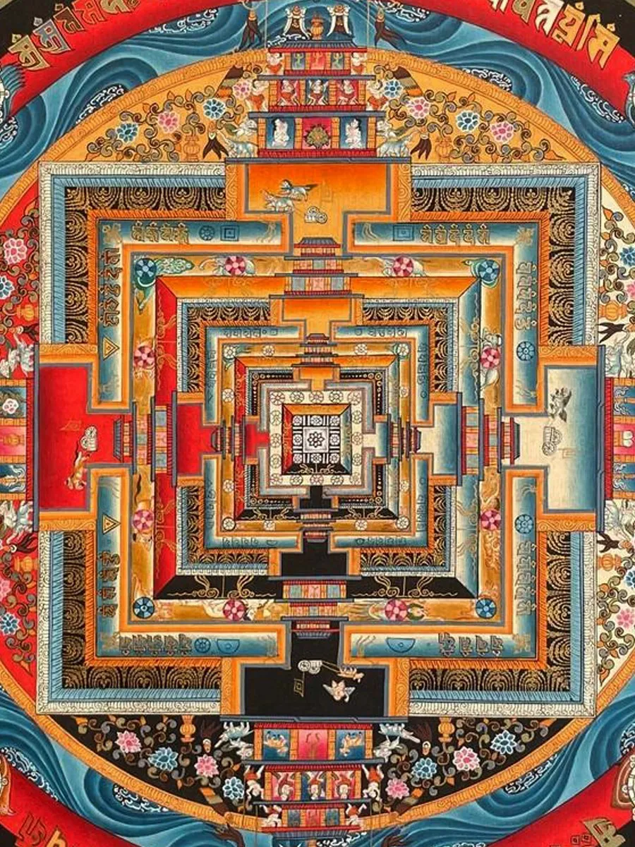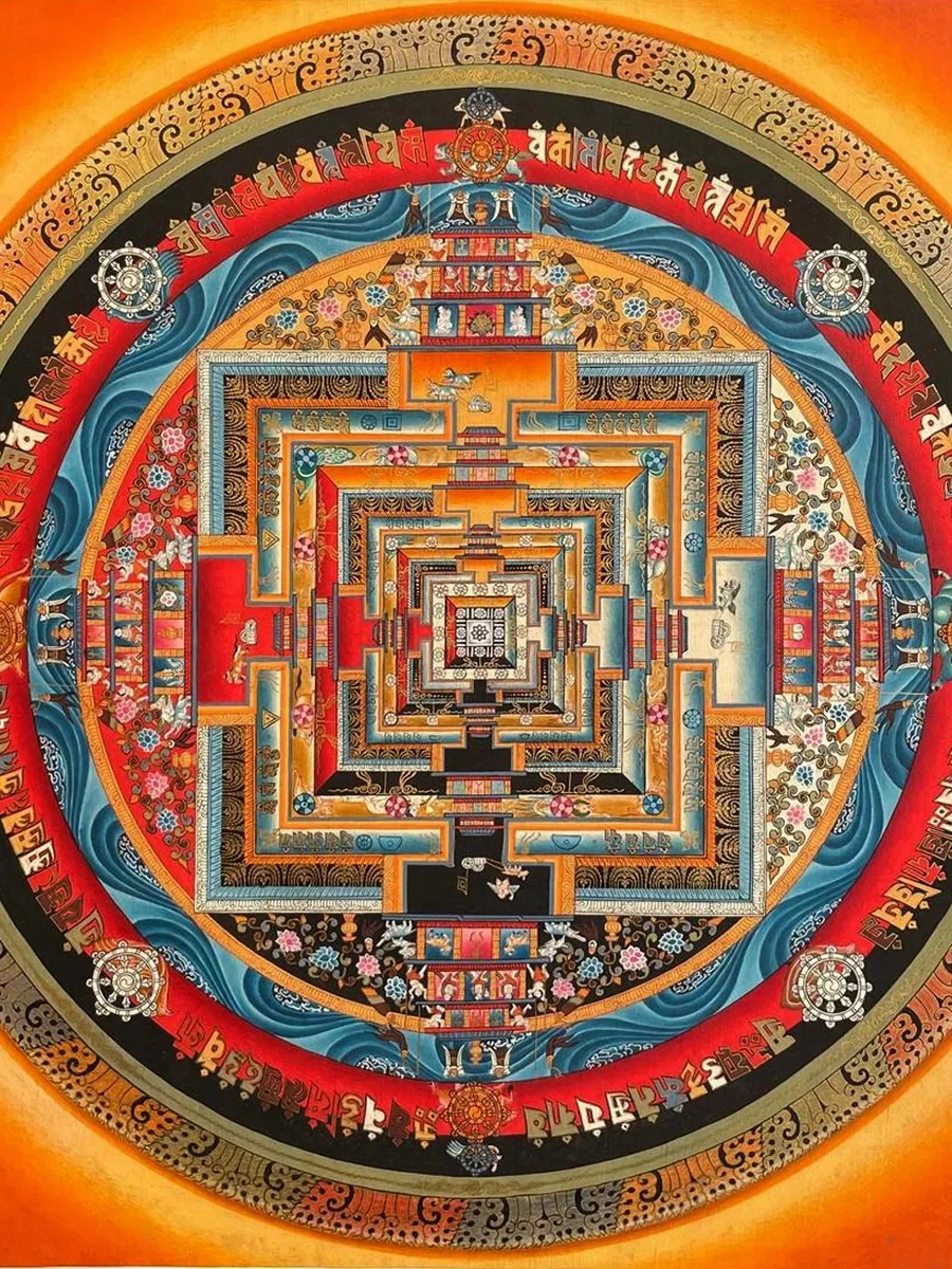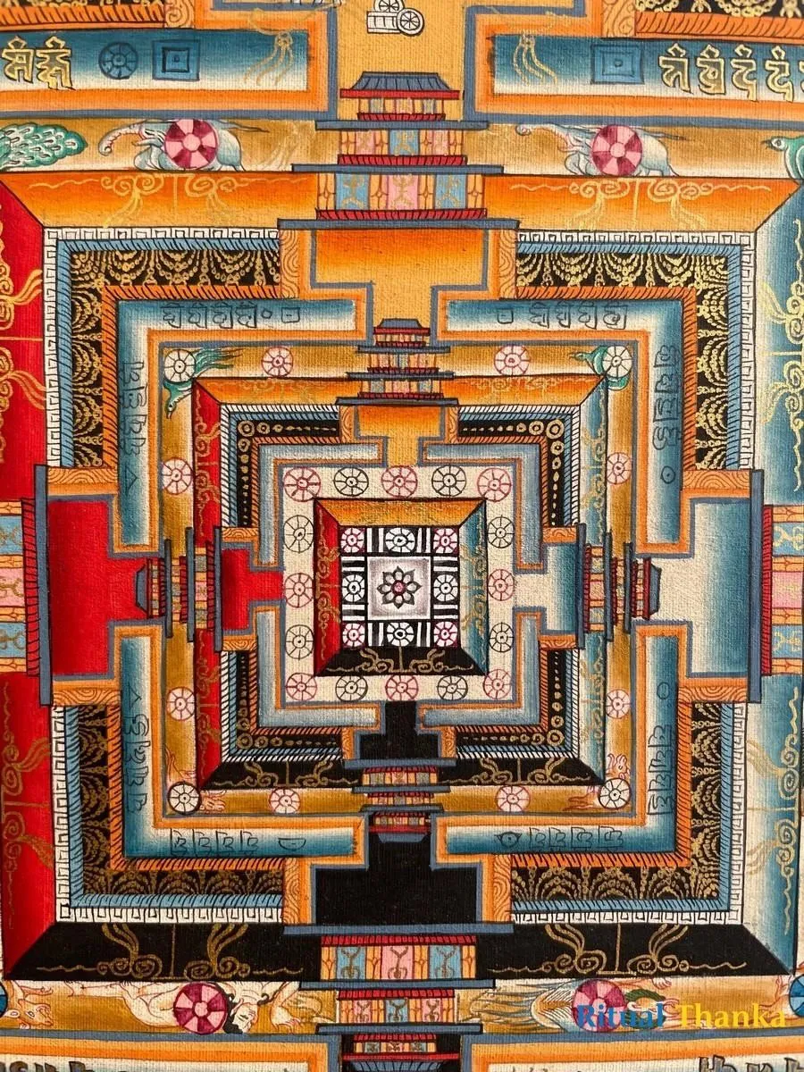 This KalachakraMandala Thangka features a meticulously detailed, circular design filled withvibrant colors and intricate symbols. At the center of the mandala, you’ll findthe deity Kalachakra, often depicted in a yab-yum (male-female) union with hisconsort Vishvamata, symbolizing the union of wisdom and compassion. Kalachakrais usually shown in a peaceful, blue form or a wrathful, red form, representingdifferent aspects of his enlightened nature.