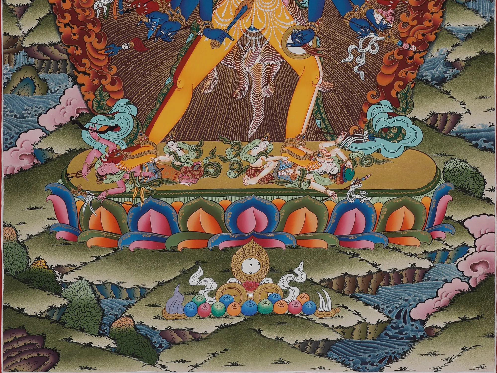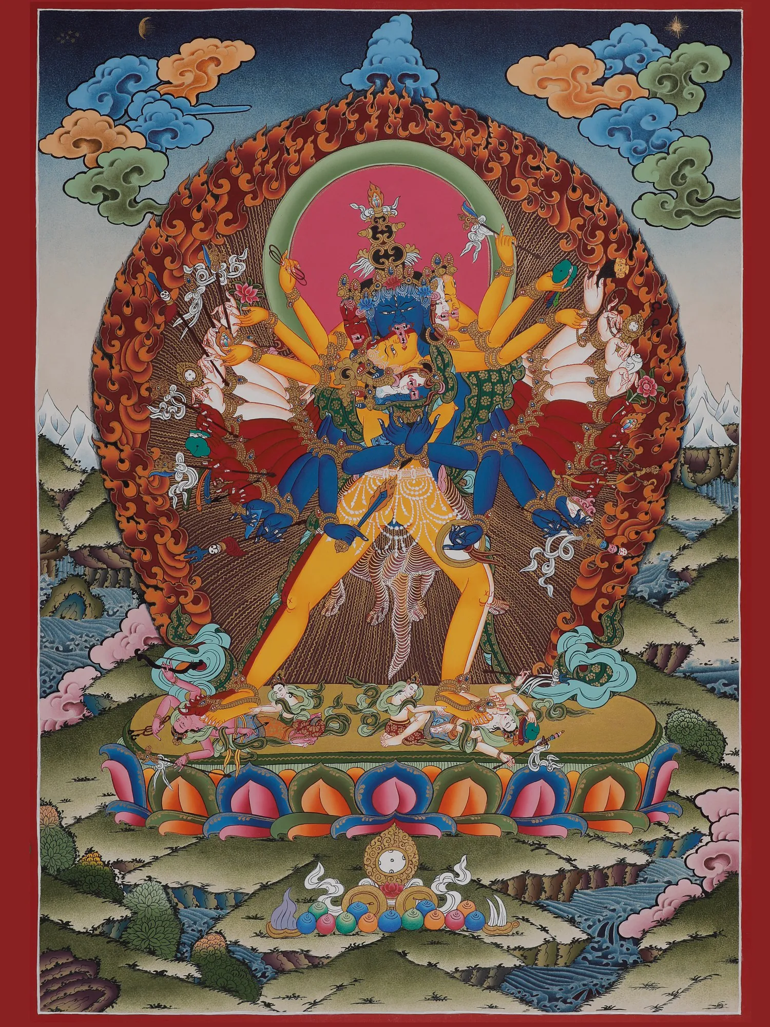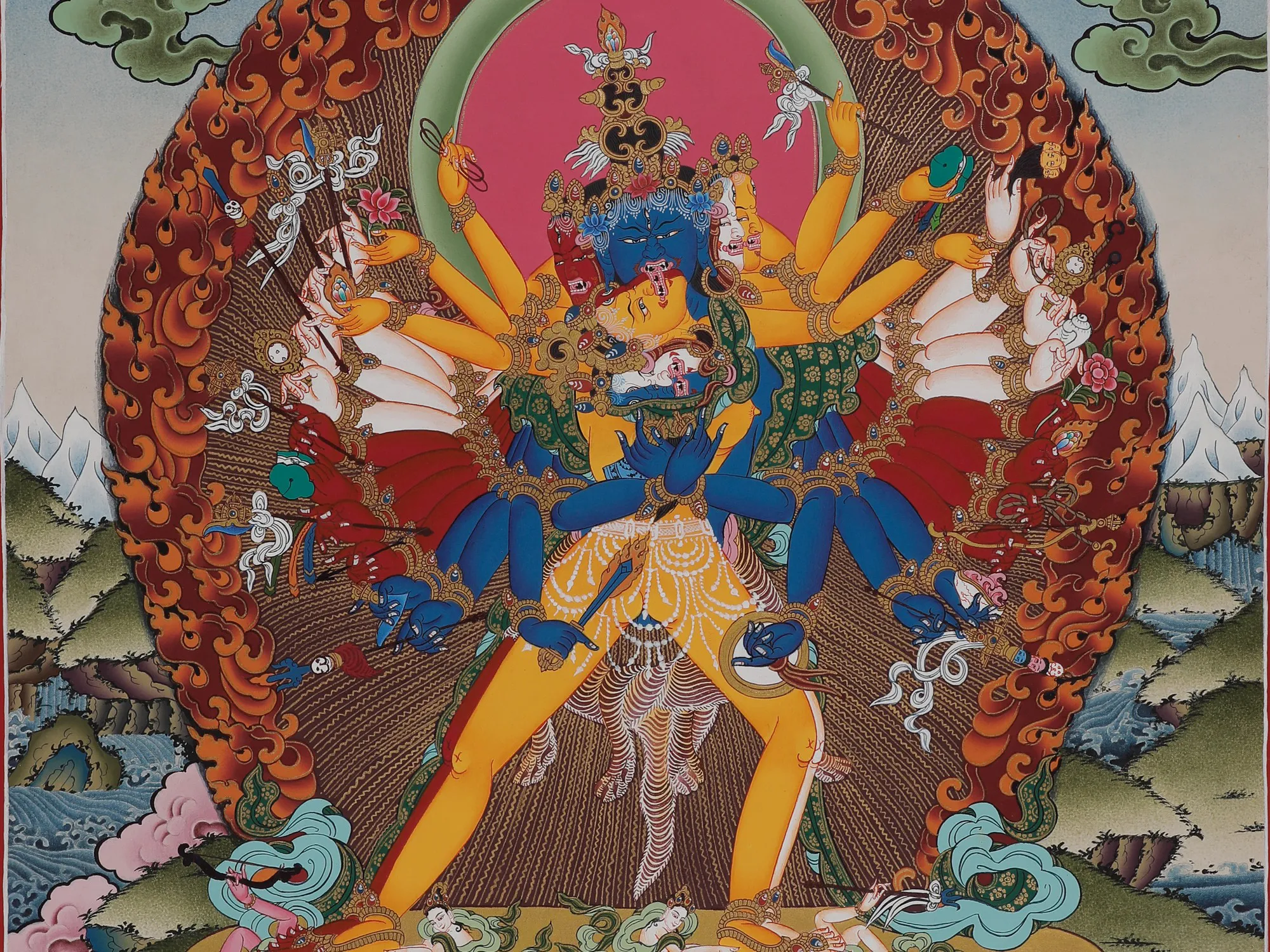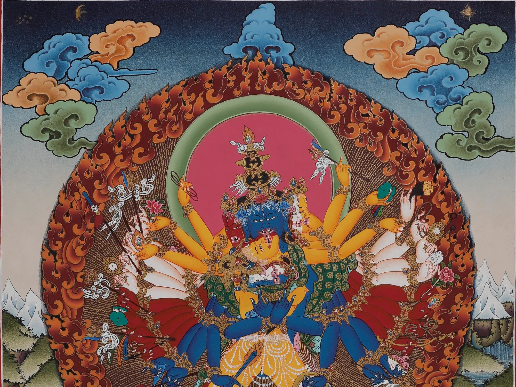 The Sanskrit term"kalachakra" means "wheel of time" or"time-cycle," and it is represented by an intricate mandala thatdepicts the cosmos and its dimensions. It is well known for its function infostering harmony and comprehension amongst many cultures and religions. Thegod has four faces: the center is angry black or blue, the right is lusty red,the left is serene white, and the back of the blackhead is meditative yellow.His twenty-four hands, eight of which are yellow, eight of which are red, andeight of which are blue, each containing a distinct symbol or object. His bodyis blue, while his right leg is crimson and his left leg is white, as he dancesin the Alidha stance. He is seen as being angry since he is shown sitting onthe crimson bodies of Rudra and Ananga.
