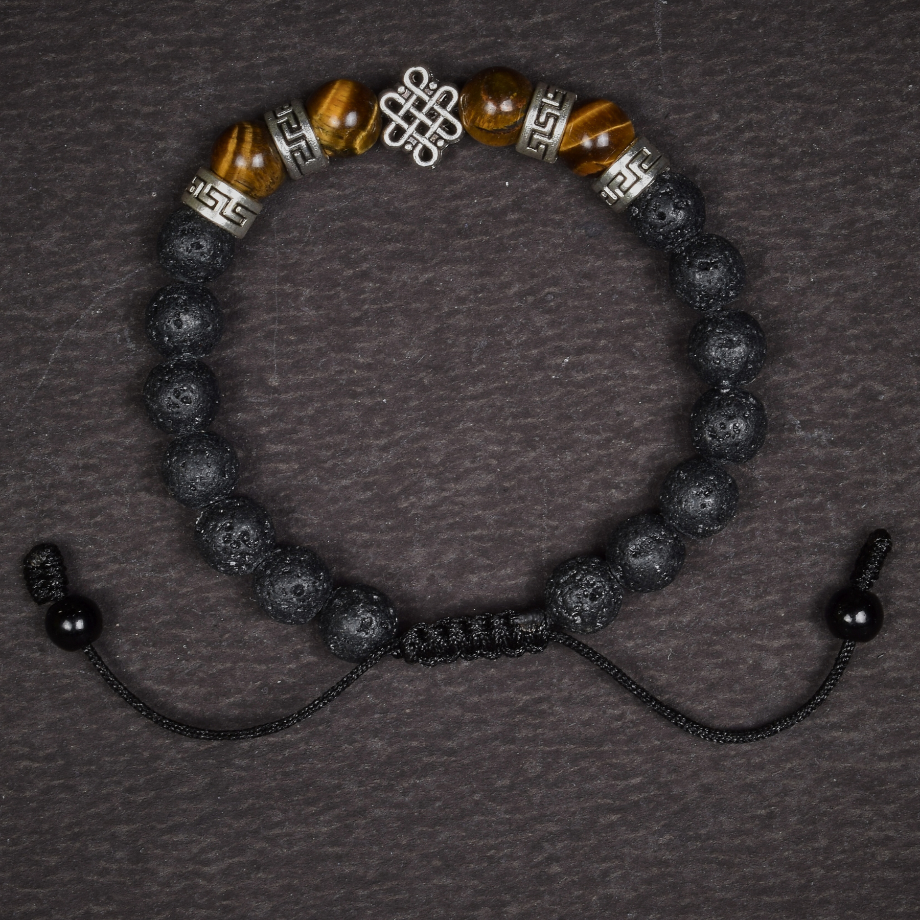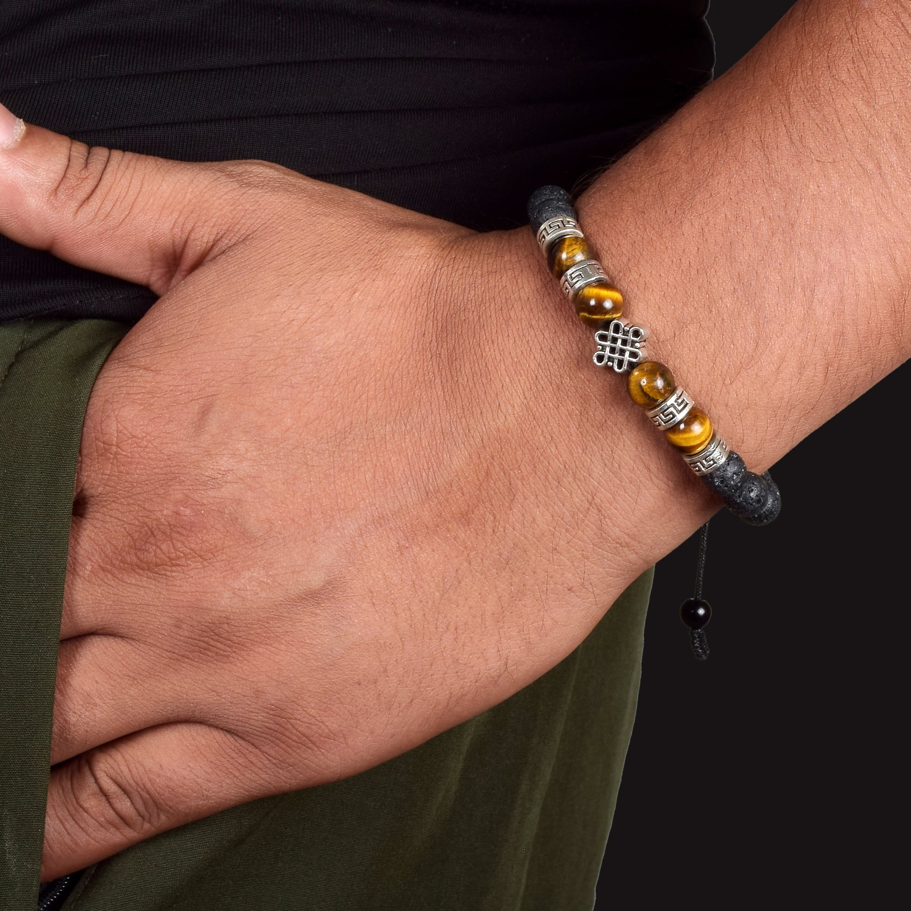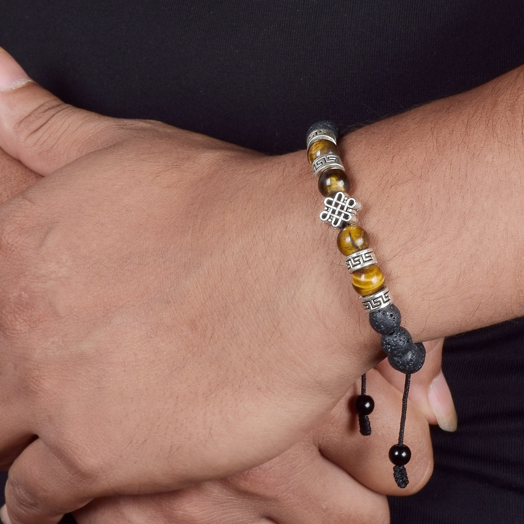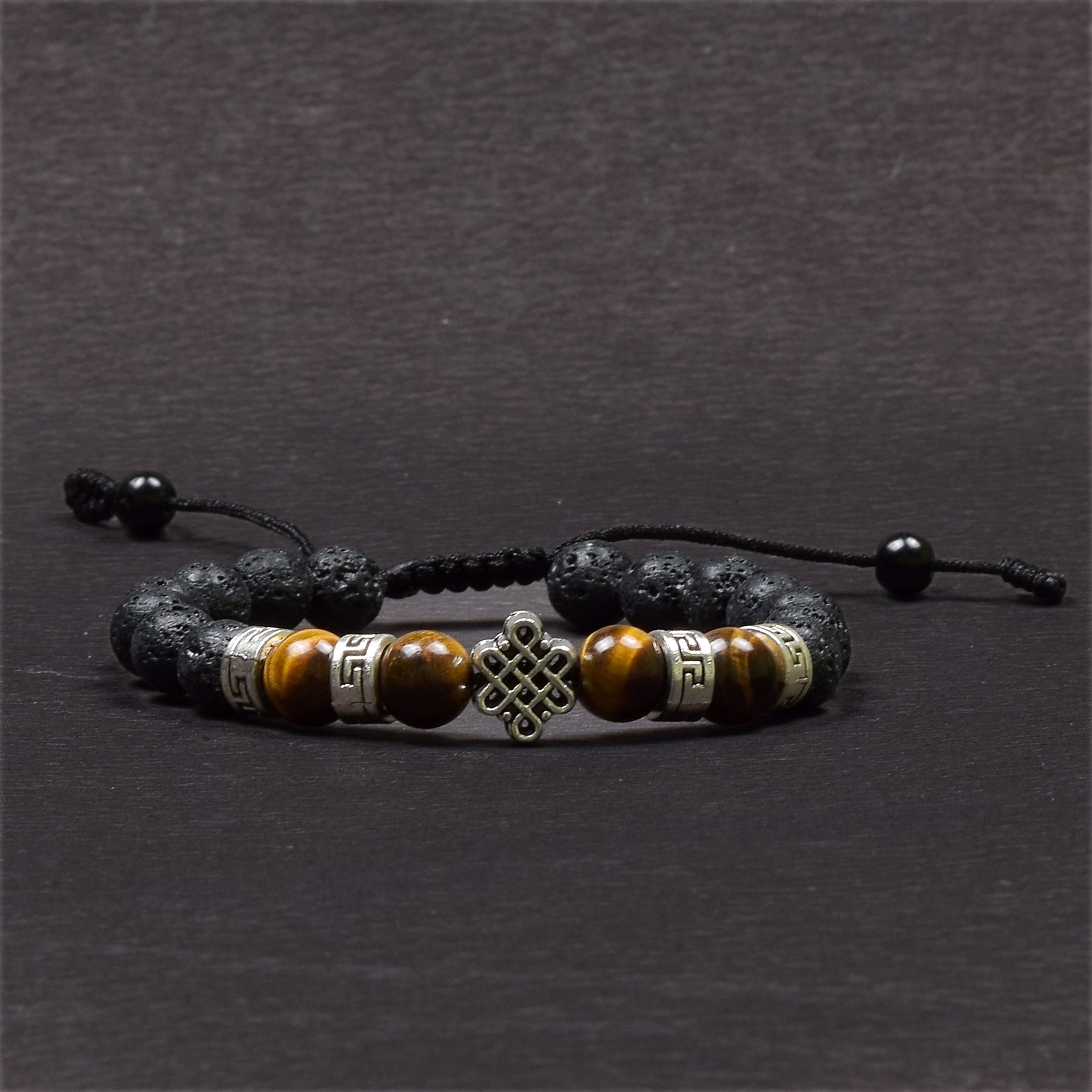 The Endless Knot, one of Buddhism’s Eight Auspicious Symbols, represents the flow of time, the union of wisdom and compassion, and the interconnection of all beings. Lava Stone, born from volcanic fire, carries grounding and calming energy, helping to release tension and restore emotional balance. Tiger Eye, known for its golden-brown shimmer, supports courage, clarity, and inner strength.