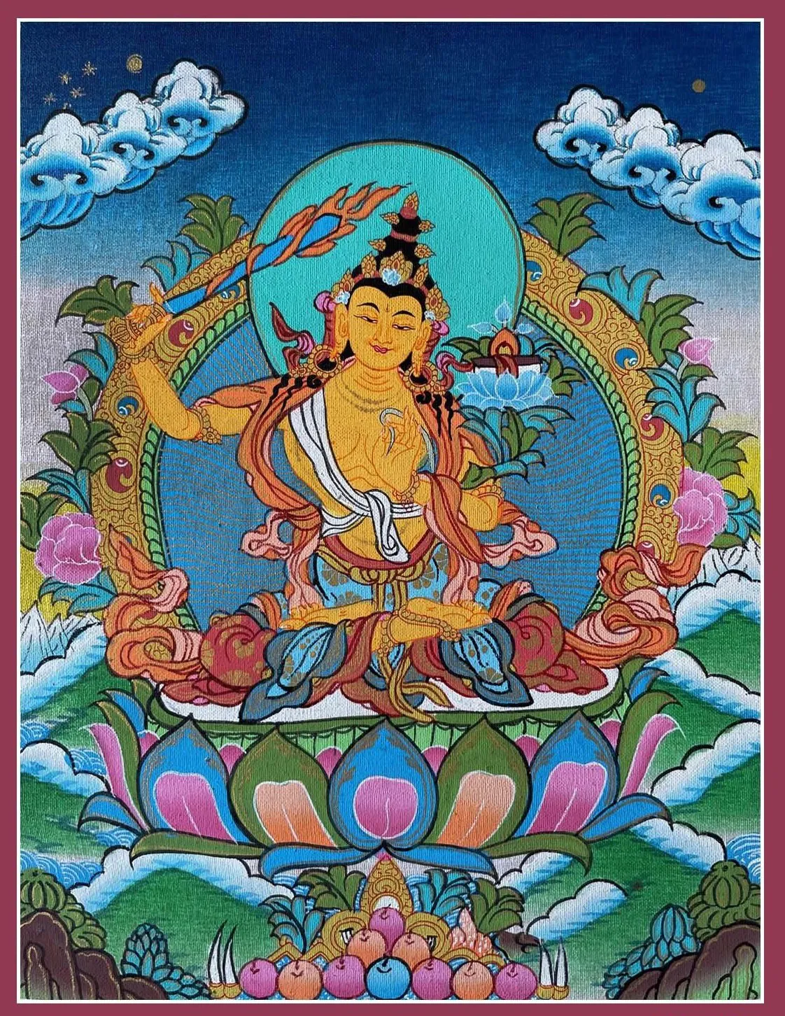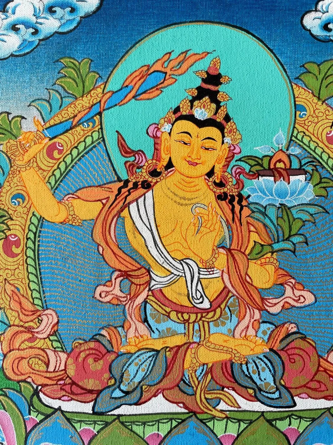 Manjushri, aprominent figure in Mahayana Buddhism, is reveredas the Bodhisattva of Wisdom. Often depicted wielding a flaming sword that cutsthrough ignorance and a scripture symbolizing transcendental knowledge,Manjushri represents the embodiment of enlightened wisdom. Adorned with royalattire, Manjushri is depicted in a youthful and graceful form, seated on alotus throne. The wisdom he embodies surpasses mundane understanding,emphasizing the importance of discernment and insight on the spiritual path.