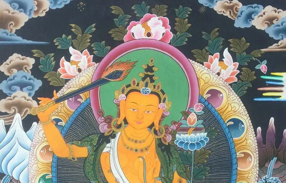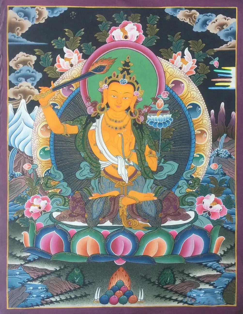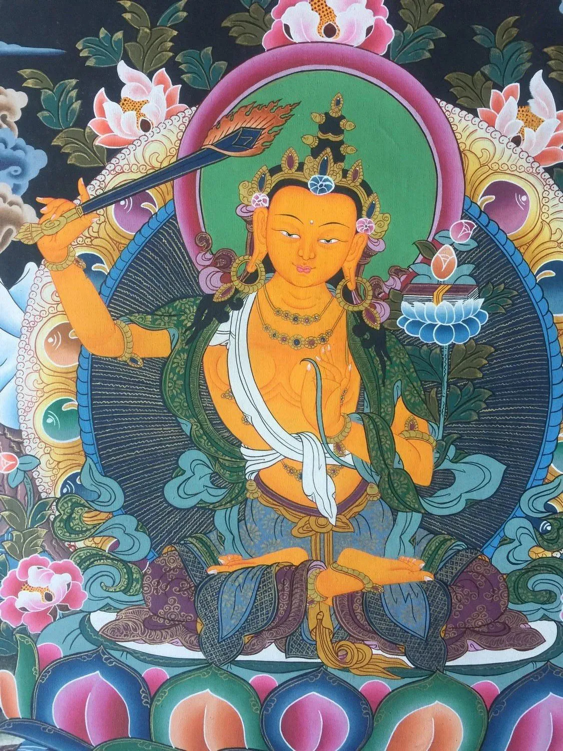 Manjushri plays a central role in Mahayana Buddhist teachings, representing the wisdom that leads to enlightenment. He is revered as the embodiment of insight, clarity, and discernment, essential qualities for navigating the path to liberation from suffering.