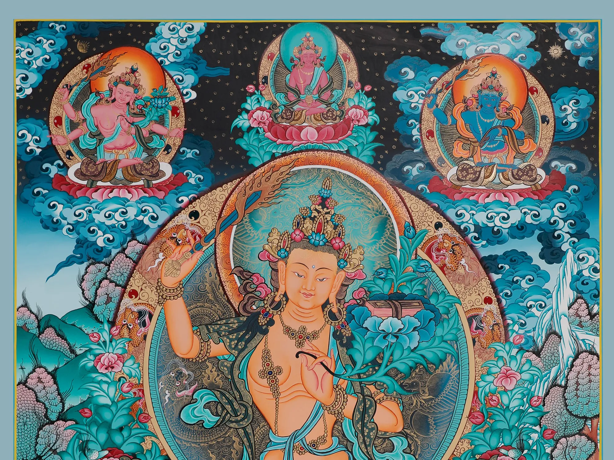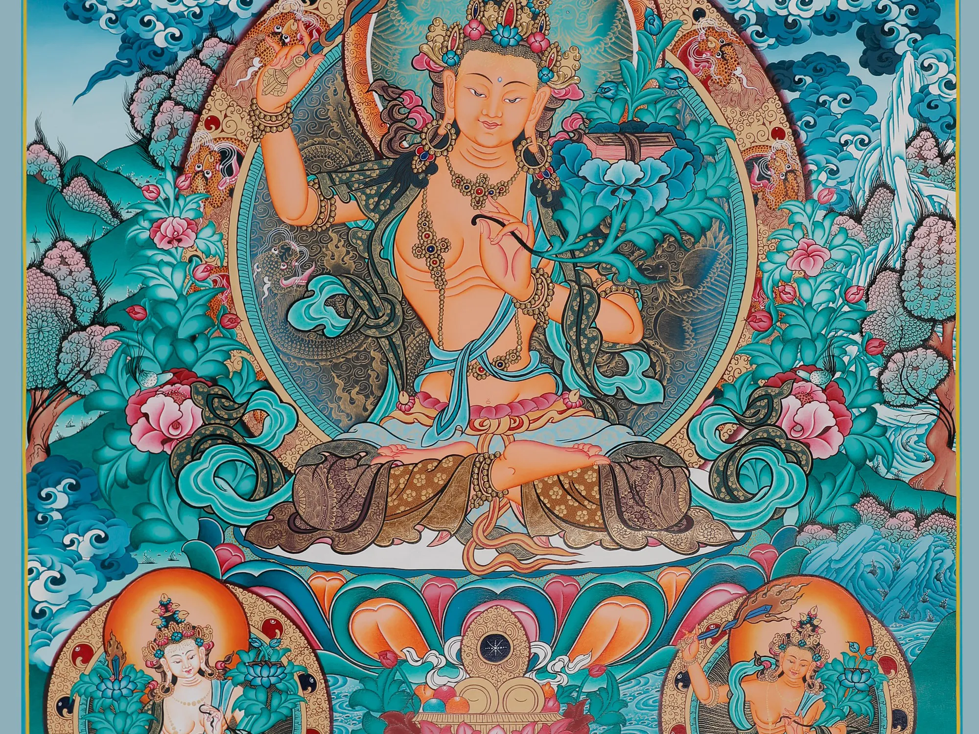 Under whose flaming sword, wisdom is perfected and whose Prajnaparamitasutra contains the finest attainment of spiritual truth in the gift of ablooming Padma - Manjushri,one of the most important figures in Mahayana Buddhism is also calledManjughosha “Soft Voice”. In chants of the mantra “oṃ arapacana dhīḥ” arrivesto you in his avatar of youth and beauty as finely presented in this stunningcanvas of Thangkaart in a base of blue.