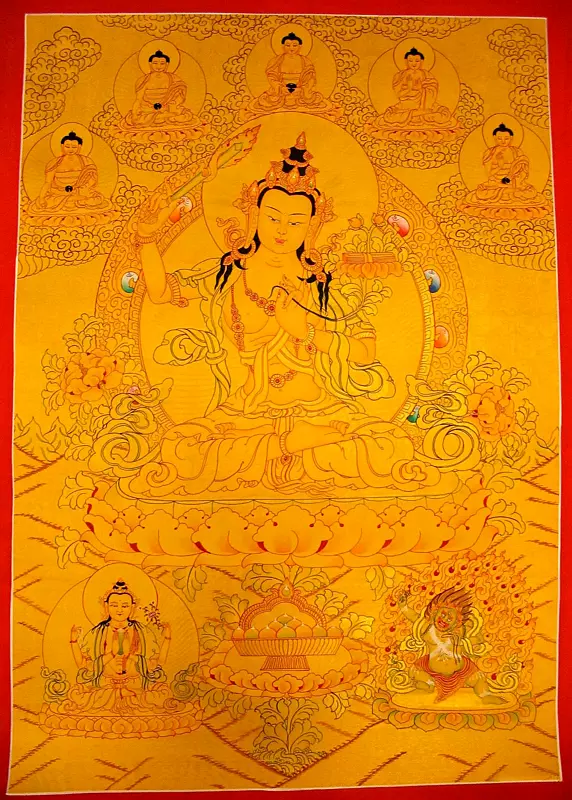 A simplistic, almost monotone brocadeless thangka. On a fabric-based canvas of superior cotton fabric, the figure of the seated Bodhisattva Manjushri has been etched in acrylic gouache pigments. His legs are gathered in padmasana. In His left hand is a magical-stemmed lotus, within the belly of which rests a pothi (scripture). With the right hand, He raises a sword high above His head.