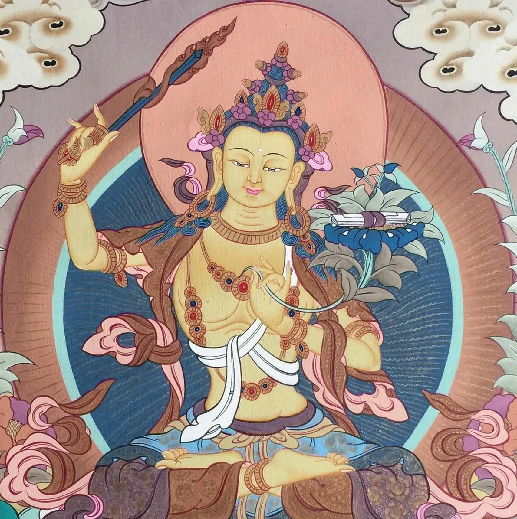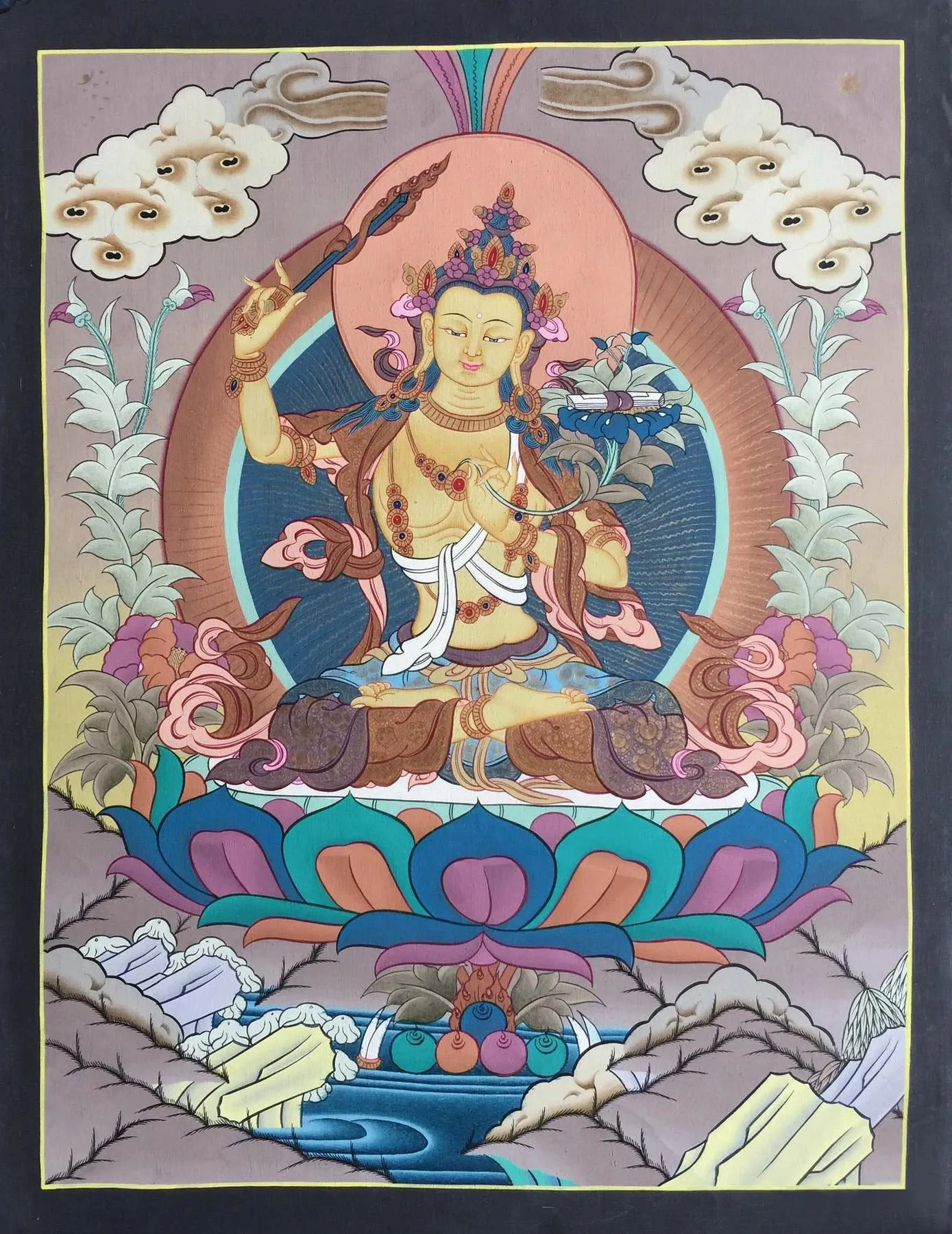 Manjushri, the possessor of ultimate wisdom, is the embodiment of enlightenment's transcendental wisdom. The Sanskrit meaning of the name Manjushri is "gentle glory" or "sweet splendor." He is frequently portrayed as a young man clutching a lotus blossom in his left hand to symbolize purity and enlightenment and brandishing a fiery sword in his right, signifying wisdom's ability to sever ignorance.