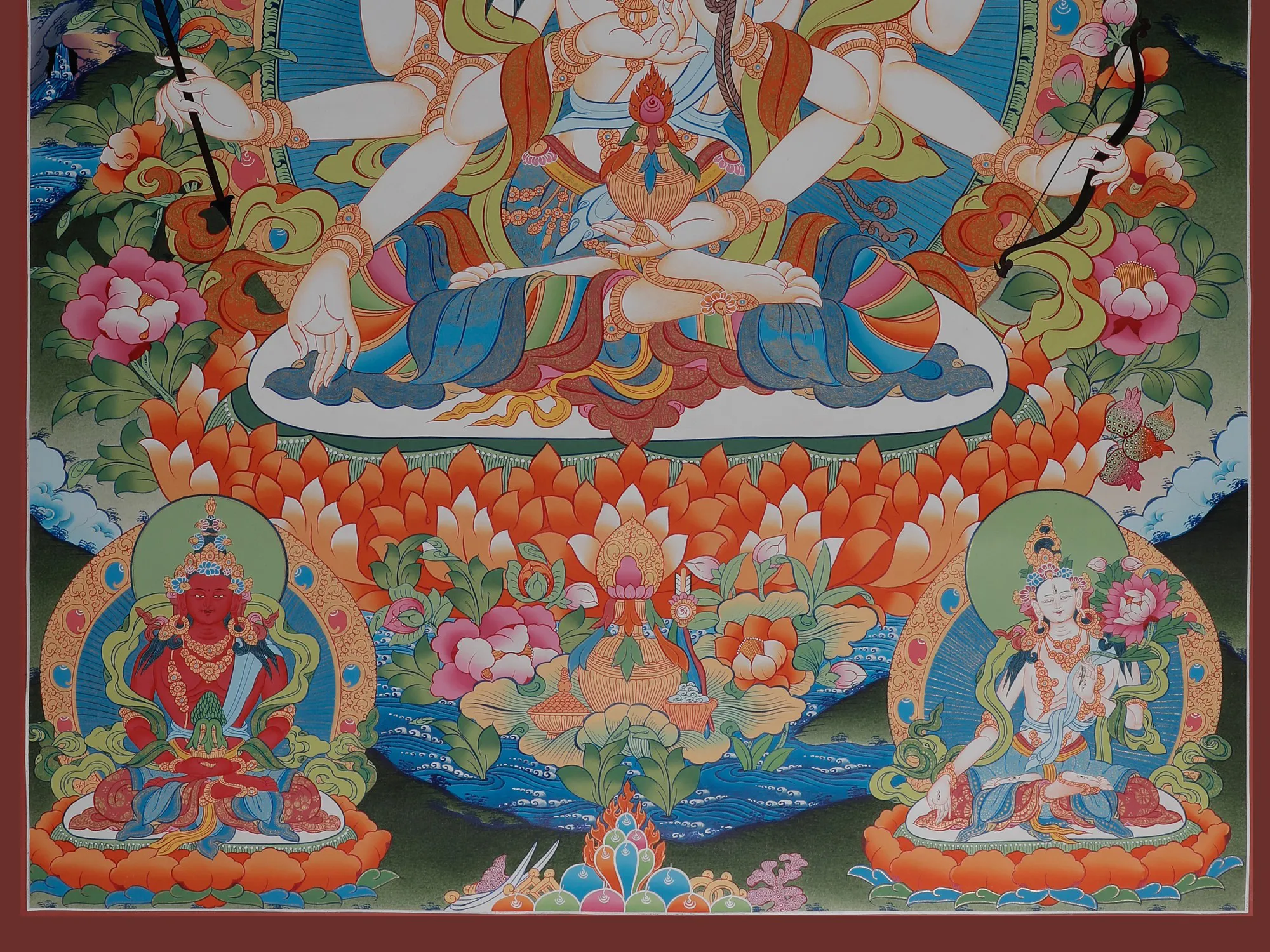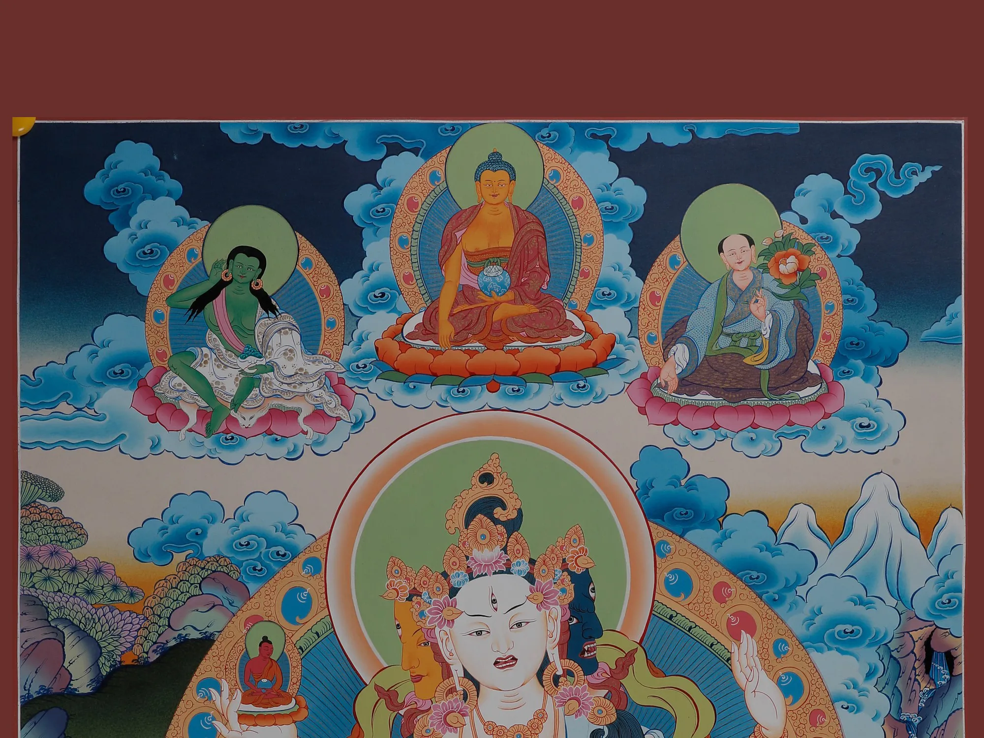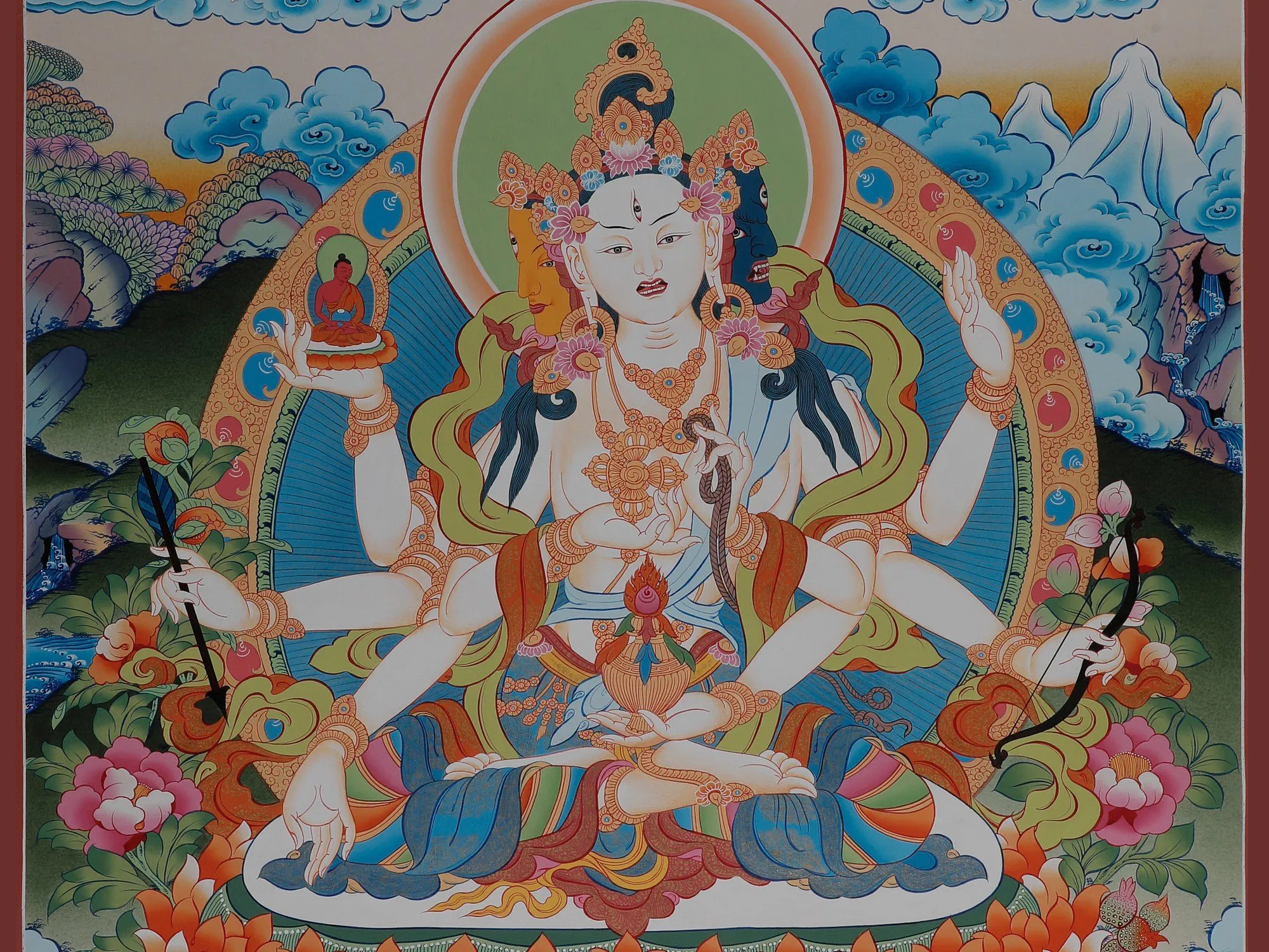 The yellow face represents her ability to provide longevity, while the blue face represents her prowess in vanquishing monsters. The third eye on her forehead stands for her desire, empathy, and ability to see all suffering. Her nine eyes represent her accomplishment of the nine degrees of enlightenment as well as her capacity to guide us toward liberation.