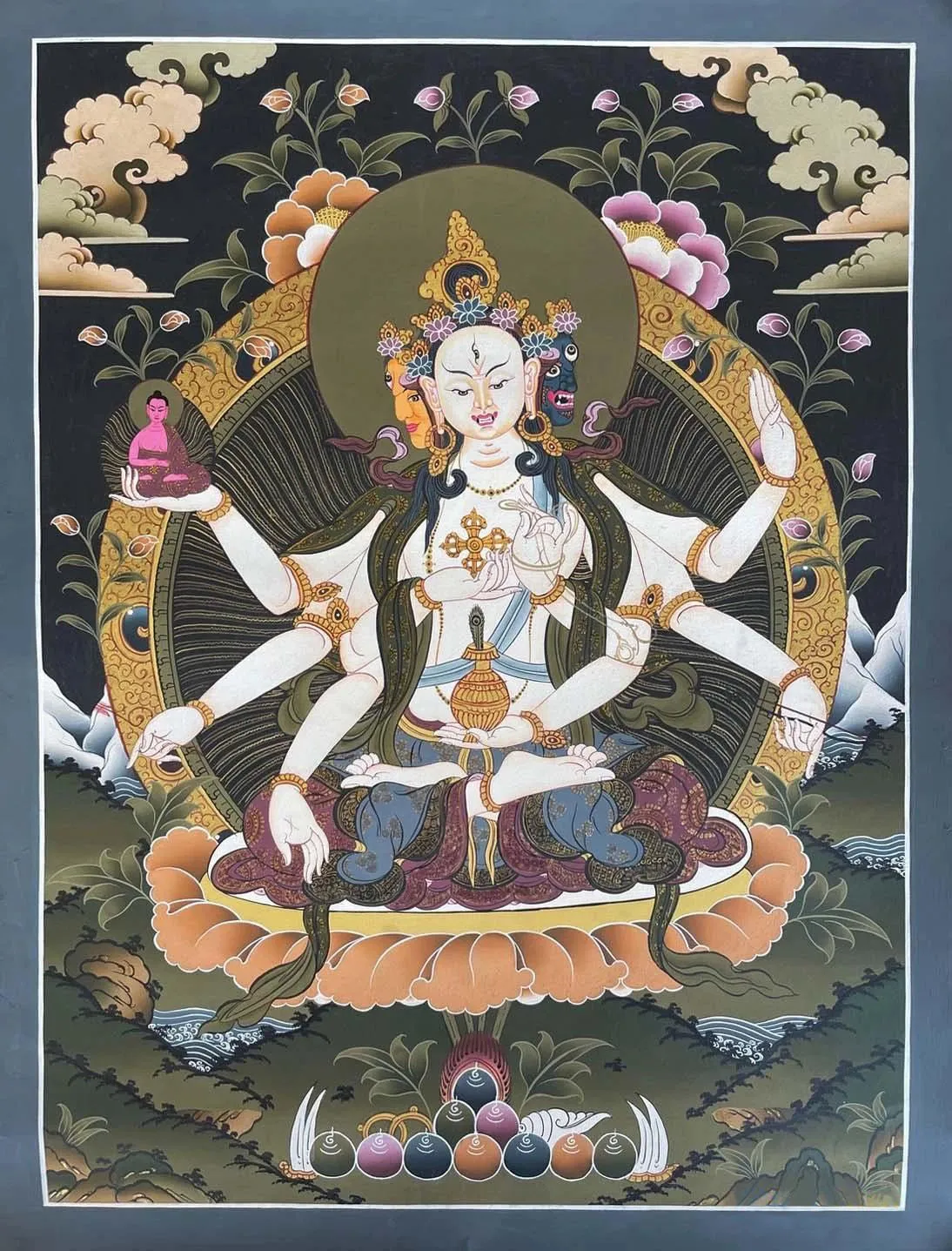 Her eight arms eachhold and represent its meanings, in her first right hand, she holds a doubleDorje, which is near her chest, representing total internal and outer harmony.She holds Amitabha Buddha seated on her second right hand; it represents theability of her devotees to transition from human existence to Buddhahood andindicates that upon death, one would ascend to heaven to live in the pure landof Sukhavati.