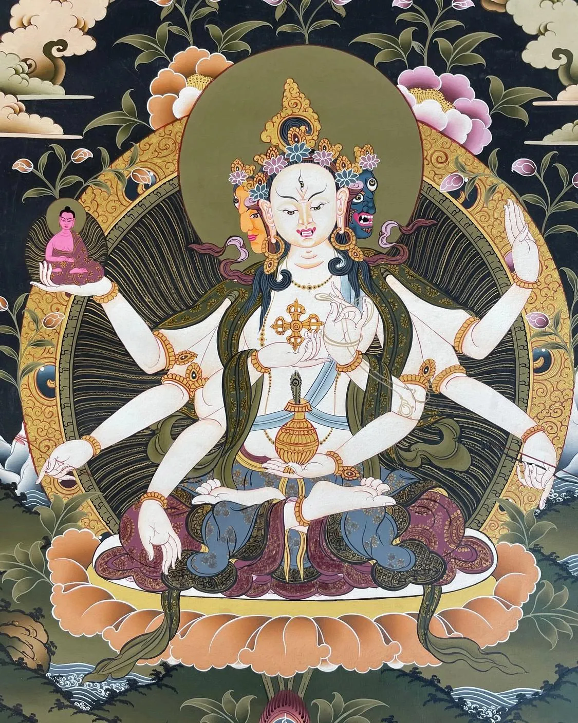 Whatever name yougive her, Namgyalma or Ushnisha Vijaya is revered for her power to banishnegative karma, particularly that which results from taking a life. Typicallyrepresented by three faces, this represents the ability to dissolve obstaclesand cure all illnesses in the three realms. Seated on padmasana, symbolizingher purity and enlightenment. She is adorned with five-pointed crowns torepresent the wisdom of the Five Dhyani Buddhas.