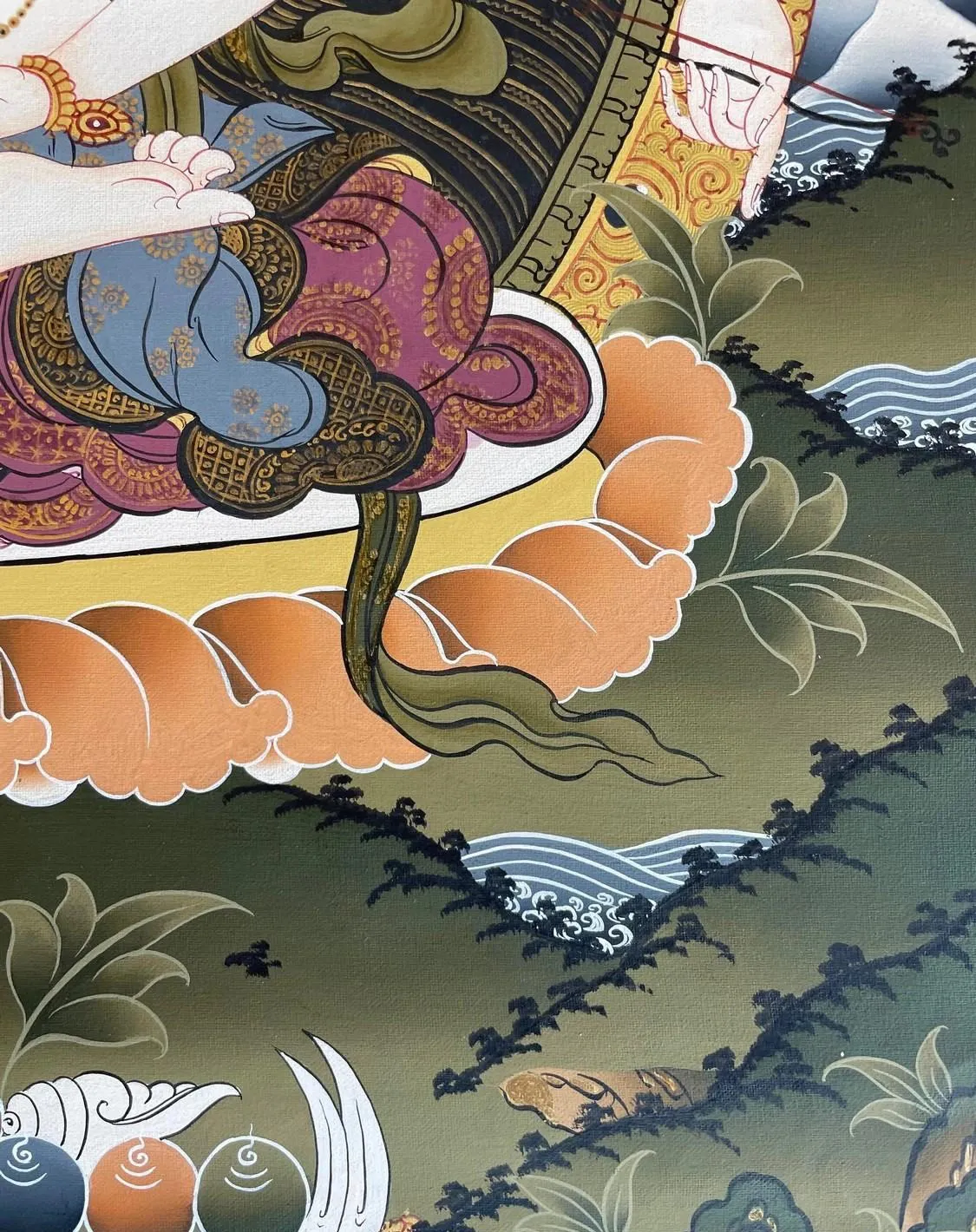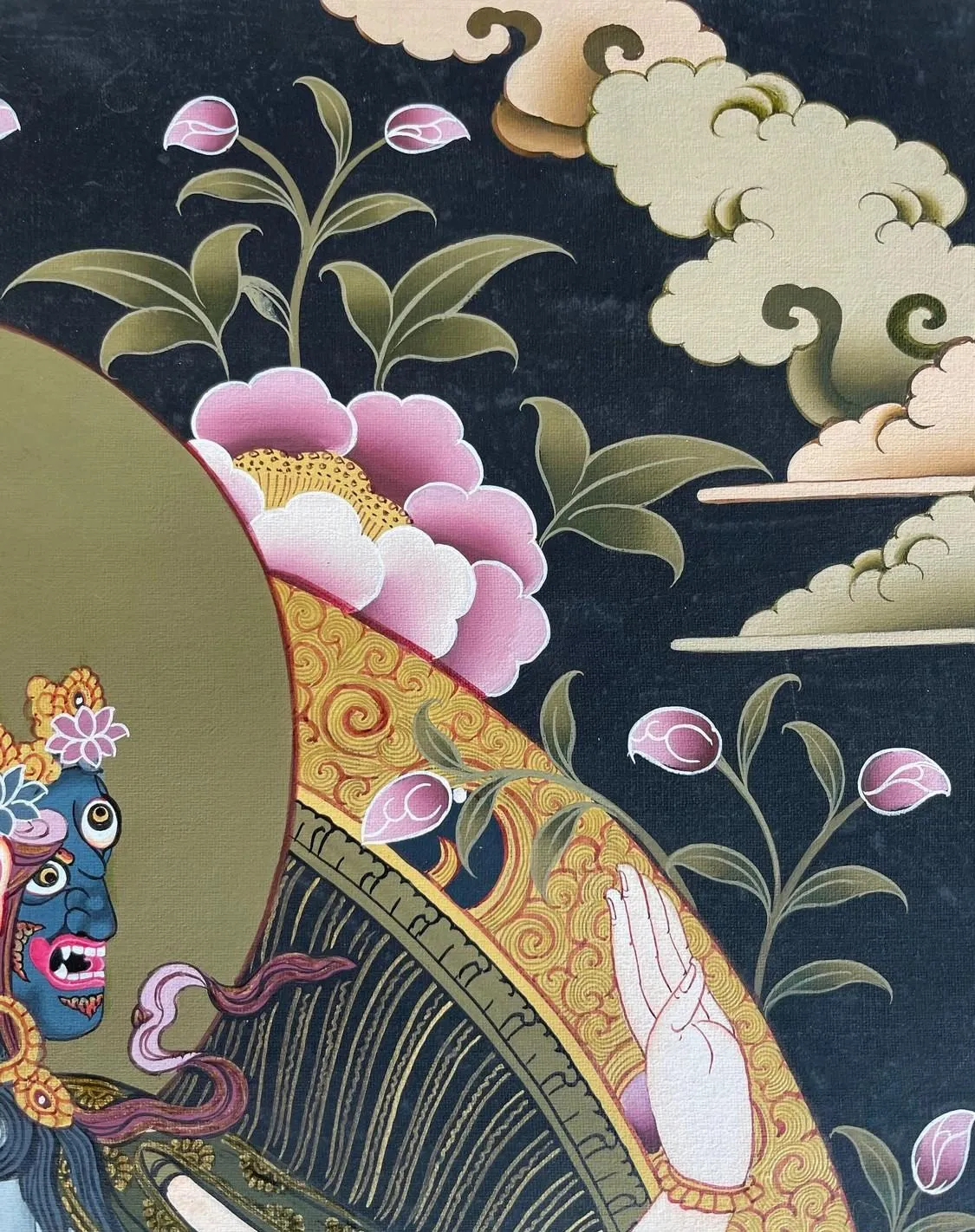 Her third right-handholds an arrow, indicating perspective wisdom that illuminates the ultimatetruth. Her fourth right hand is in the supreme generosity mudra. On the otherside, her first left-hand holds a vajra lasso, representing her mastery of mindcontrol. On the second left hand, she is holding a bow, representing the greatfocus to enable the arrow of wisdom to strike its target. As we notice herthird left hand is making the mudra of offering protection, while her fourthleft hand is holding a long-life vase filled with healing nectar, Ambrosia,Amrit, or the Elixer of immortality.