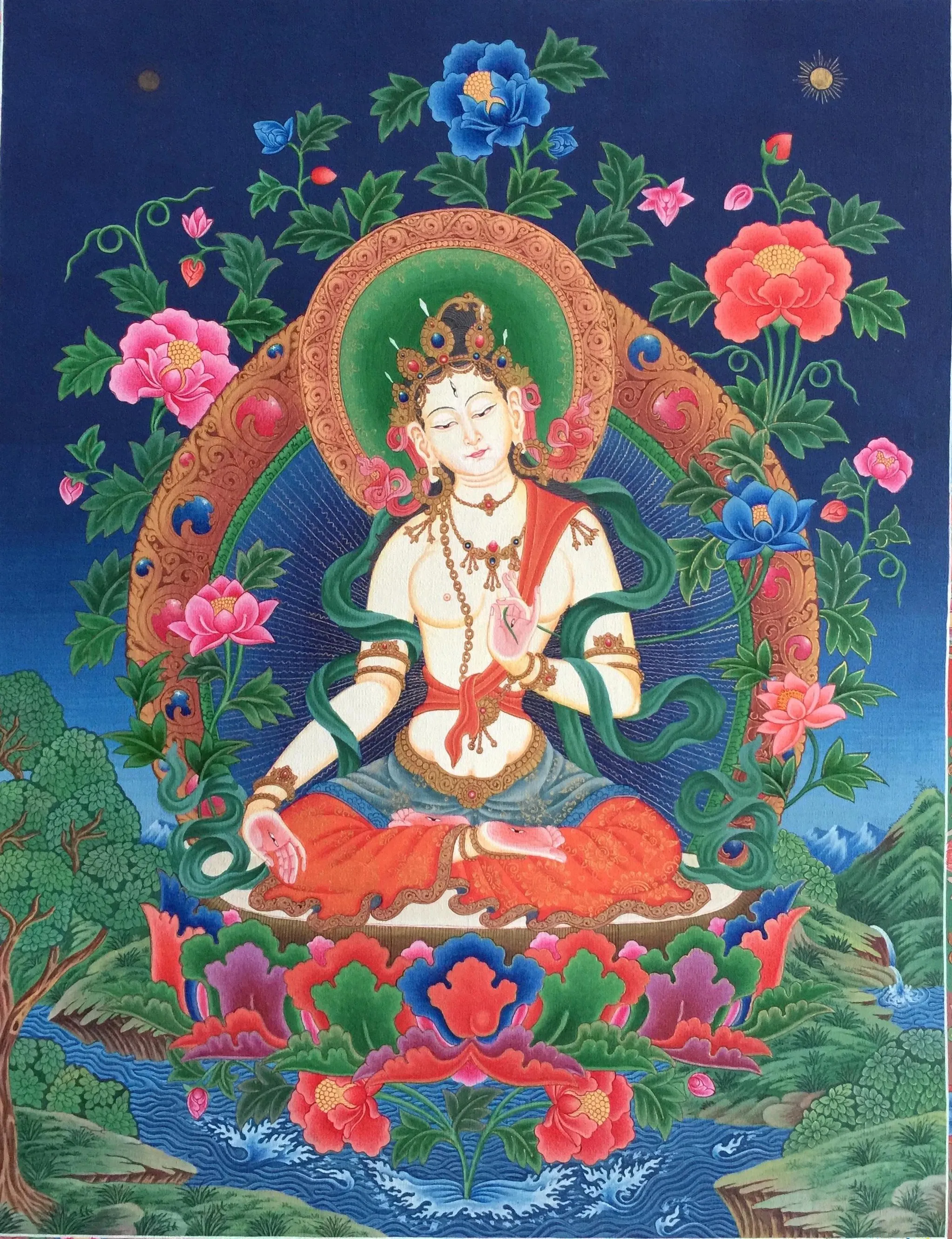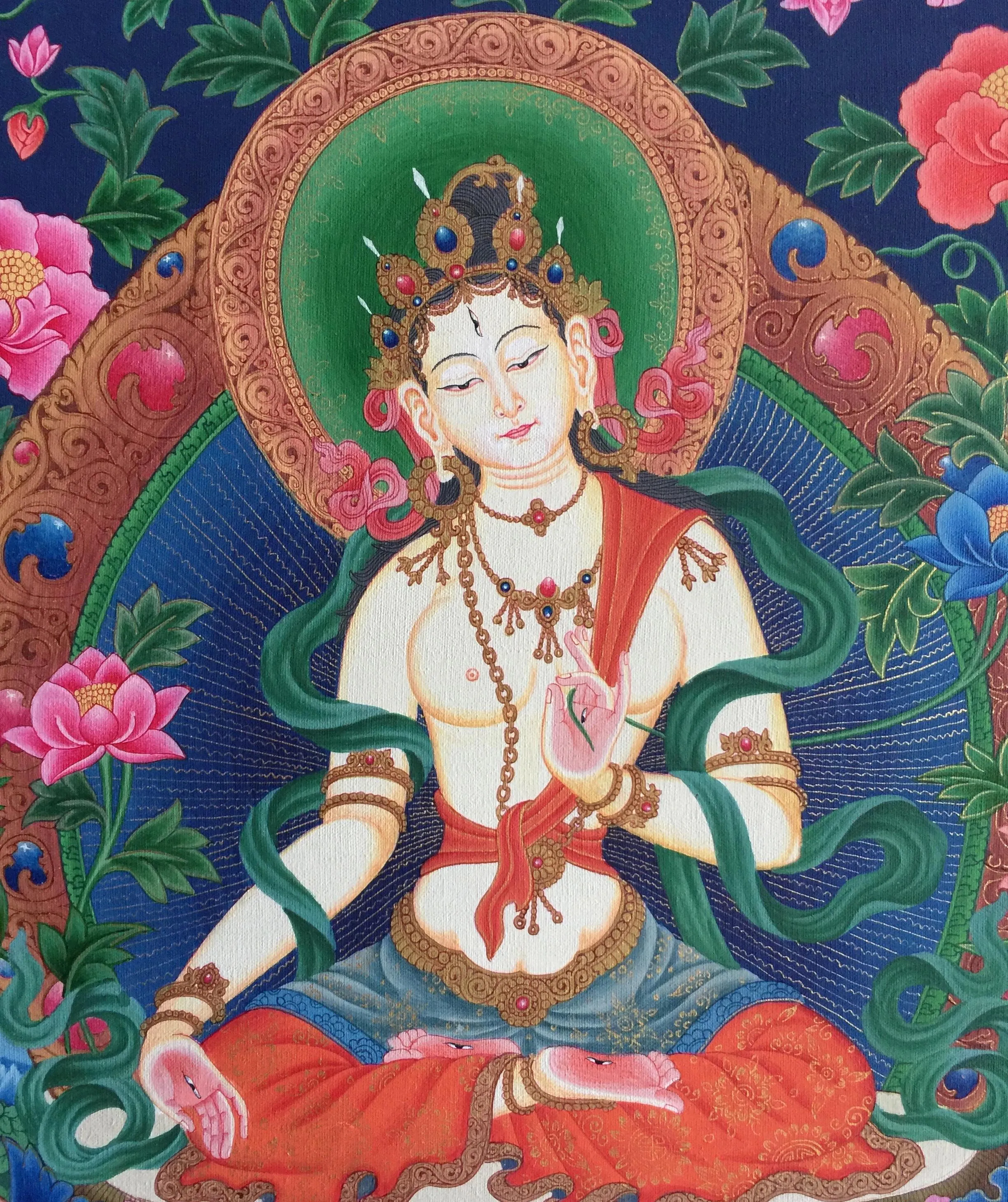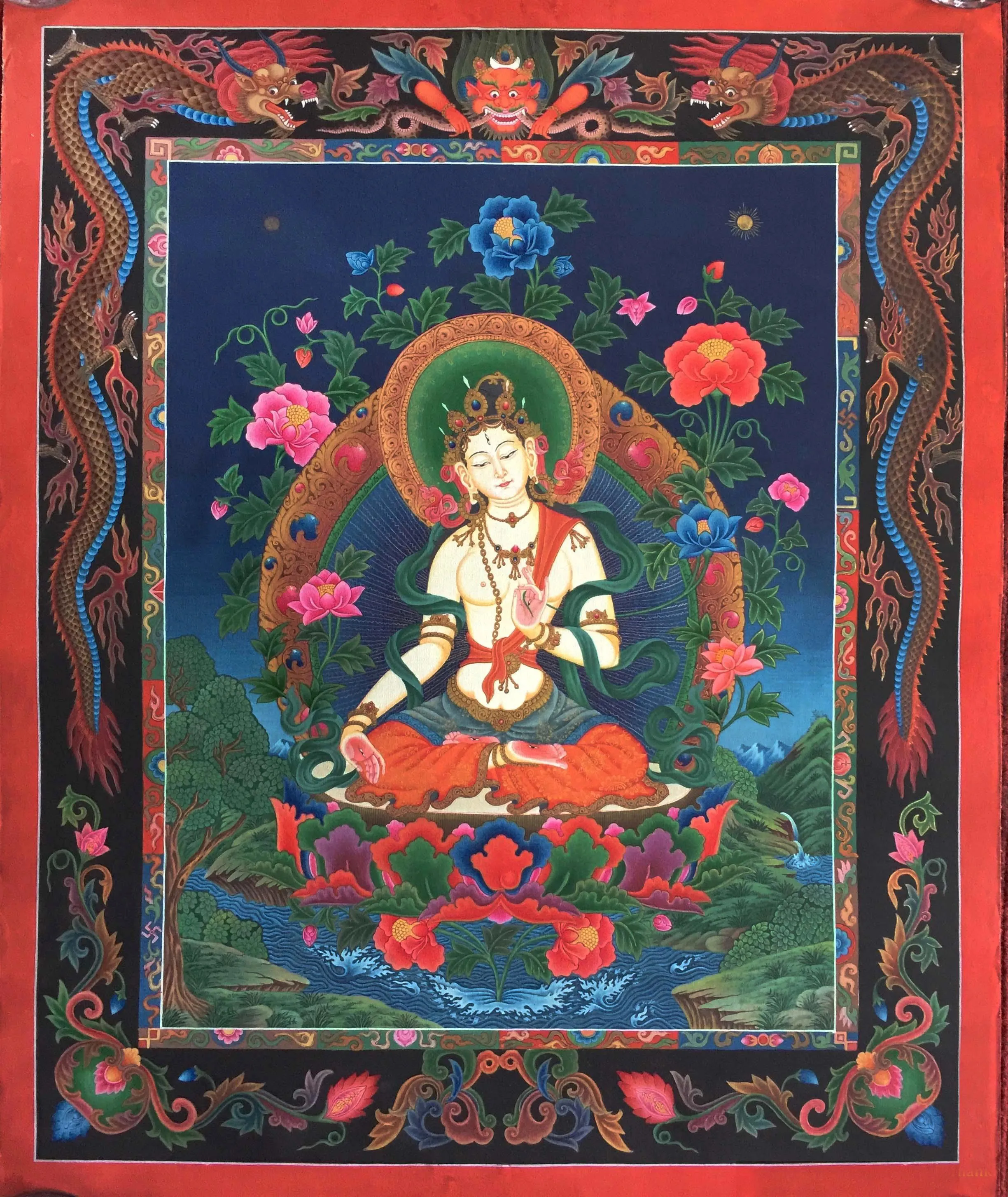 An air of purity,compassion, and timeless tranquility exudes from the lovely form of White Tara,a revered deity in Tibetan Buddhism. Clad in the pure white light, sherepresents pure morality and the luminosity of awakened awareness. With herseven eyes, White Tara is a representation of watchful compassion. Her two eyessymbolize alertness and deep understanding, while the other eye on each handand foot represents her ability to see in all directions and to see beyond theboundaries of space to see the pain that all living things share. Herdedication to providing unending compassion and relieving the pains of sentientexistence is demonstrated by this pictorial image.