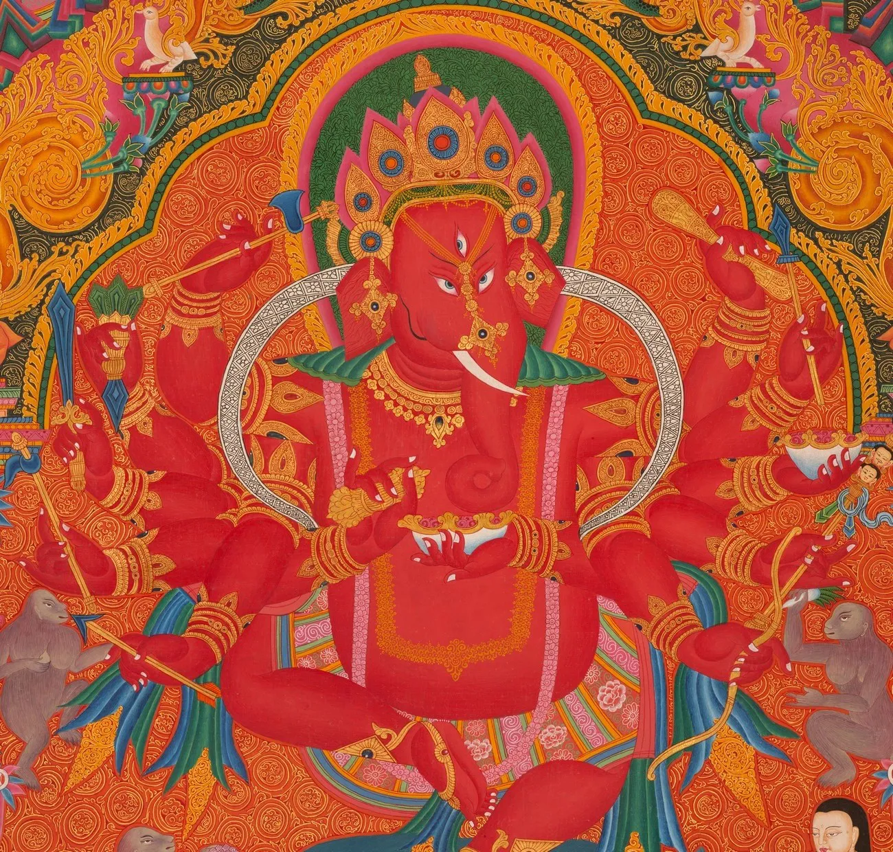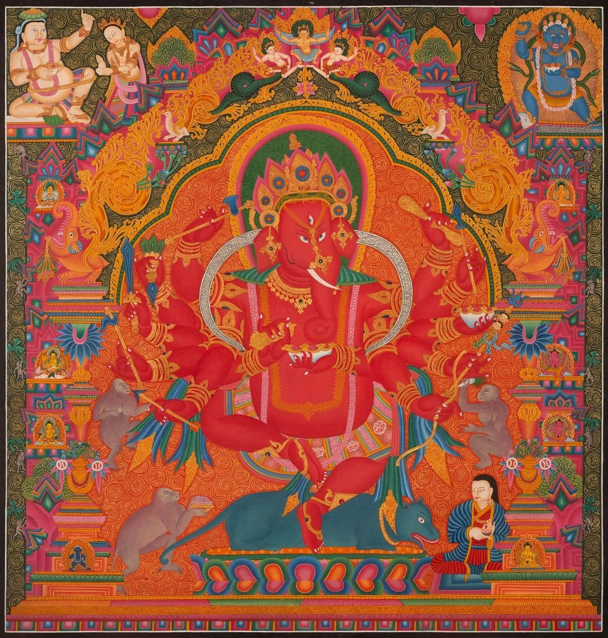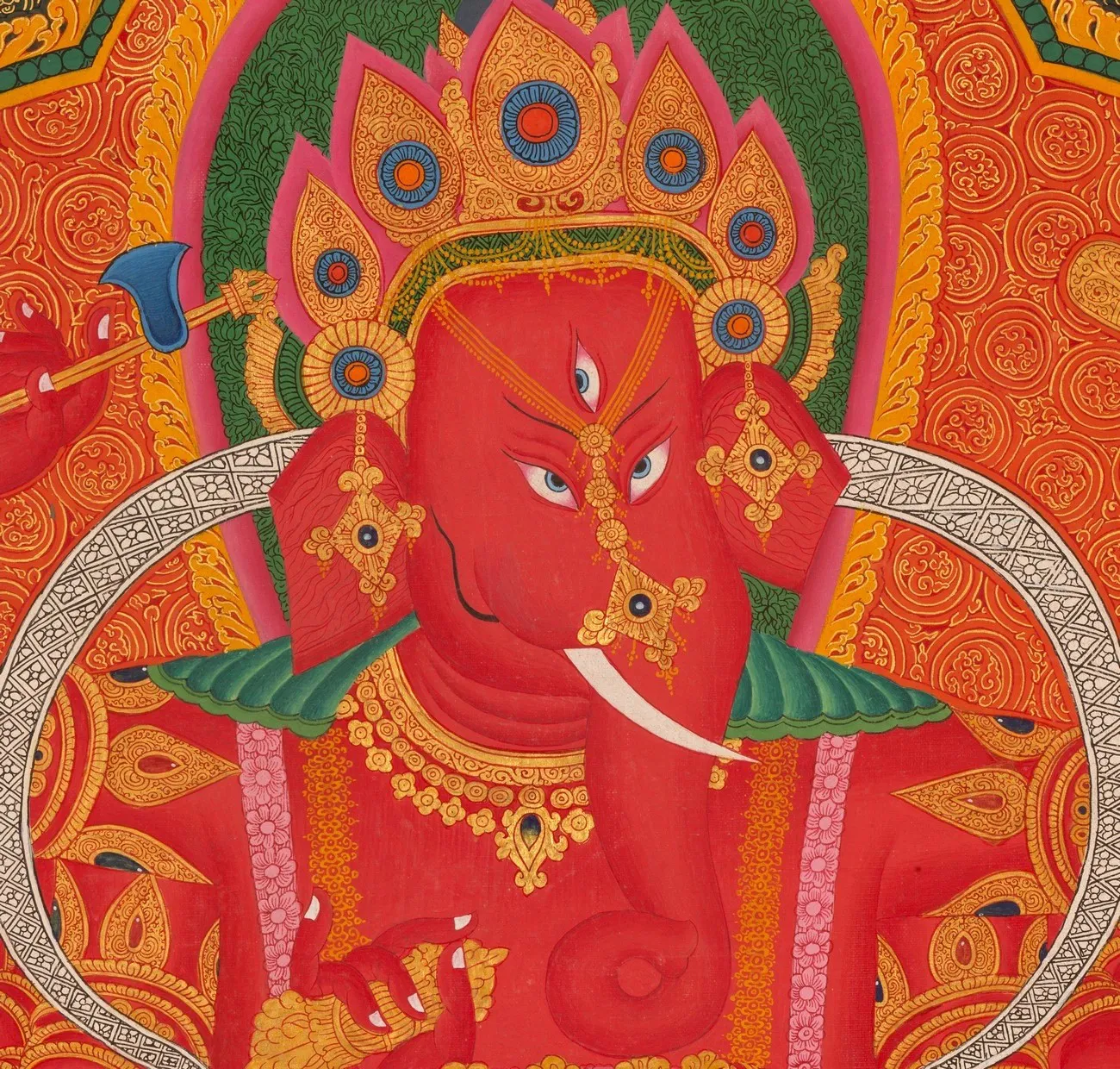 From Hindu collection, Red Newari Ganesha (Brocadeless Thangka) (Pure 24 Carat Gold,Gouache and acrylic colors on Cotton Canvas)