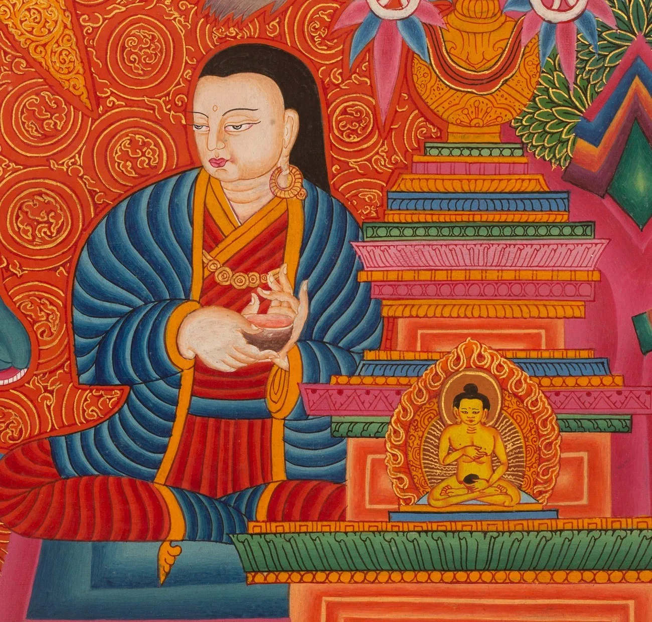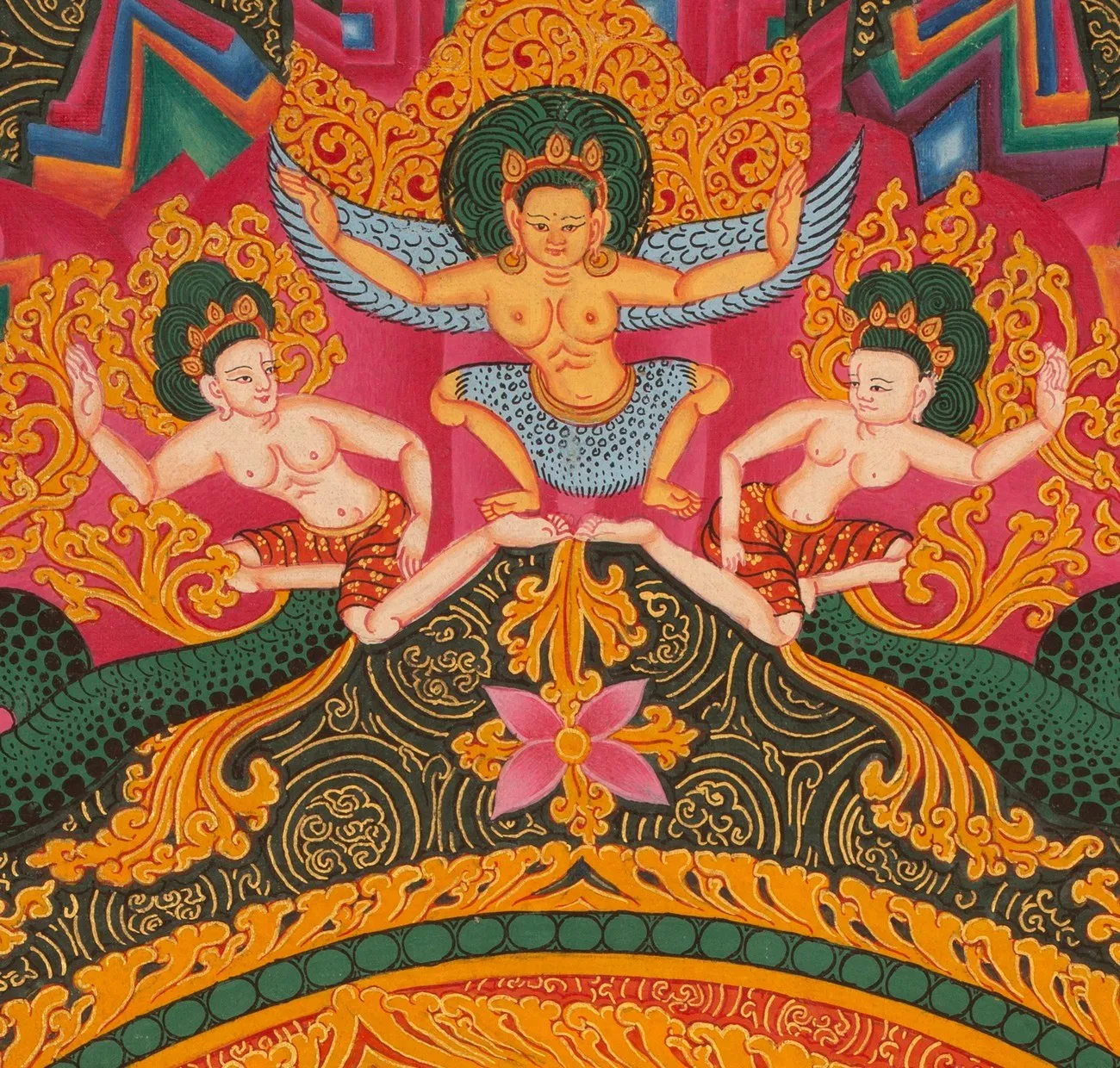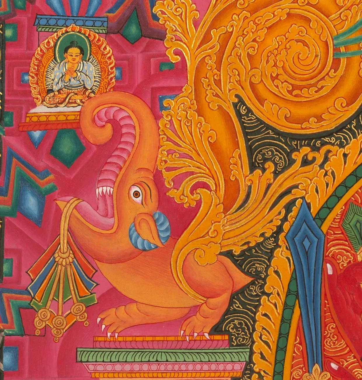 From Hindu collection, Red Newari Ganesha (Brocadeless Thangka) (Pure 24 Carat Gold,Gouache and acrylic colors on Cotton Canvas)