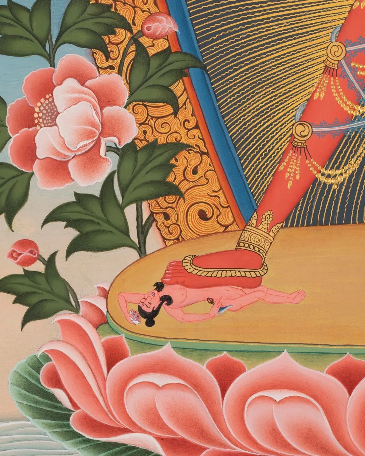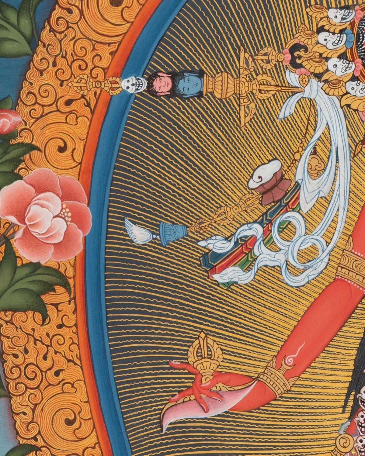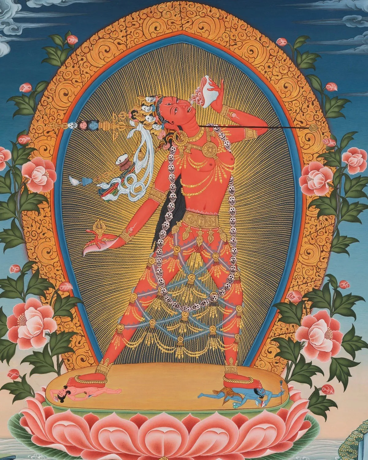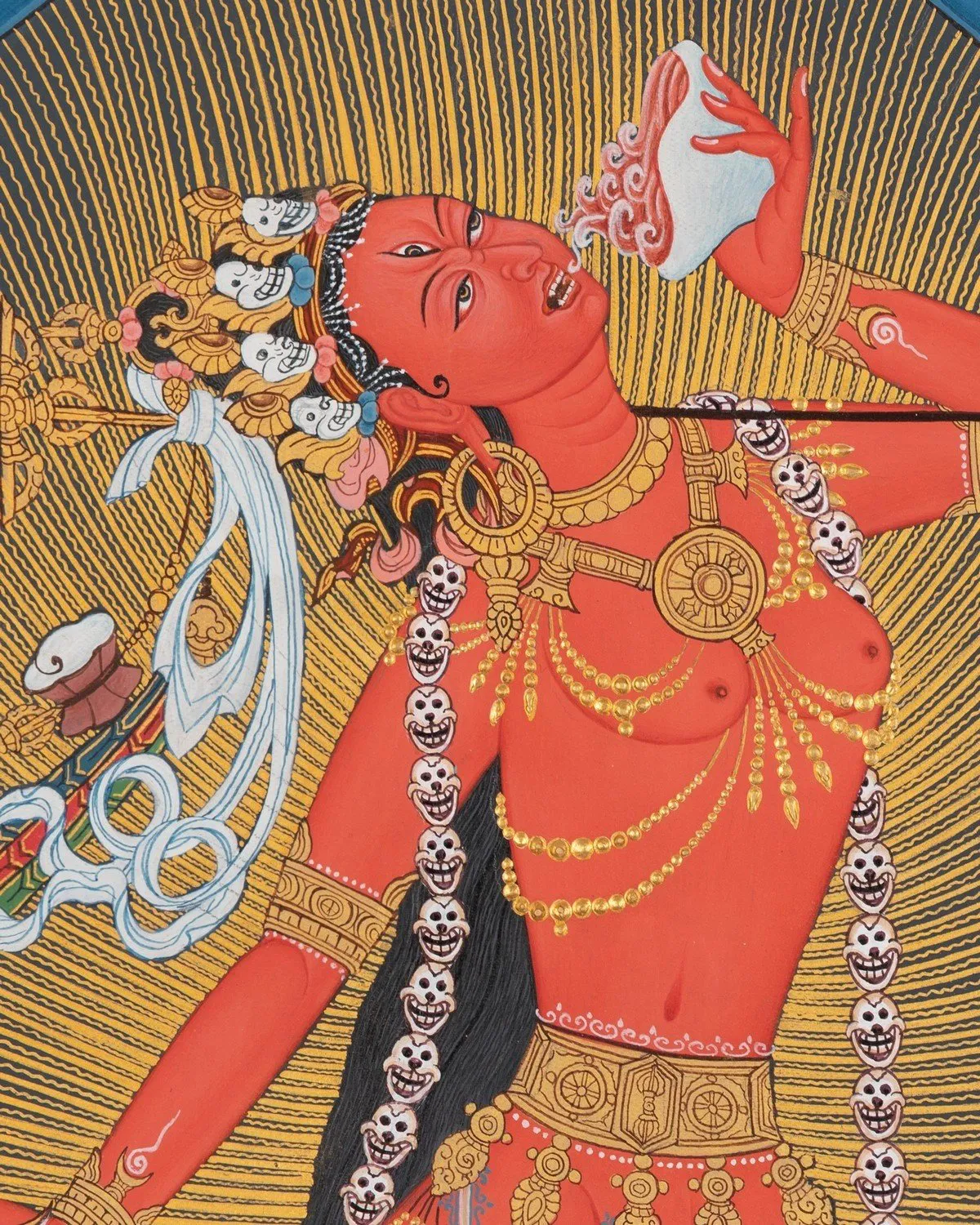 Dakini or yogini inVajrayana, Tibetan, and Tantric Buddhism is a potent female figure who has thepower to navigate through the sky and with her powers, guides a yogi inachieving Enlightenment by initiating him into the Buddhist fold. Enabled bytheir powers or Siddhis, Yoginis have quick access to the Dhyani Buddhas inassociation with whom they are presented in the Tibetan Thangka paintings.Those yoginis who have access to all the Dhyani Buddhas are known as“Sarvabuddha Yogini” (“Sarva” meaning all), similar to the red-hued femaleimage we see in this vibrant and powerful Thangka painting of the yogini.