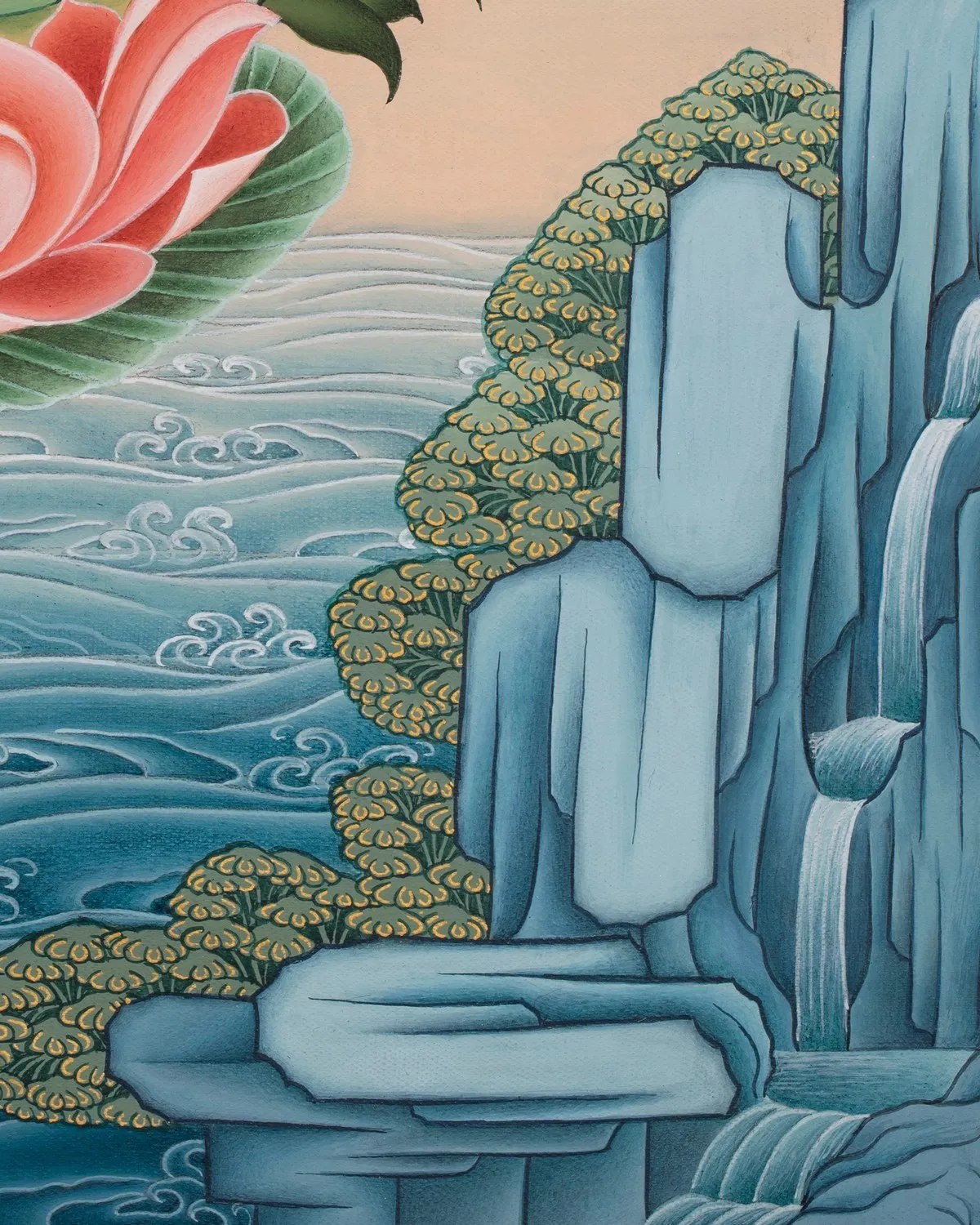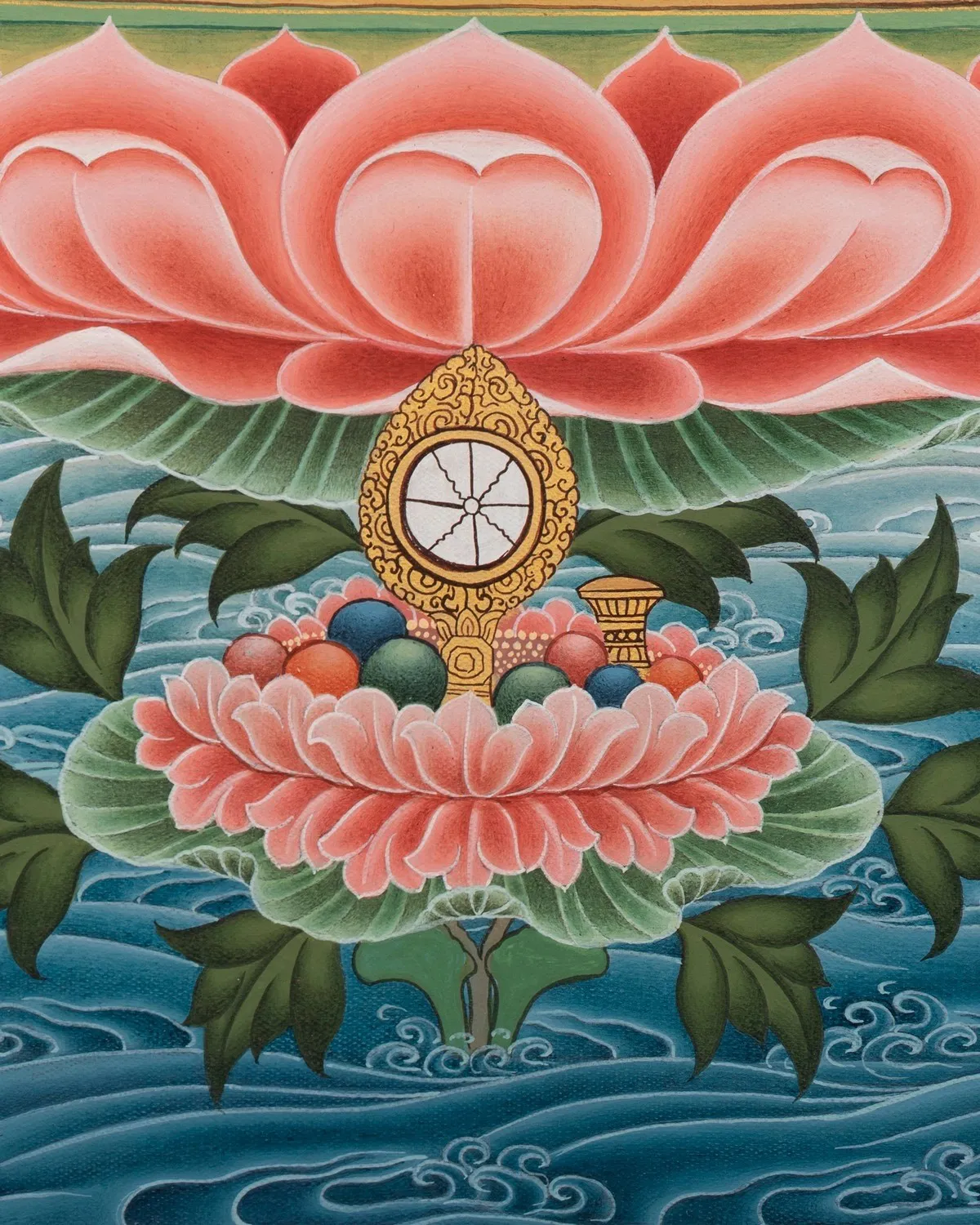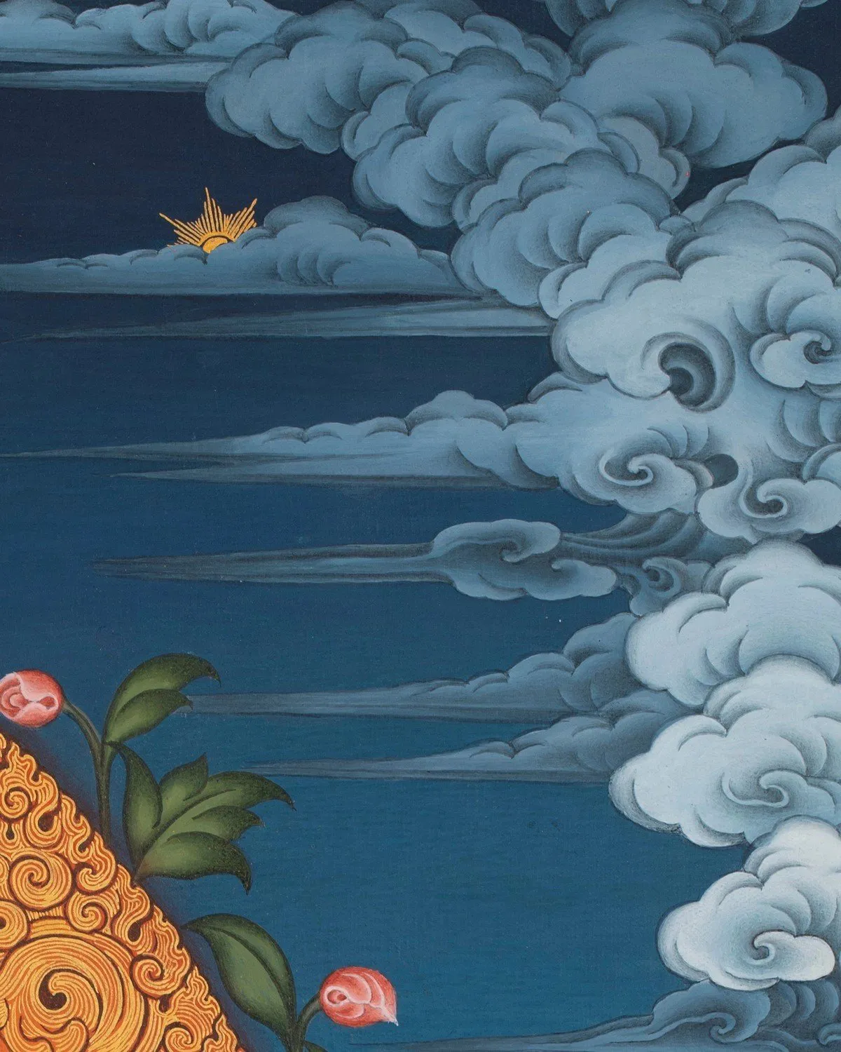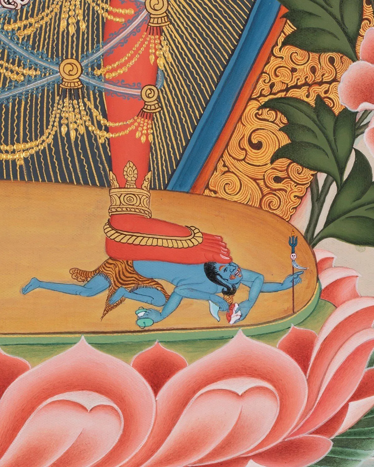 Dakini or yogini inVajrayana, Tibetan, and Tantric Buddhism is a potent female figure who has thepower to navigate through the sky and with her powers, guides a yogi inachieving Enlightenment by initiating him into the Buddhist fold. Enabled bytheir powers or Siddhis, Yoginis have quick access to the Dhyani Buddhas inassociation with whom they are presented in the Tibetan Thangka paintings.Those yoginis who have access to all the Dhyani Buddhas are known as“Sarvabuddha Yogini” (“Sarva” meaning all), similar to the red-hued femaleimage we see in this vibrant and powerful Thangka painting of the yogini.