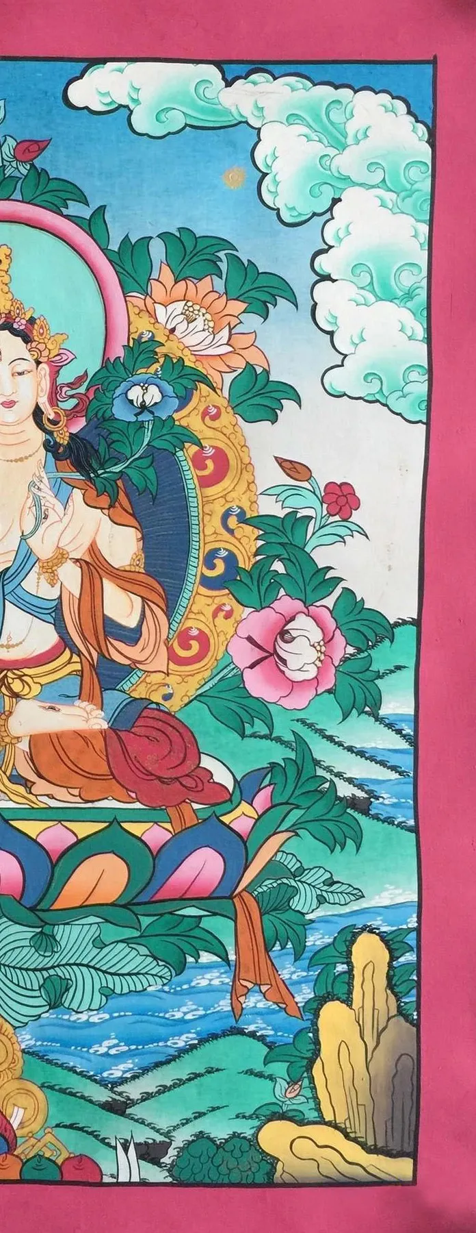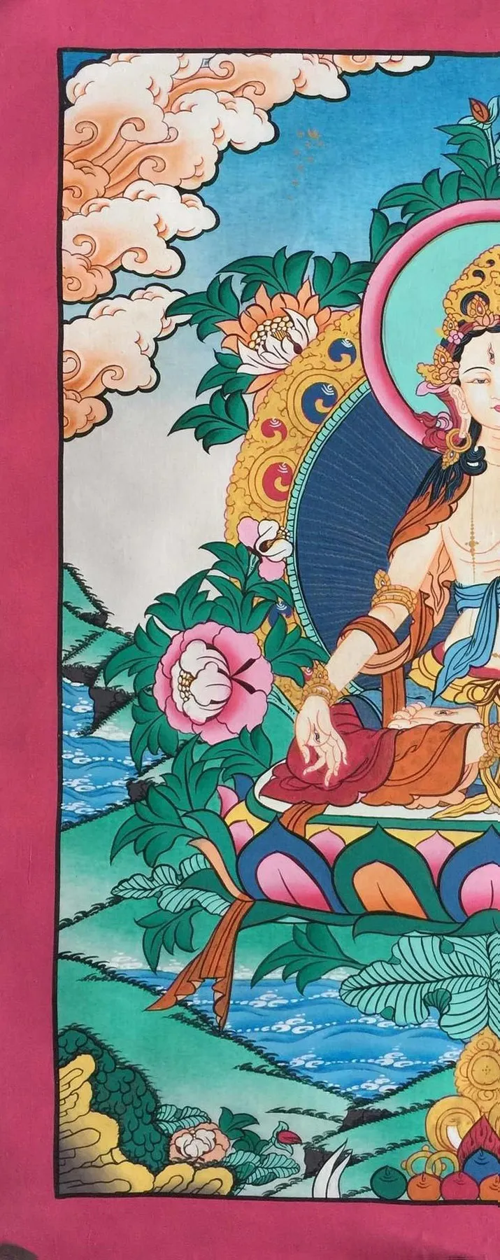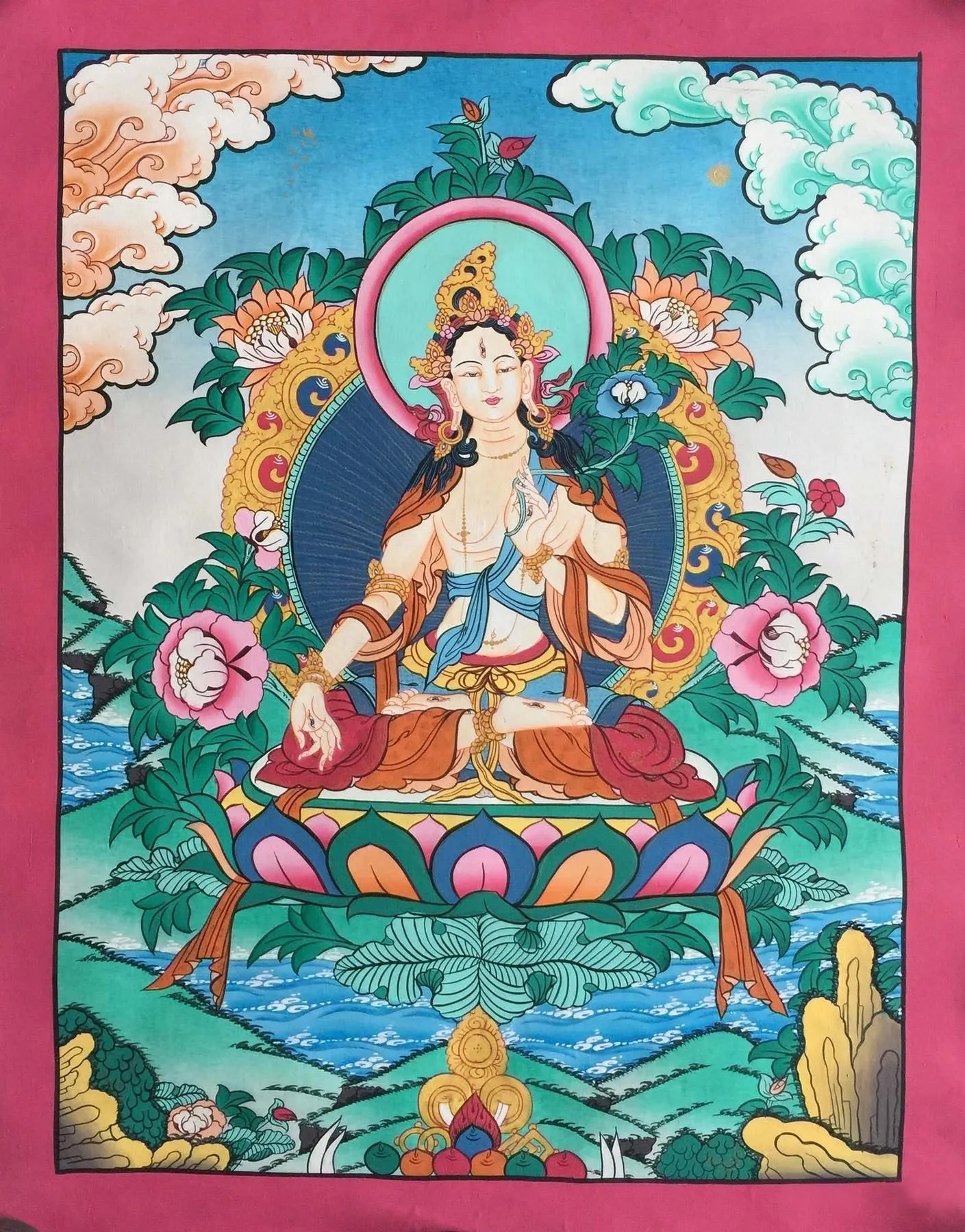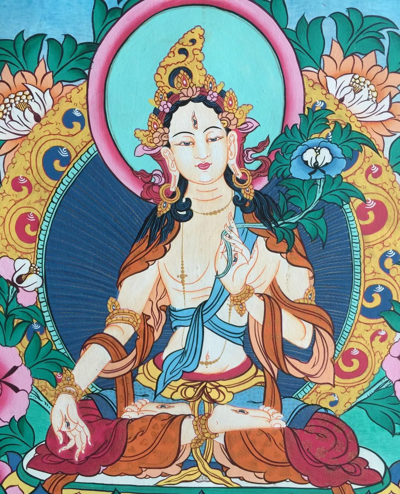 White Tara, a revered figure in Tibetan Buddhism, embodies compassion and wisdom as a Bodhisattva. Usually portrayed in a serene seated position, she emanates tranquility and benevolence. What distinguishes White Tara is her seven eyes, including an additional one on her forehead symbolizing profound insight. Her right hand often assumes a gesture of generosity, bestowing blessings and dispelling fear, while her left-hand cradles a white lotus, representing purity and enlightenment.