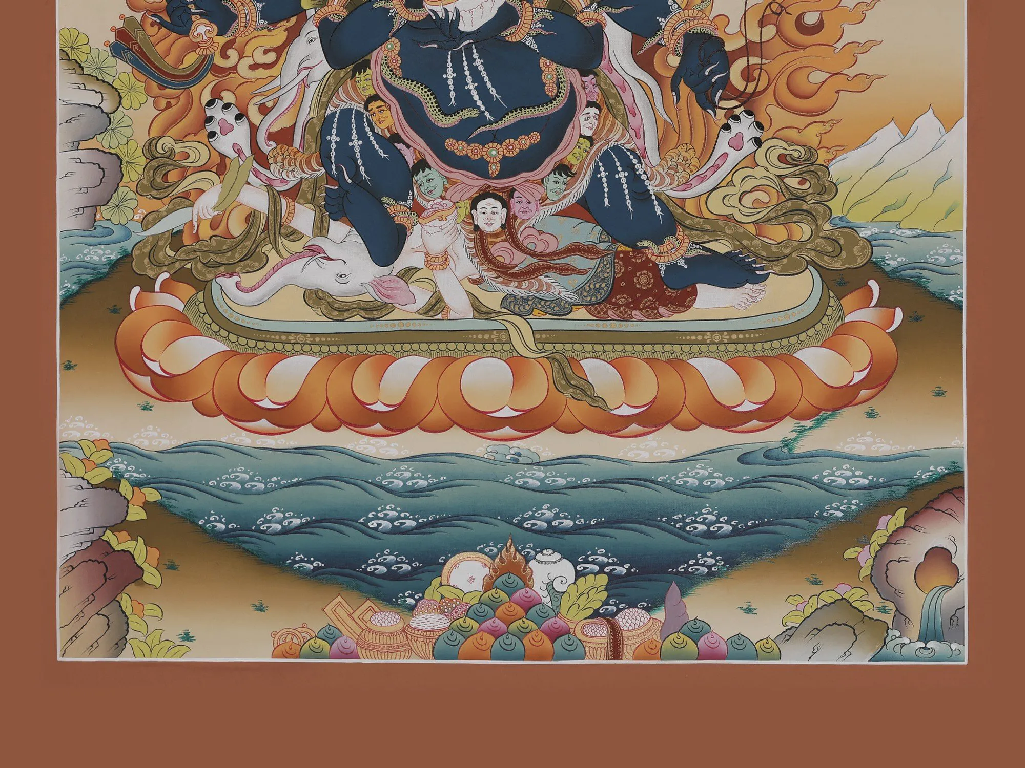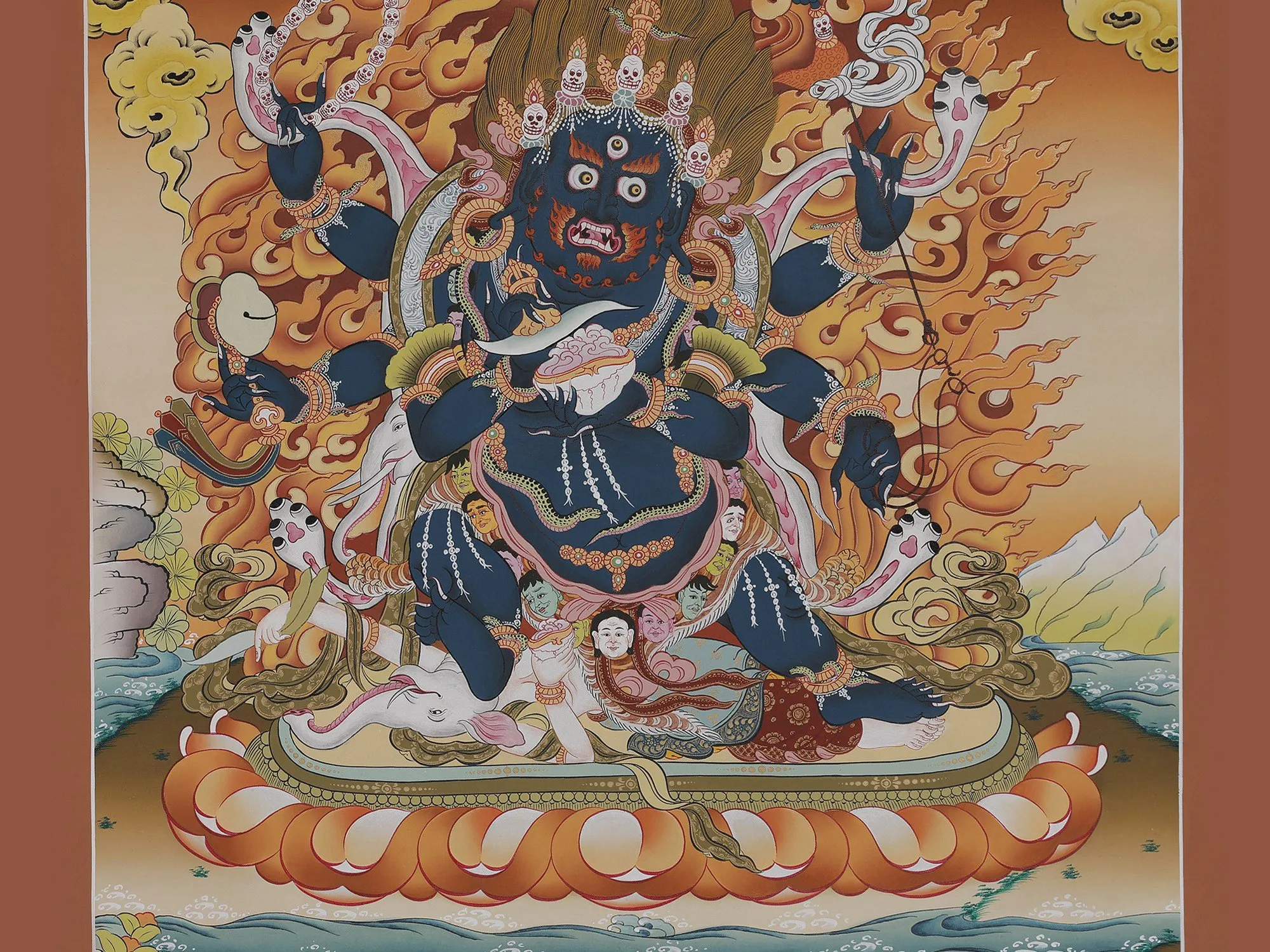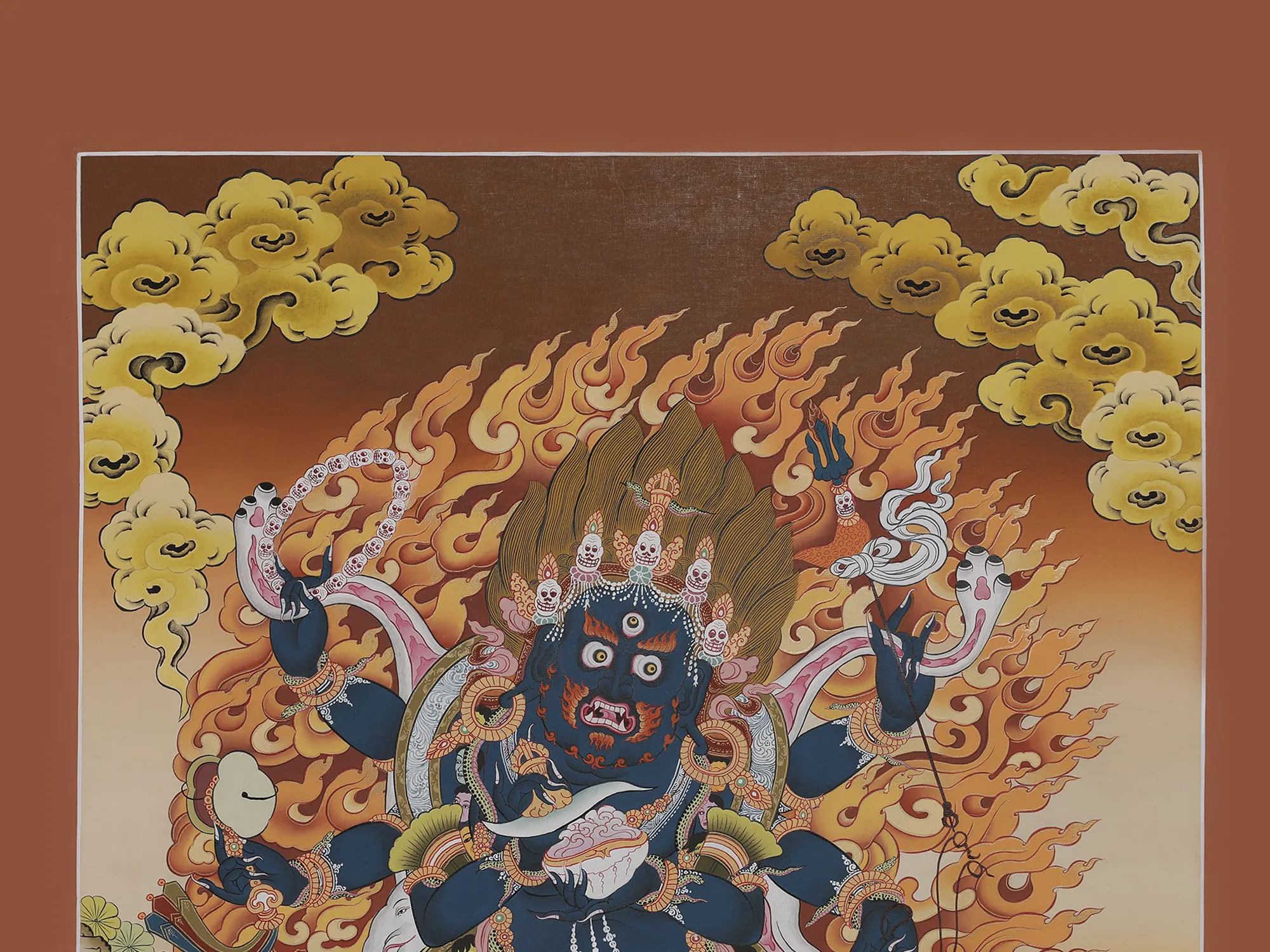 “Mahakalanamo”, in Tibetan tradition Mahakala translates to the great dark one and namo represents his glory. A Wrathful Buddhist deity, Mahakala is said to be an avatar of Vajradhara Buddha. The ruler of time, he is the Dharamapala-protector of the Dharma. Adorned in skull jewelry, he’s fearsome in the look of his eyes and facial that are scorching flames. He holds a Kapala, Kartari, Mundamala, and Trishula standing upright on an elephant, appearing from the sacred fire. As terrifying as he appears, he’s a deity of compassion in essence.
