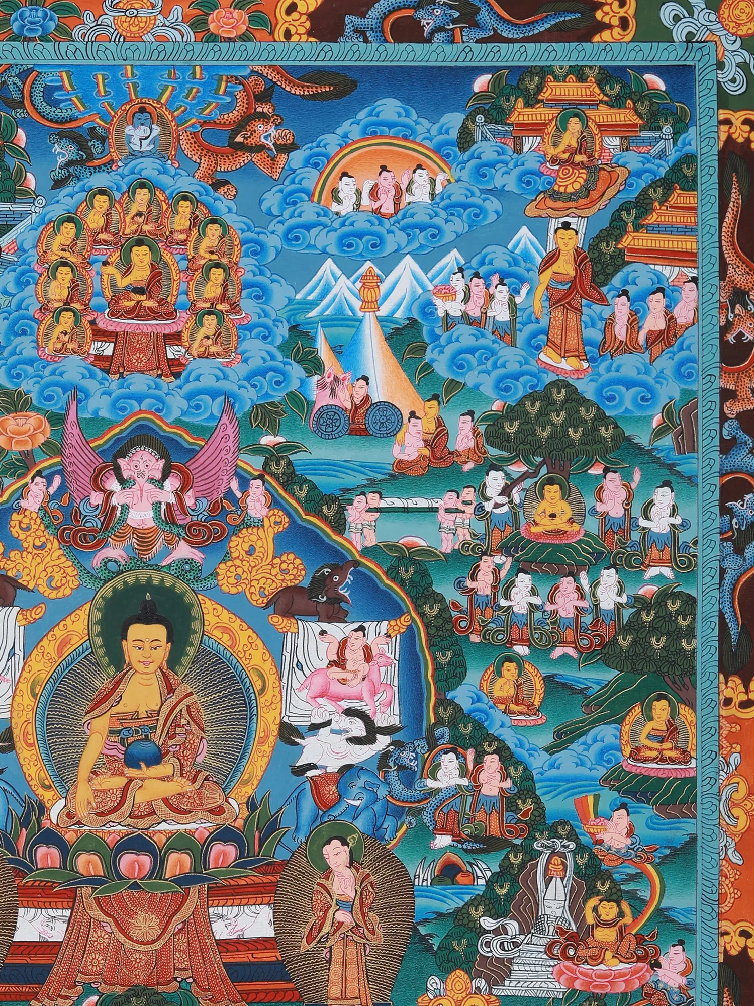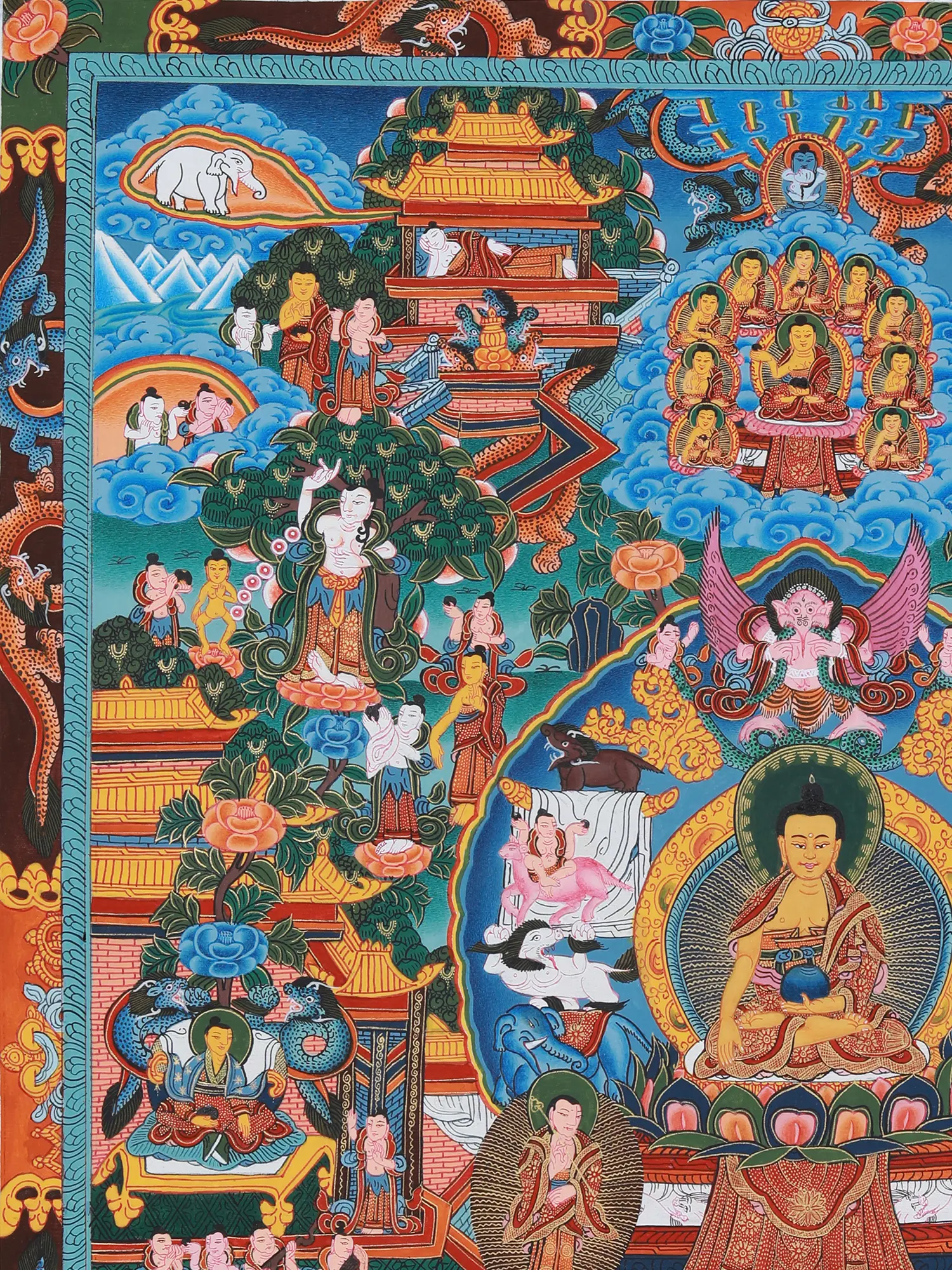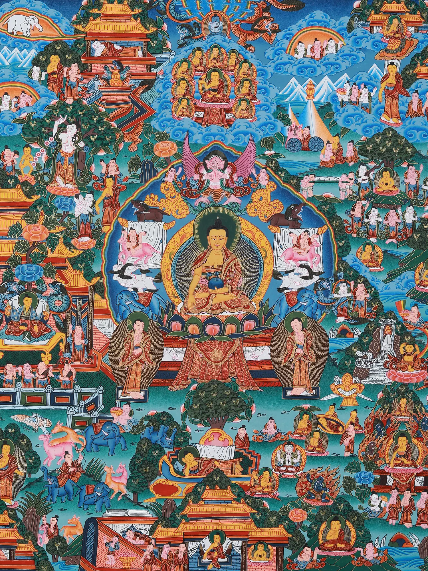 The painting depicts key episodes from the life of Siddhartha Gautama, from his luxurious upbringing as a prince sheltered from the suffering of the world, to his renunciation, his arduous path of asceticism, and finally, his attainment of enlightenment under the Bodhi tree. Witness his Great Departure, leaving behind the comforts of his princely life in search of truth; his encounter with the Four Sights – old age, sickness, death, and a renunciate – that shook his perception of reality; and his relentless pursuit of spiritual liberation through meditation and mindfulness. These scenes are not merely historical representations but potent symbols of the human journey towards self-discovery and transcendence. The details, even in the smallest figures, are replete with meaning, inviting contemplation and deeper understanding of Buddhist philosophy.A Symphony of Symbols and Iconography