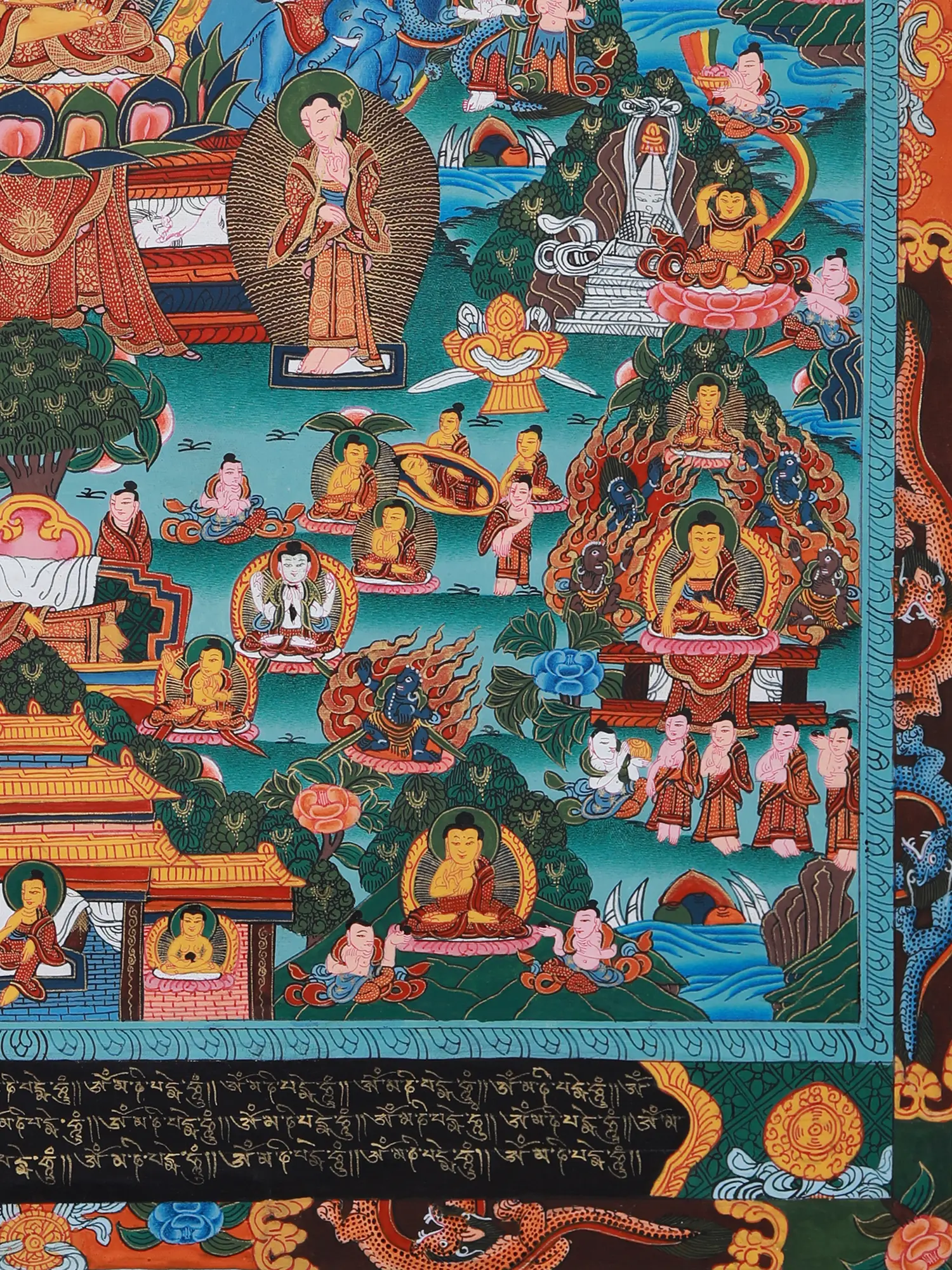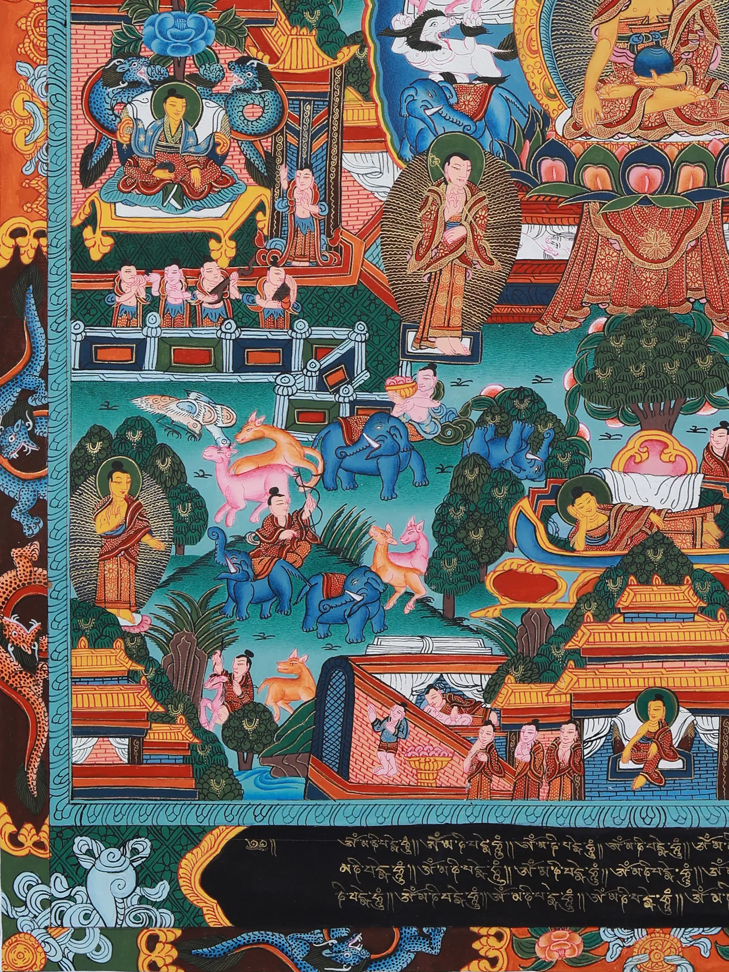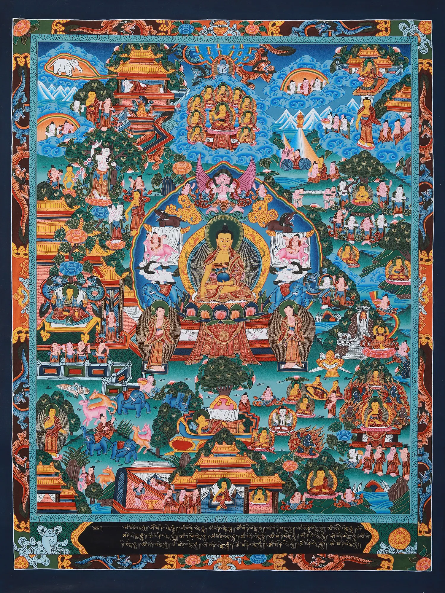 The painting depicts key episodes from the life of Siddhartha Gautama, from his luxurious upbringing as a prince sheltered from the suffering of the world, to his renunciation, his arduous path of asceticism, and finally, his attainment of enlightenment under the Bodhi tree. Witness his Great Departure, leaving behind the comforts of his princely life in search of truth; his encounter with the Four Sights – old age, sickness, death, and a renunciate – that shook his perception of reality; and his relentless pursuit of spiritual liberation through meditation and mindfulness. These scenes are not merely historical representations but potent symbols of the human journey towards self-discovery and transcendence. The details, even in the smallest figures, are replete with meaning, inviting contemplation and deeper understanding of Buddhist philosophy.A Symphony of Symbols and Iconography
