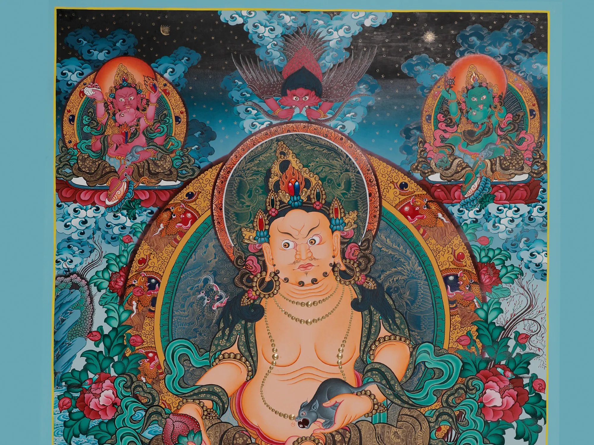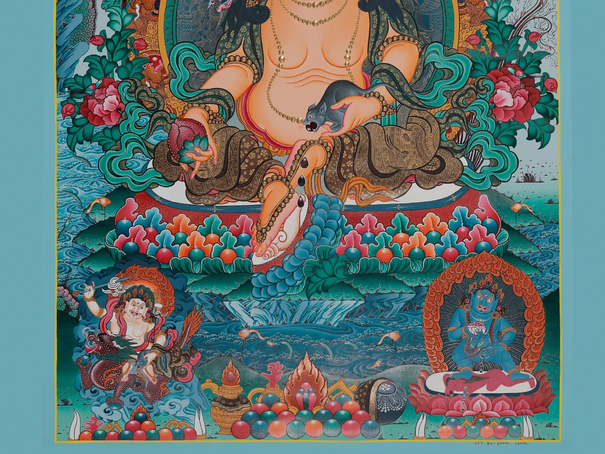 Kubera is a shared deity inHindu, Buddhist, and Jain traditions; with each sharing commonalities; thethree also have their specific interpretations to him. Painted traditionally inthe TibetianThangka style - this mural of Kubera depicts him seated on his regalthrone. Looking to the side, his big belly is the representation of theabundance associated with him, and the mongoose in his hand is an antagonist tothe Nagas (guardians of treasure) - just like the Garuda on top, consuming twosnakes. Kubera,who’s the lord of Yakshas is accompanied by two Herukas on the upper cornersand Vajrapani, Mahakala on the lower ones. Set in a blue hue, the colors ofthis painting are a rich mix of dark and light!