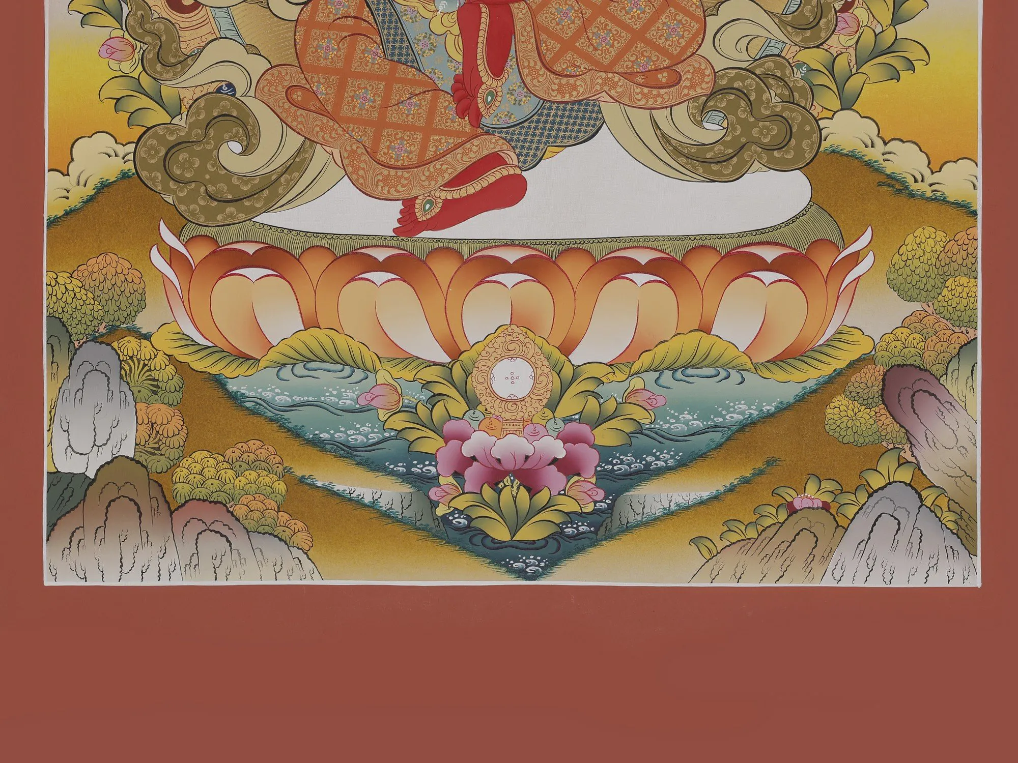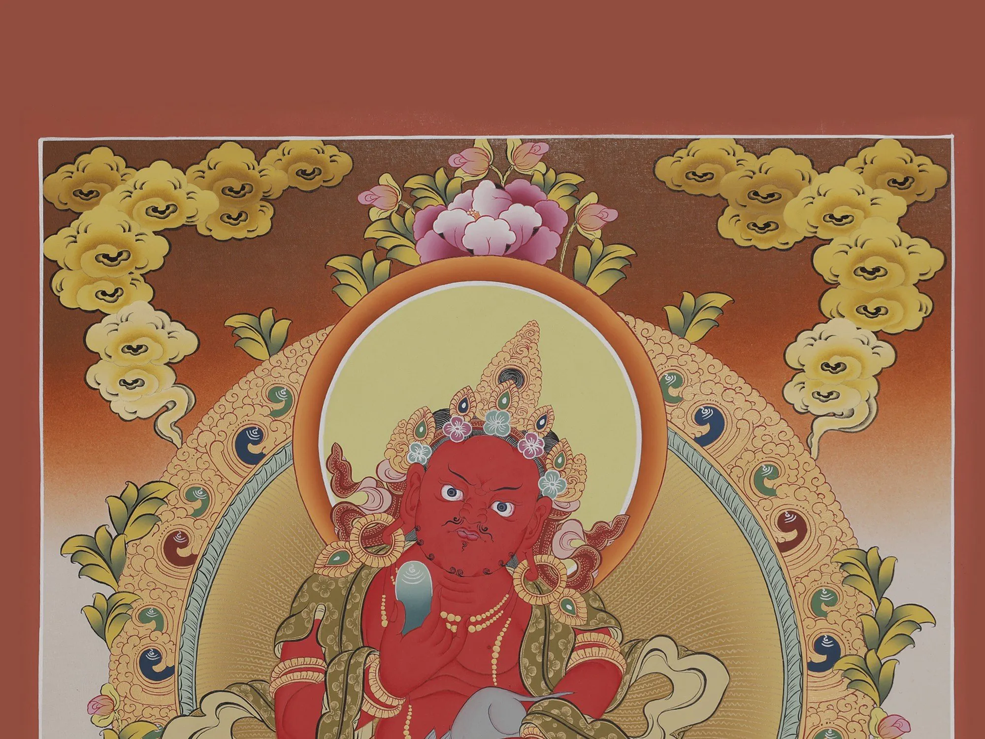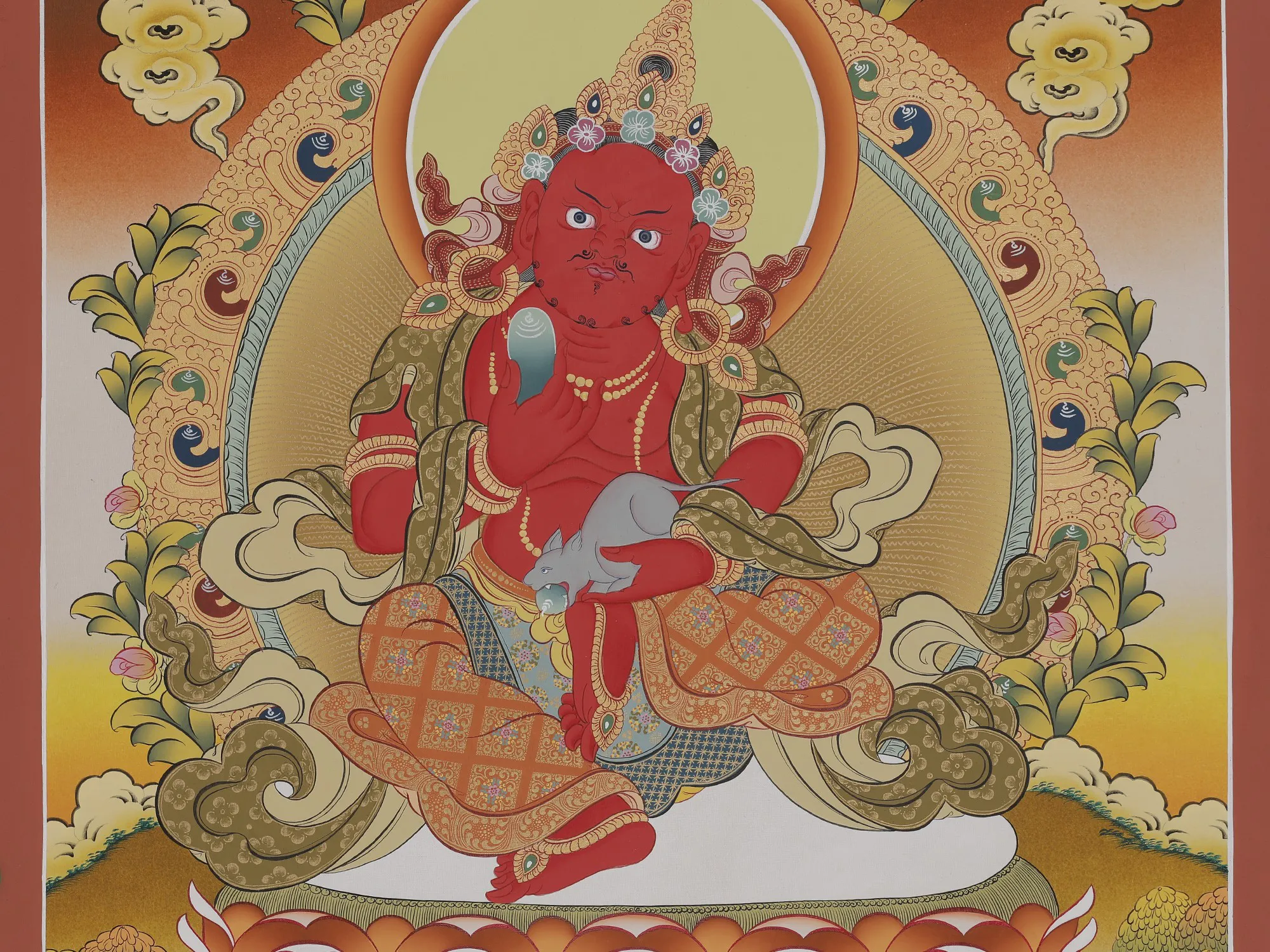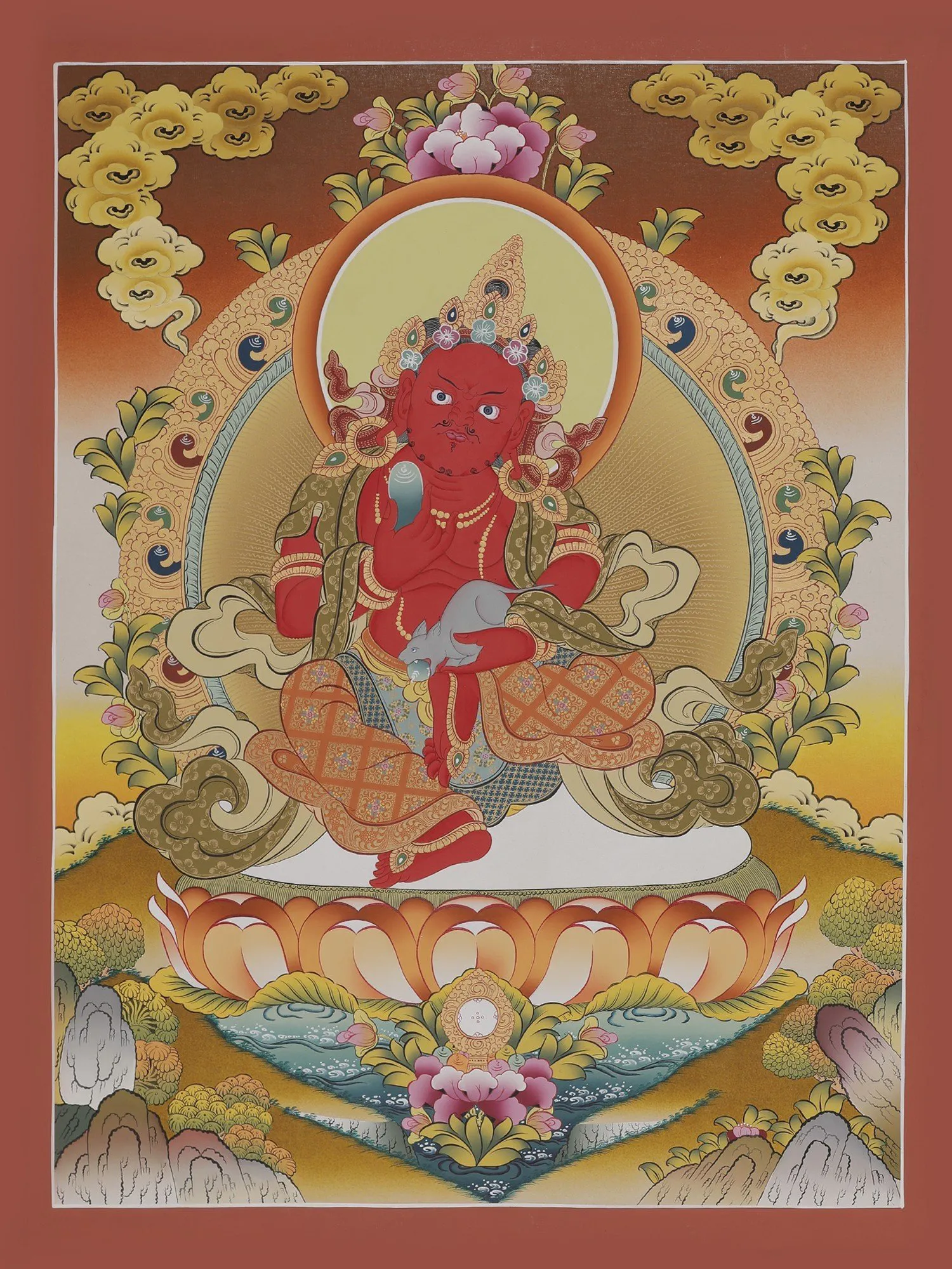 Made in Thangka - Kubera,the treasurer of heavens in Hindu tradition and the enabler of prosperity,similarly in the Buddhist tradition is the Guardian of Northern Directions!Drawn in a natural plain - Kuberasits in a Lalitasana, holding a precious gem in one hand and a mongoose inanother, which too takes a gem out of its mouth. The fabrics on him replicate the Himalayanembroidery from Nepal and Tibet, and his red complexion symbolizes themodalities of life force and preservation.