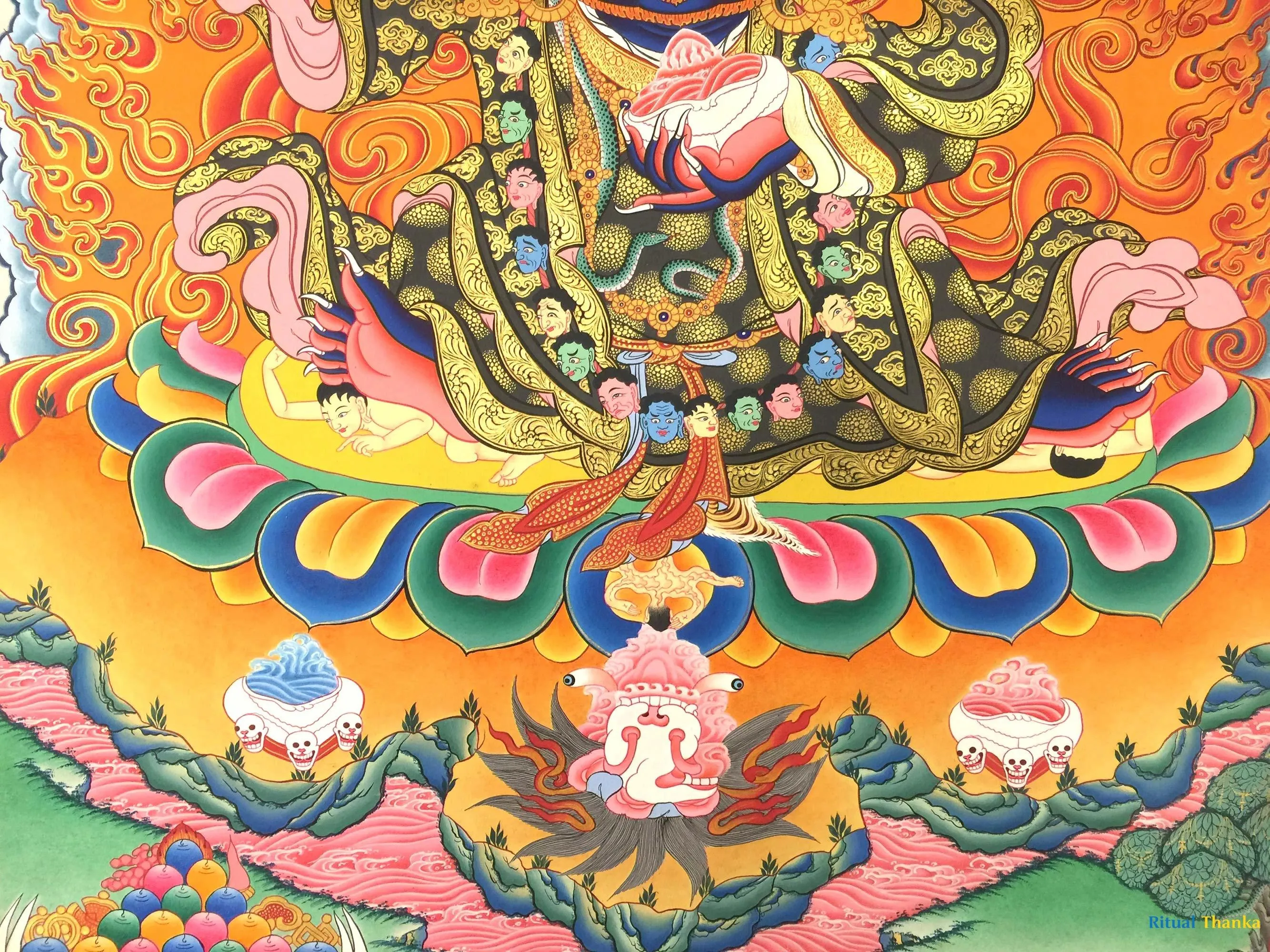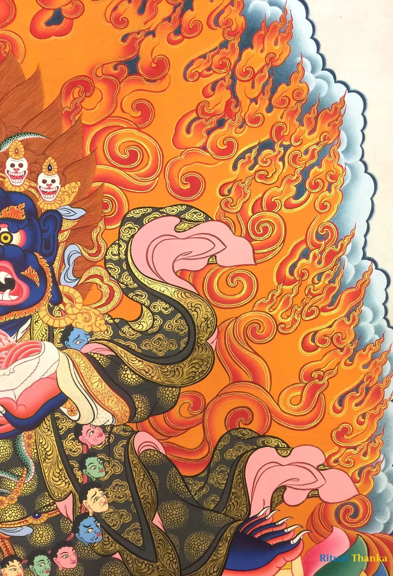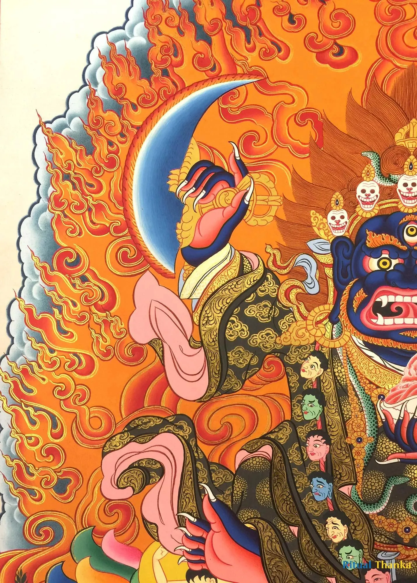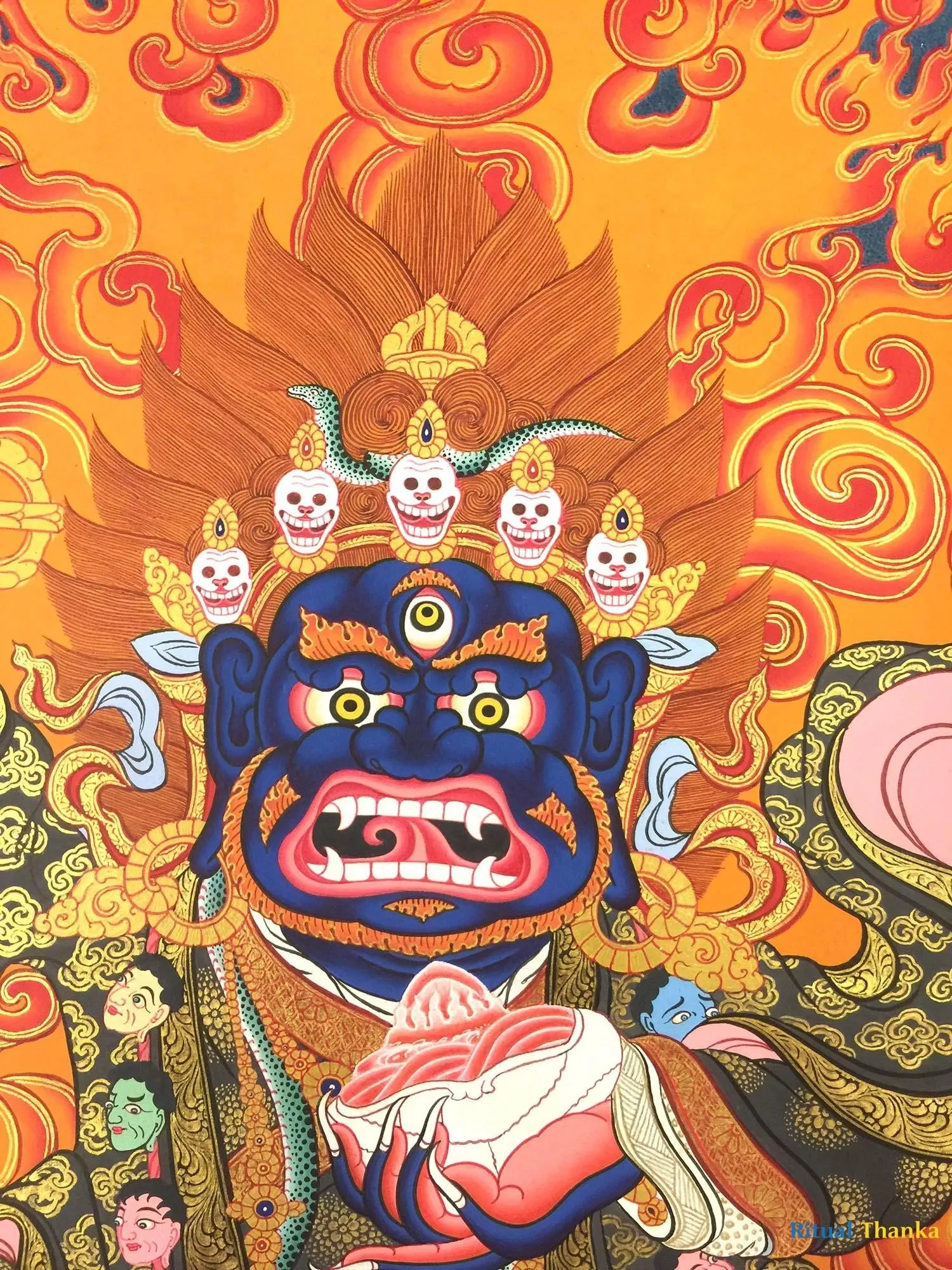 From Mahakala collection, Two armed Bernagchen Mahakala the special protector of the Karma Kagyu Lineage (Brocadeless Thangka) (Pure 24 Carat Gold,Gouache and acrylic colors on Cotton Canvas)