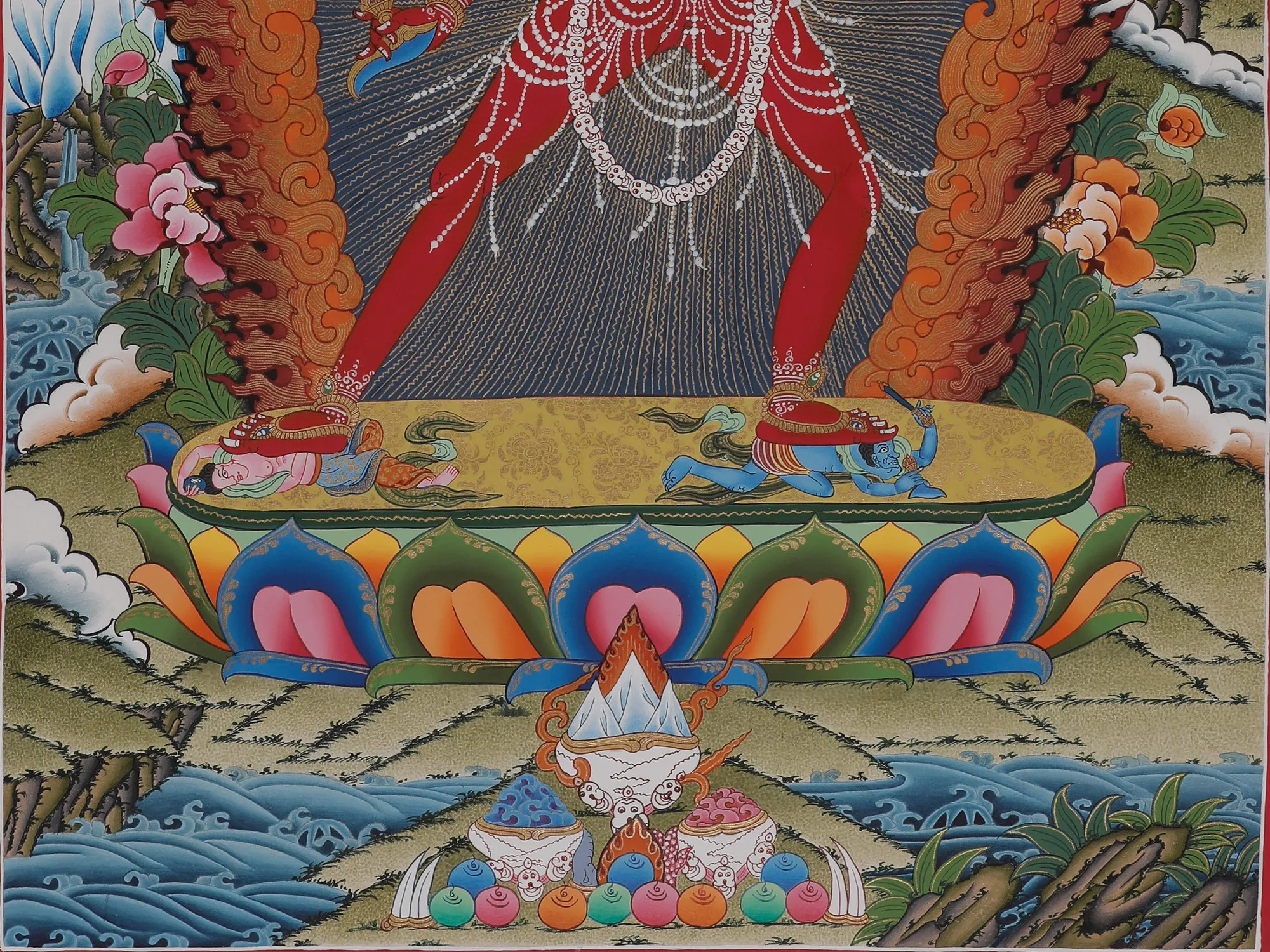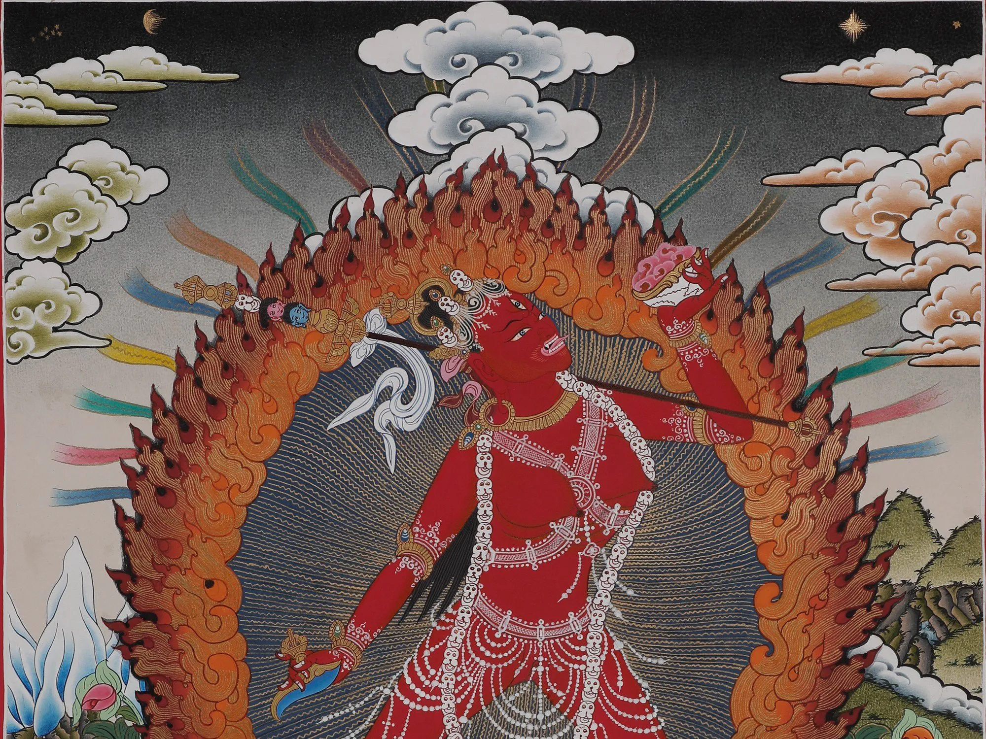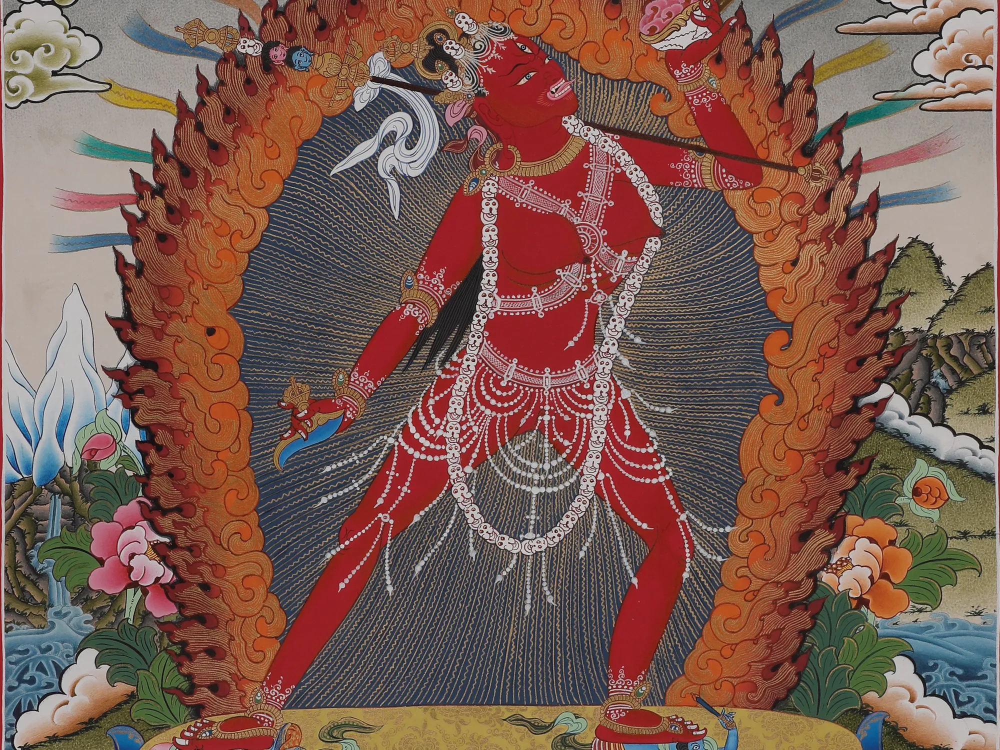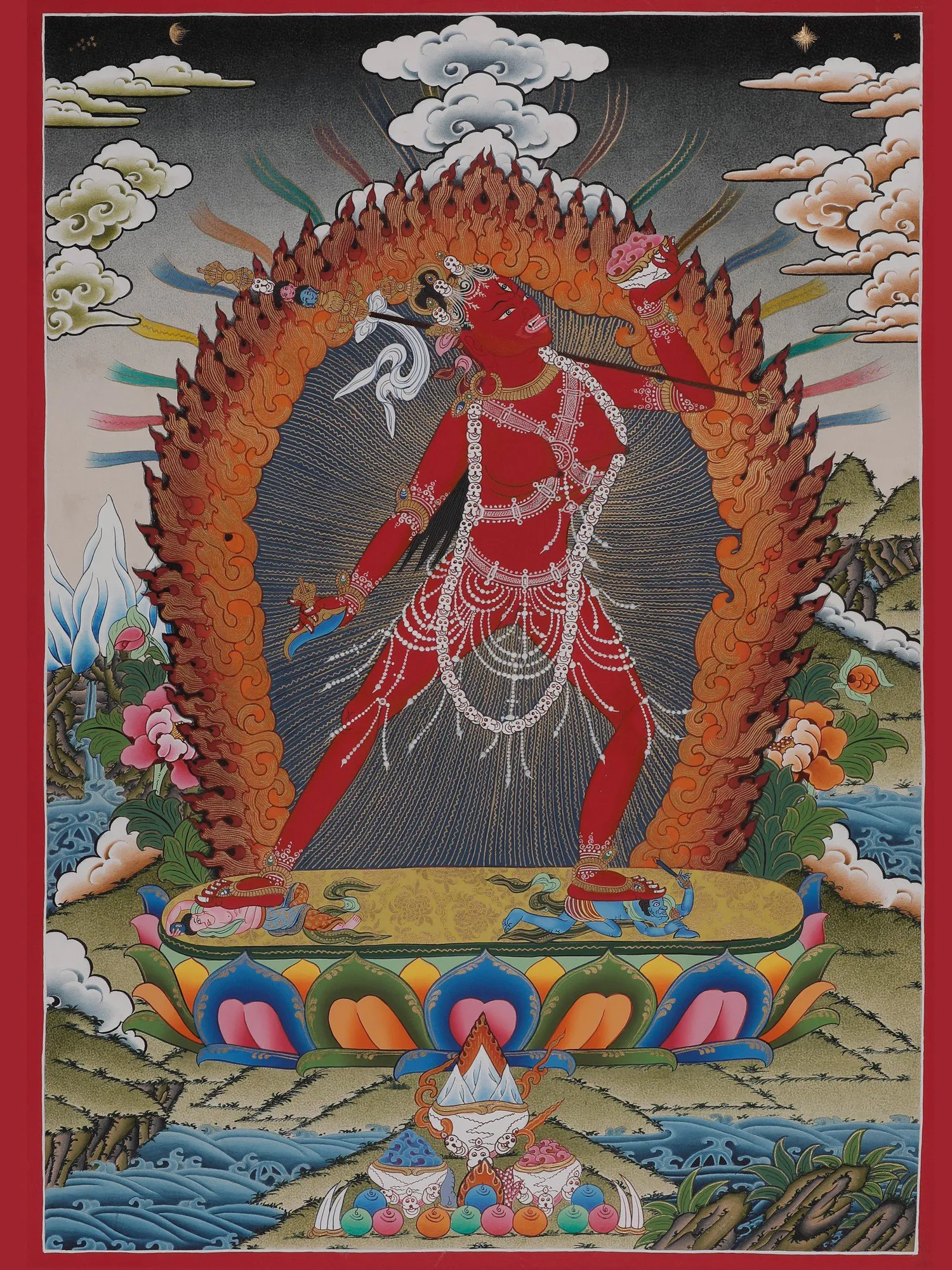 Vajra Yogini is whosignifies the figure in Vajrayana or Tantric Buddhism.She represents the feminine manifestation of cognitive function that leads tospiritual enlightenment. Vajrayana places a strong emphasis on directexperience over mere philosophical views, using imagery from everyday life todeepen one’s understanding of the dual aspect of action (upaya) and awareness(prajna), which mutually support each other. VajraYogini is often described as a frightening figure, grasping a skull as awell as sword in her left hand, her right leg extended outside, and her leftleg bent at the knees. She is surrounded by cremation grounds, symbolizing thatthe ordinary world is perceived as lifeless compared to the rich inner world ofconsciousness and its unclouded perception of reality.