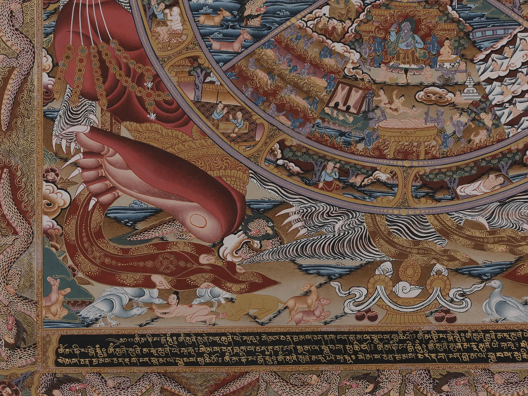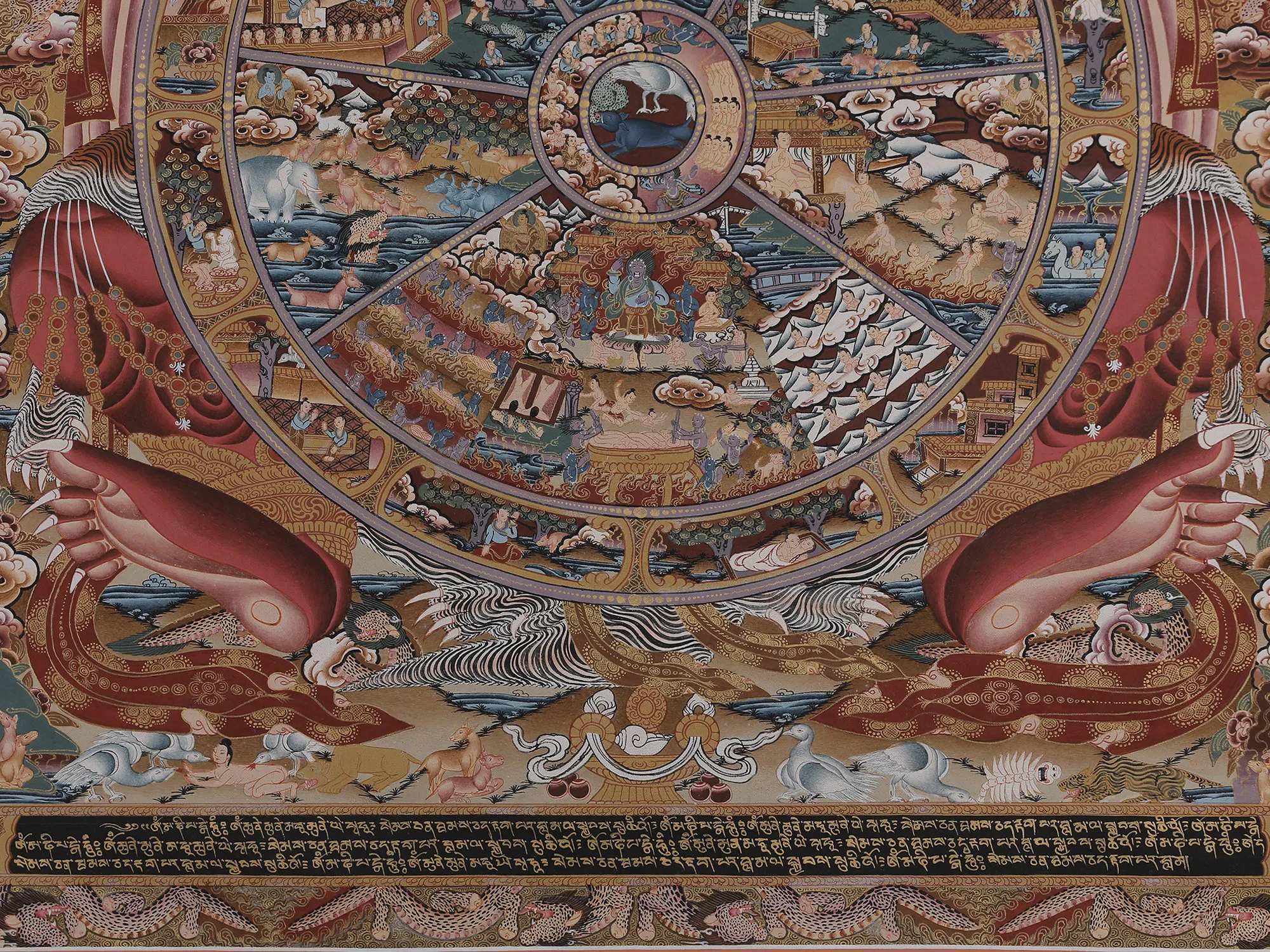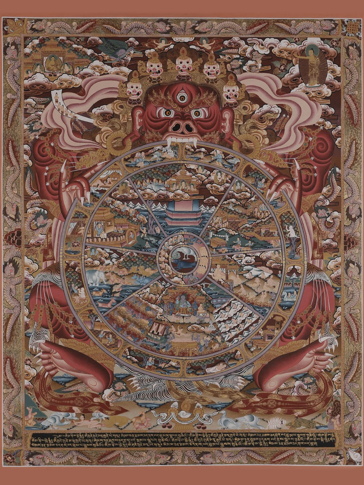 Emerging from thiscentral depiction is the realm of Bardo, a concept challenging to preciselydefine, symbolizing the transitional phase between life and death. Within thisrealm exist six states of existence, showcasing a range of experiences fromheavenly joys to the agonies found in realms like those of hungry ghosts andhell. The imagery vividly illustrates spirits being pulled downward by demons,representing succumbing to the three poisons and negative karma. Conversely,those striving to transcend these poisons ascend, symbolizing the struggleagainst negativity and the pursuit of spiritual elevation.