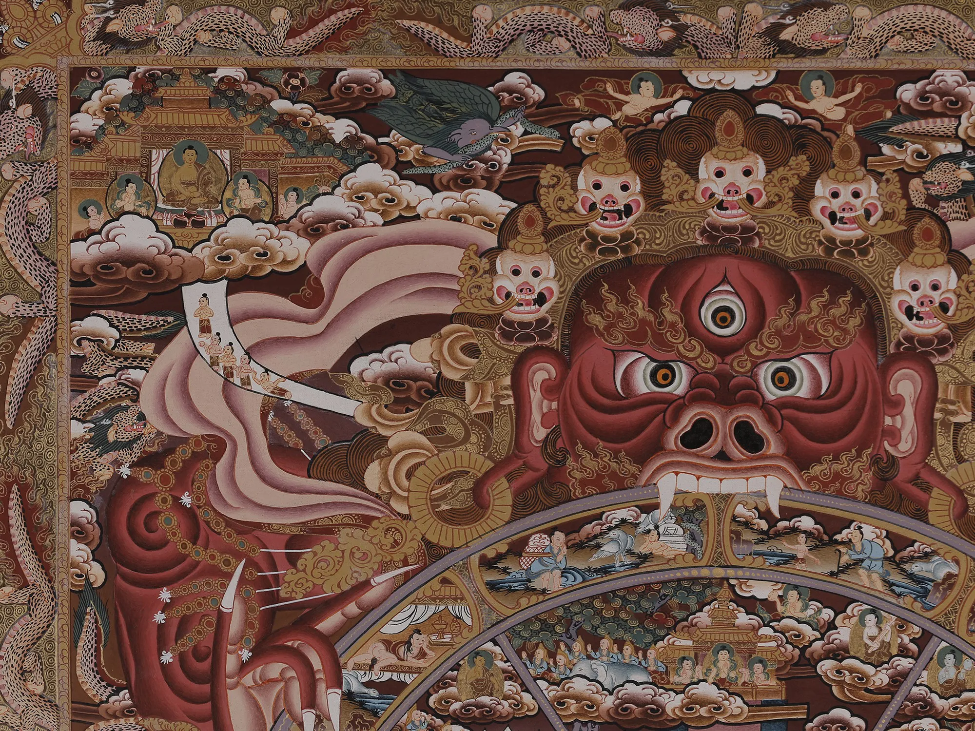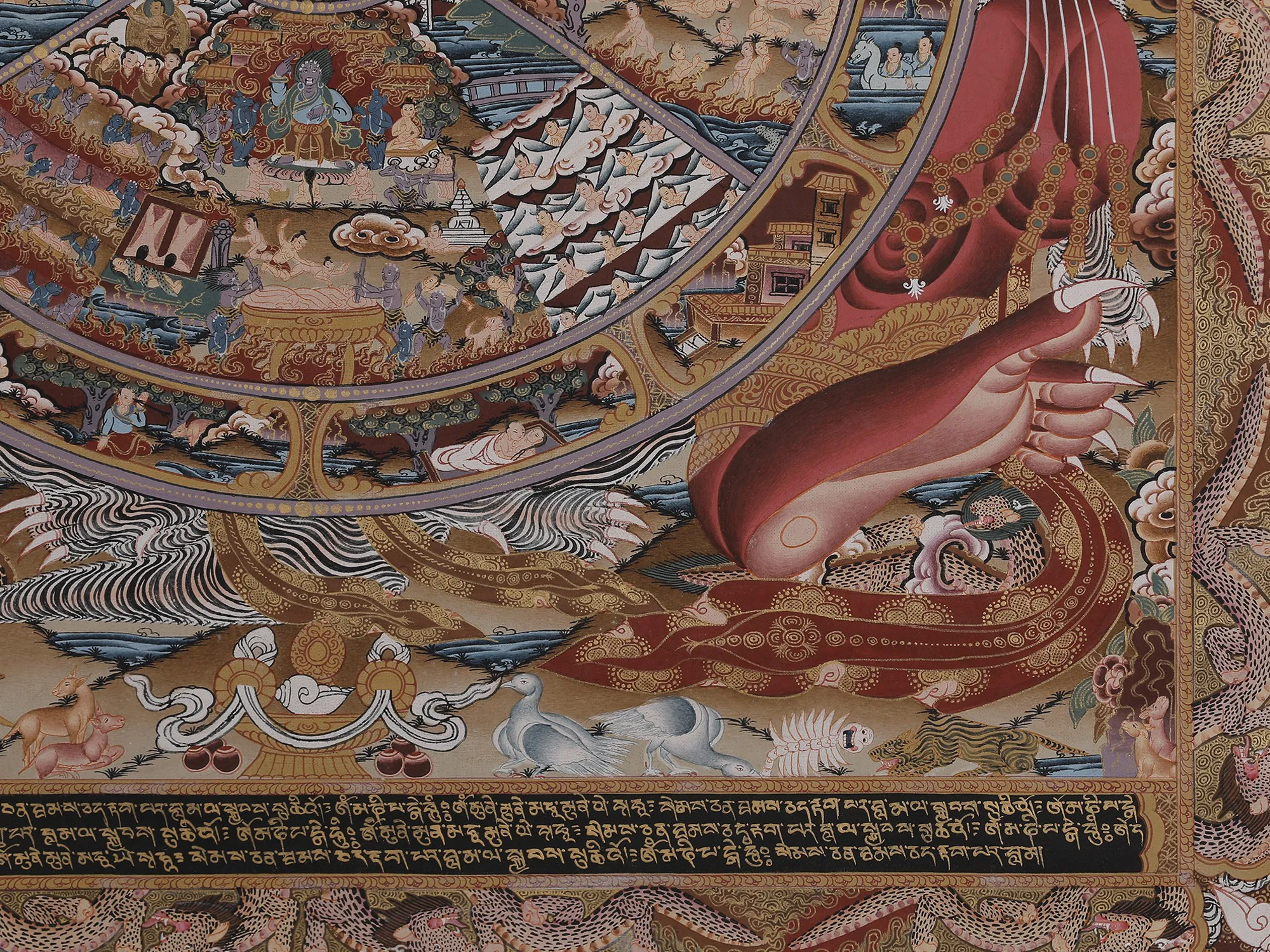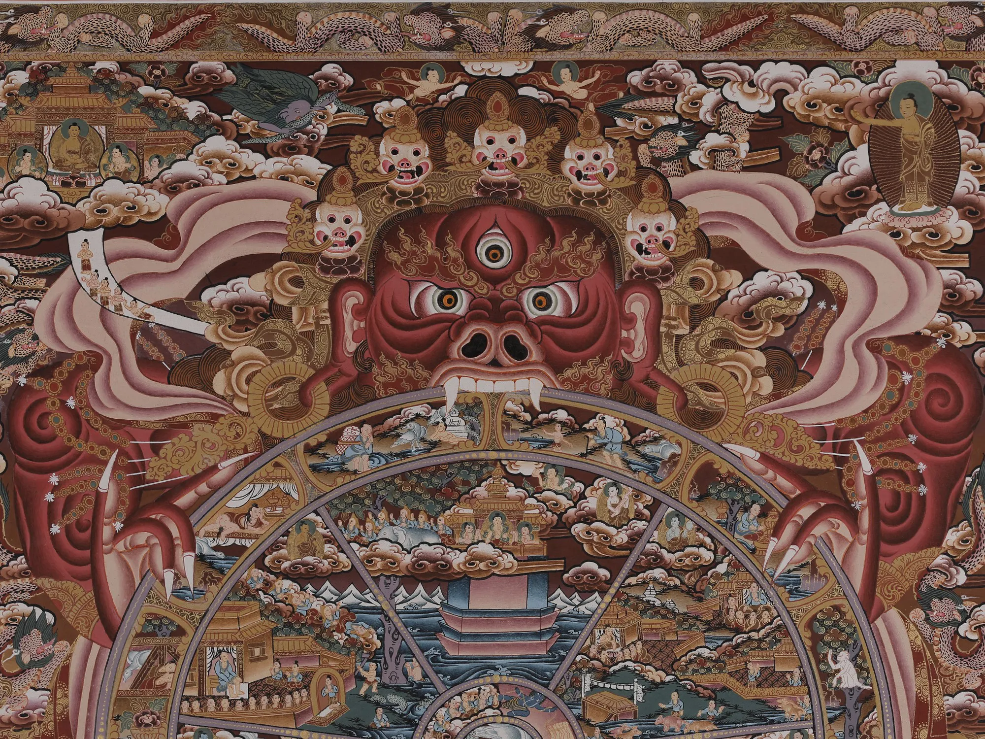 Emerging from thiscentral depiction is the realm of Bardo, a concept challenging to preciselydefine, symbolizing the transitional phase between life and death. Within thisrealm exist six states of existence, showcasing a range of experiences fromheavenly joys to the agonies found in realms like those of hungry ghosts andhell. The imagery vividly illustrates spirits being pulled downward by demons,representing succumbing to the three poisons and negative karma. Conversely,those striving to transcend these poisons ascend, symbolizing the struggleagainst negativity and the pursuit of spiritual elevation.