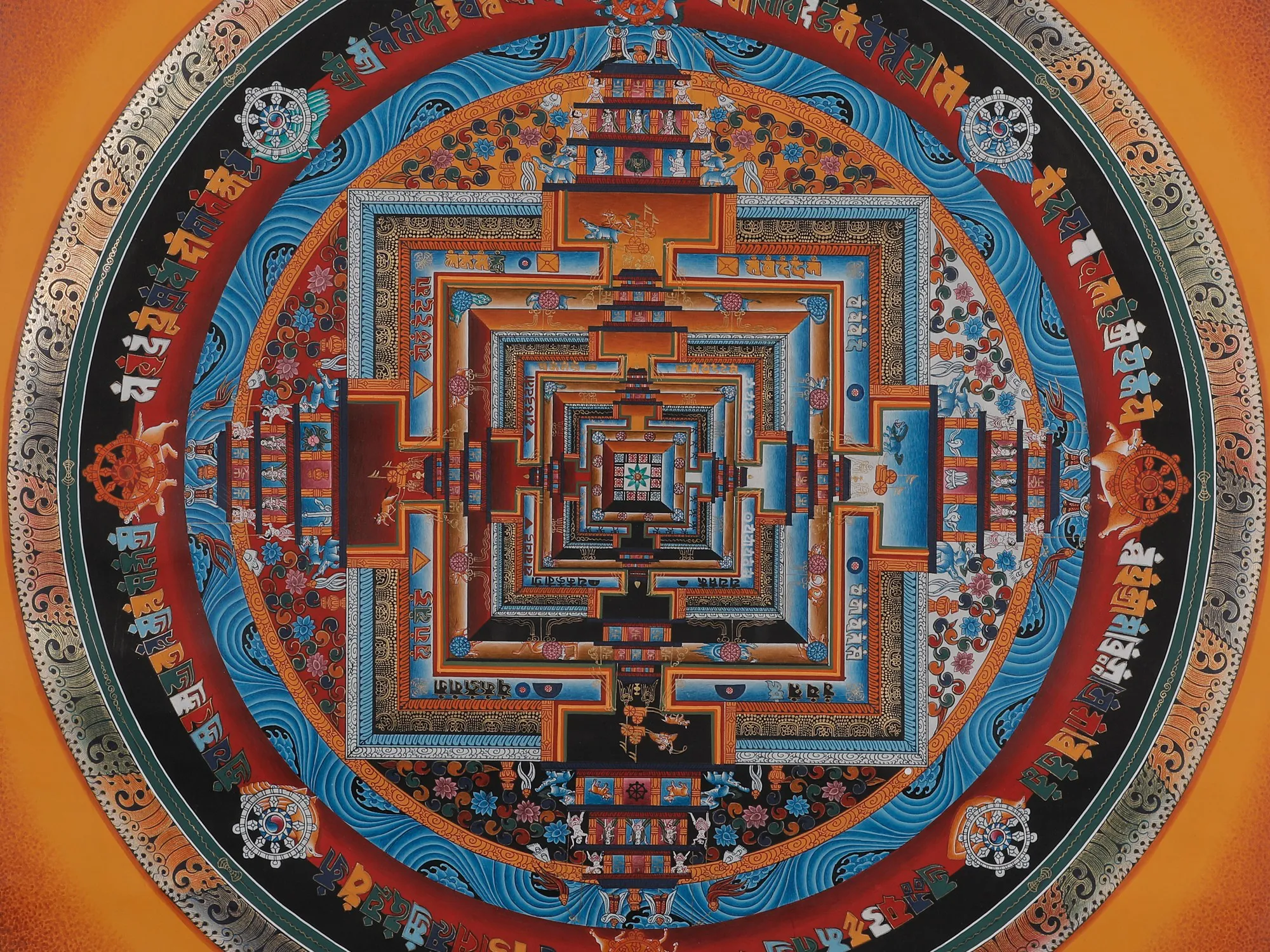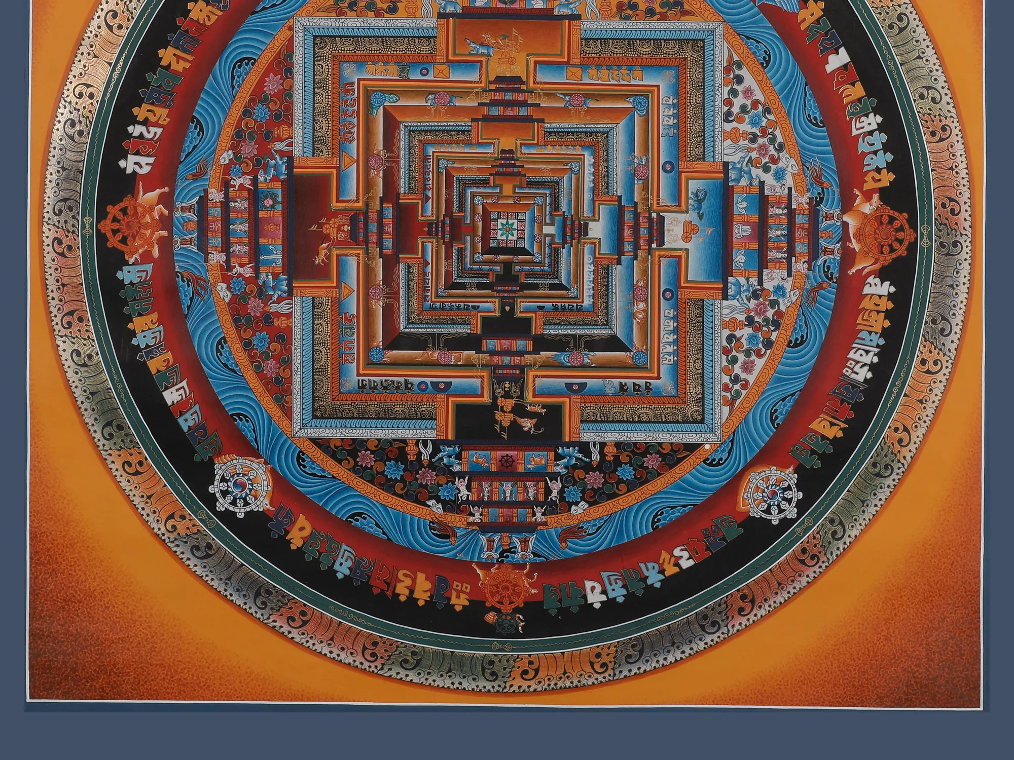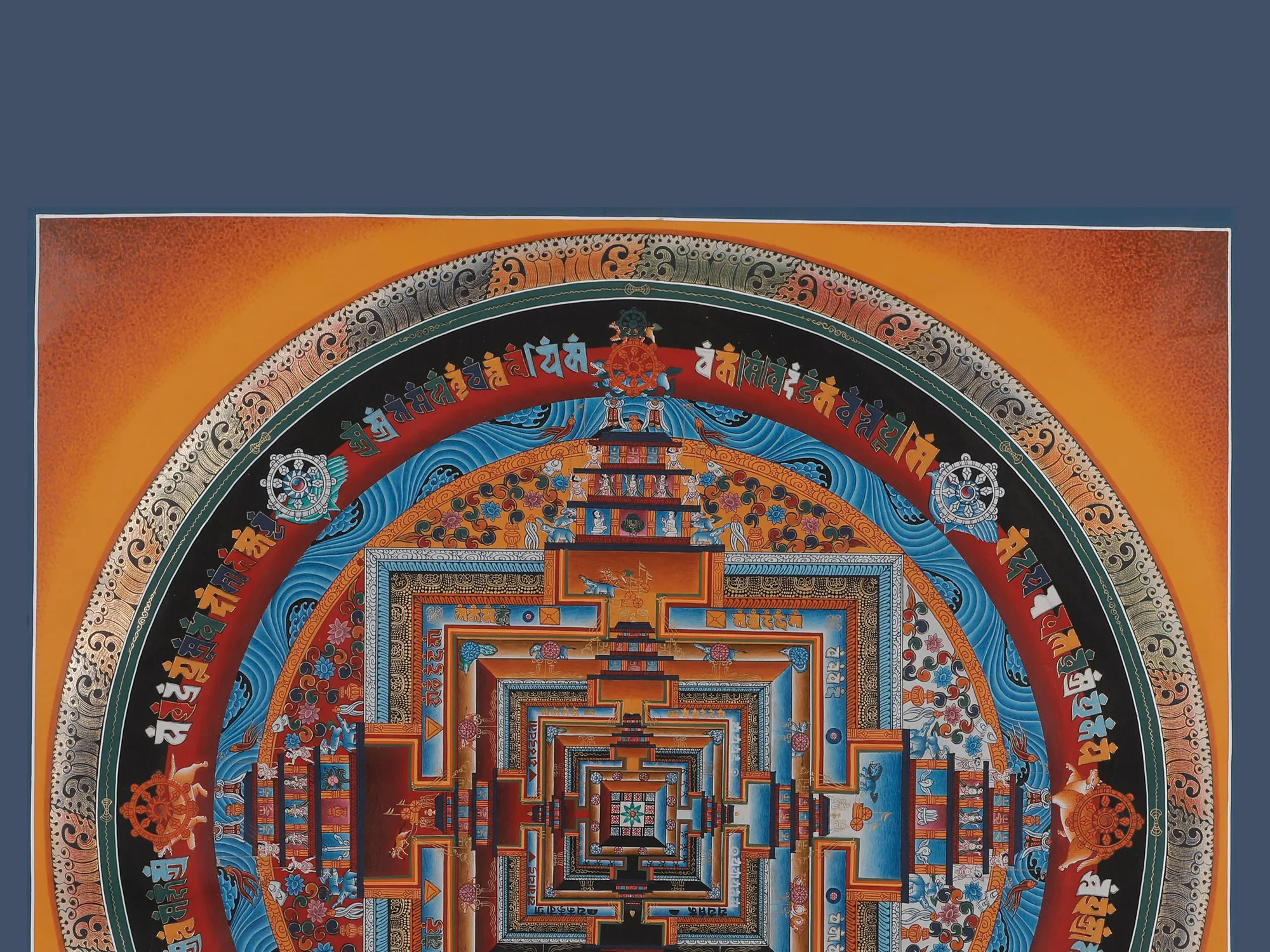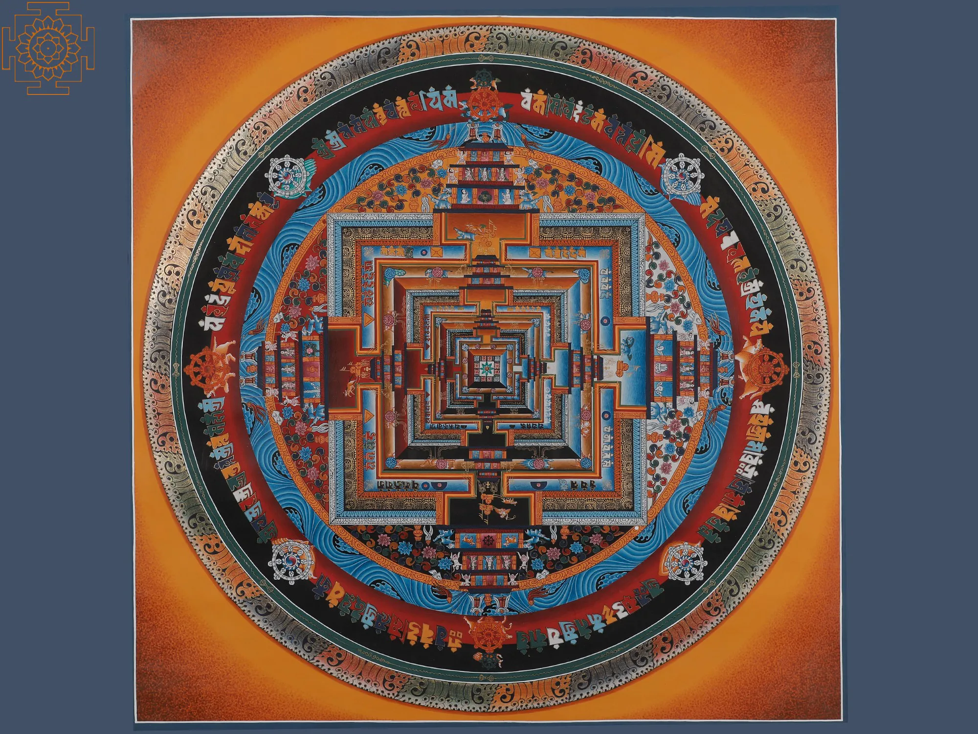 Kalachakra or wheel of time is the primedeity or the instrument of tantric initiation in Vajrayana Buddhism - a complexarrangement of calculated patterns, it contains the cosmic essence of ourreality. Made in awe-inspiring Thangka art, this Mandalarules ideas with intention and takes the mind, body, and speech to evolutionaryspiritual realizations.