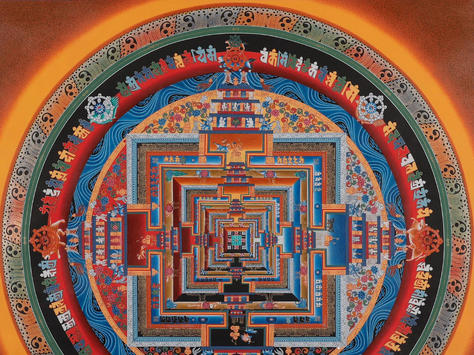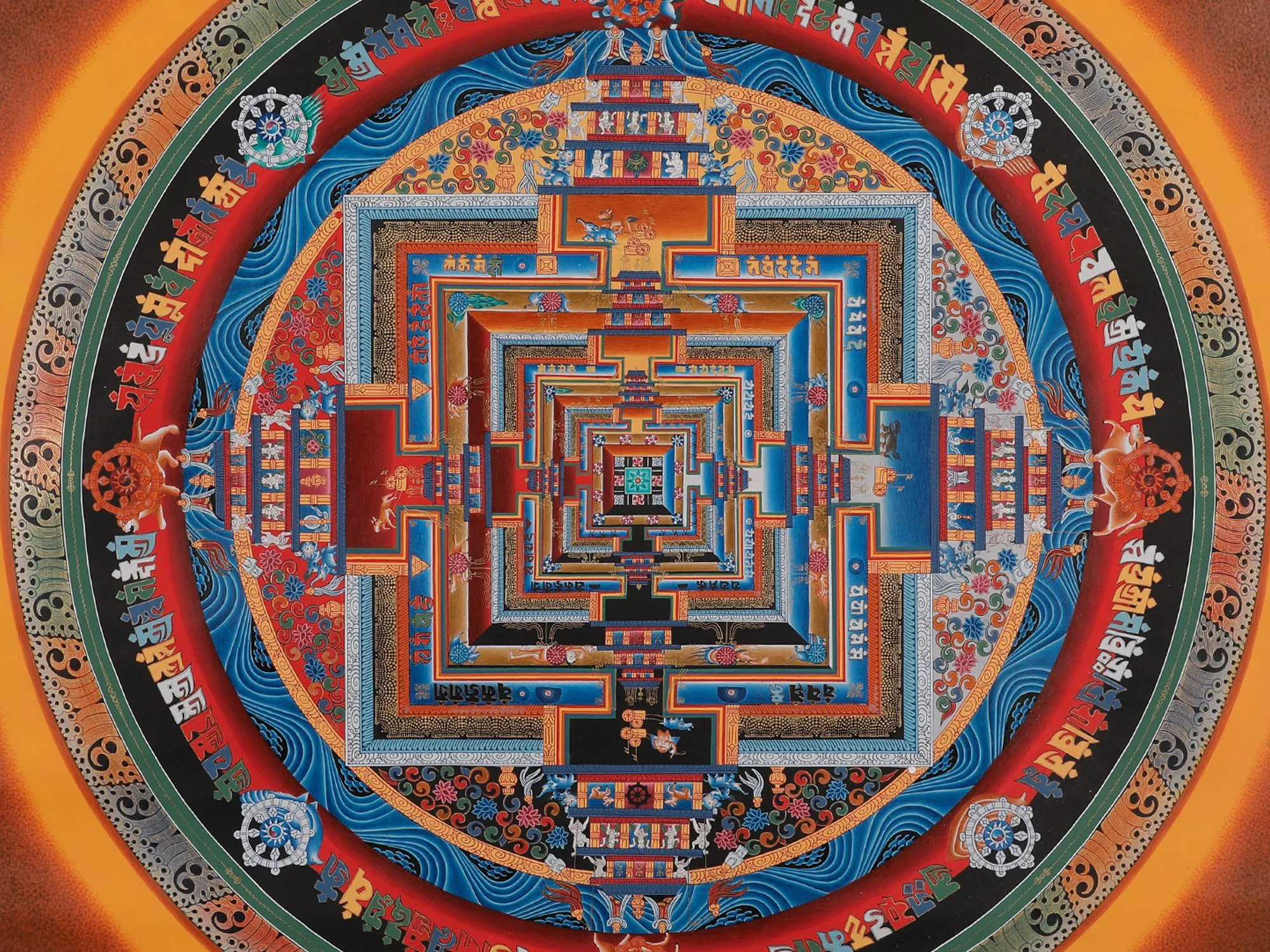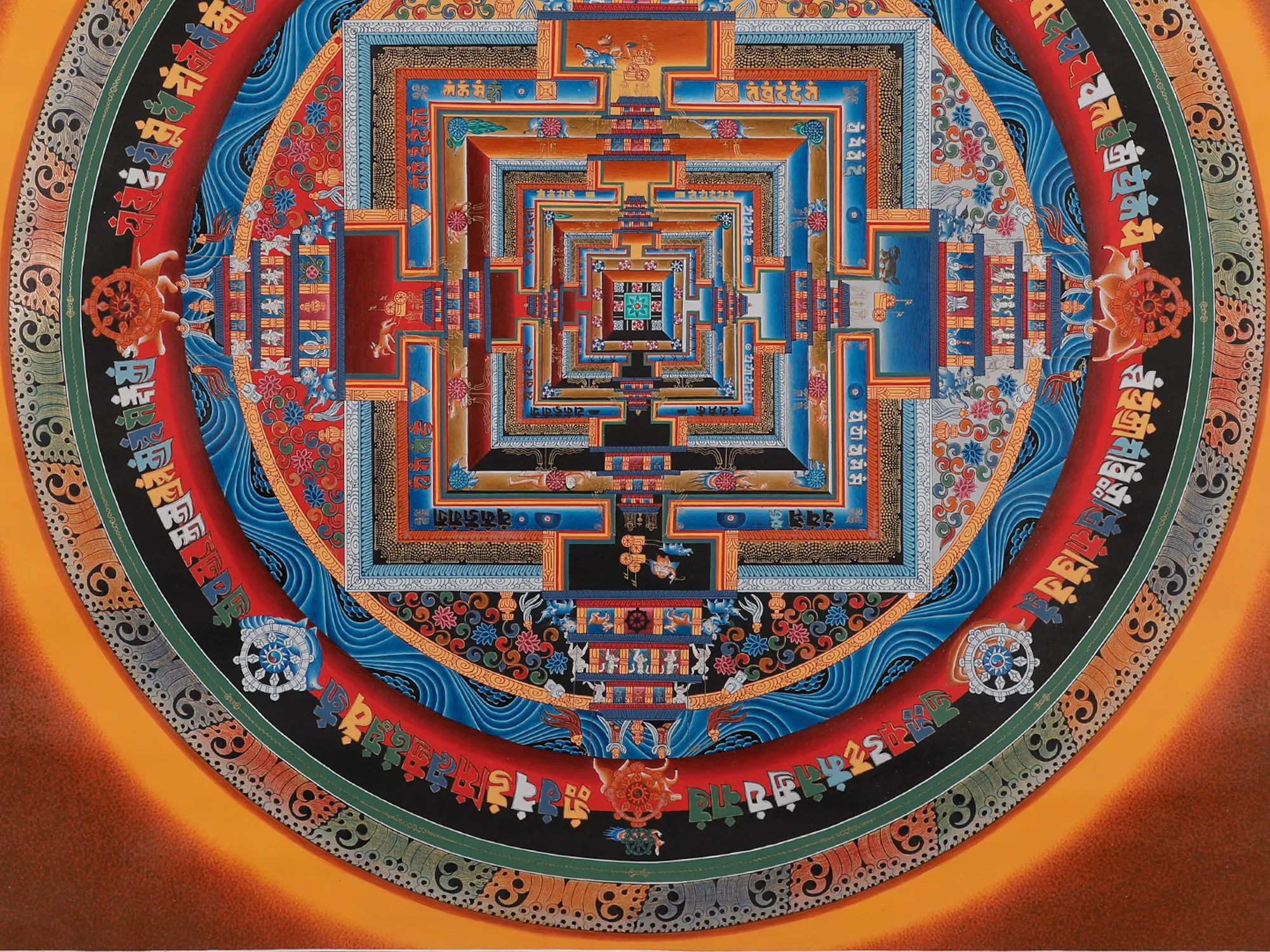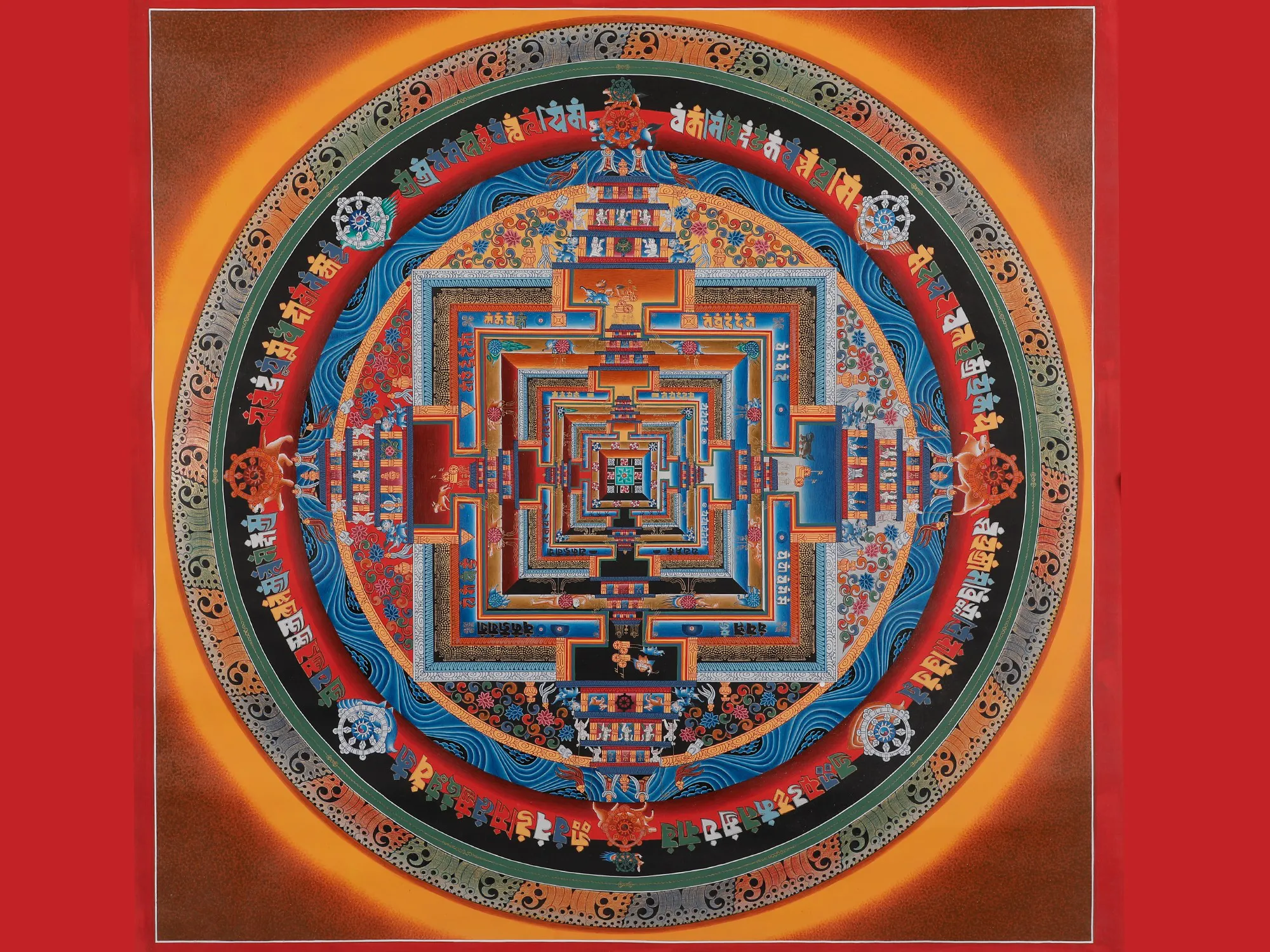Apriceless and exquisite work of art with significant meaning in TibetanBuddhismare the Kalchakra Mandala Thangkas. The Kalachakra Tantra is a complicatedBuddhist doctrine that incorporates many facets of cosmology, meditation, andthe road to enlightenment. This spiritual masterpiece is a visual portrayal ofthis teaching. Practitioners use the Kalchakra Mandala Thangka as a meditationtool while reflecting on its numerous features and symbolism in order to bettercomprehend the Kalchakra Tantra and its teachings. It also plays a significantpart in the complex initiation ceremony known as Kalachakra empowerment, whichis performed by Tibetan Buddhist lamas. It is utilised in complicated ritualsand ceremonies in Tibetan Buddhism.