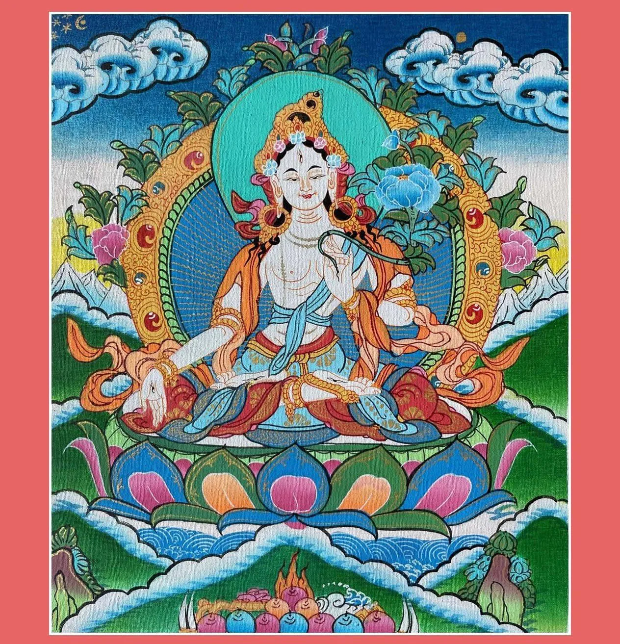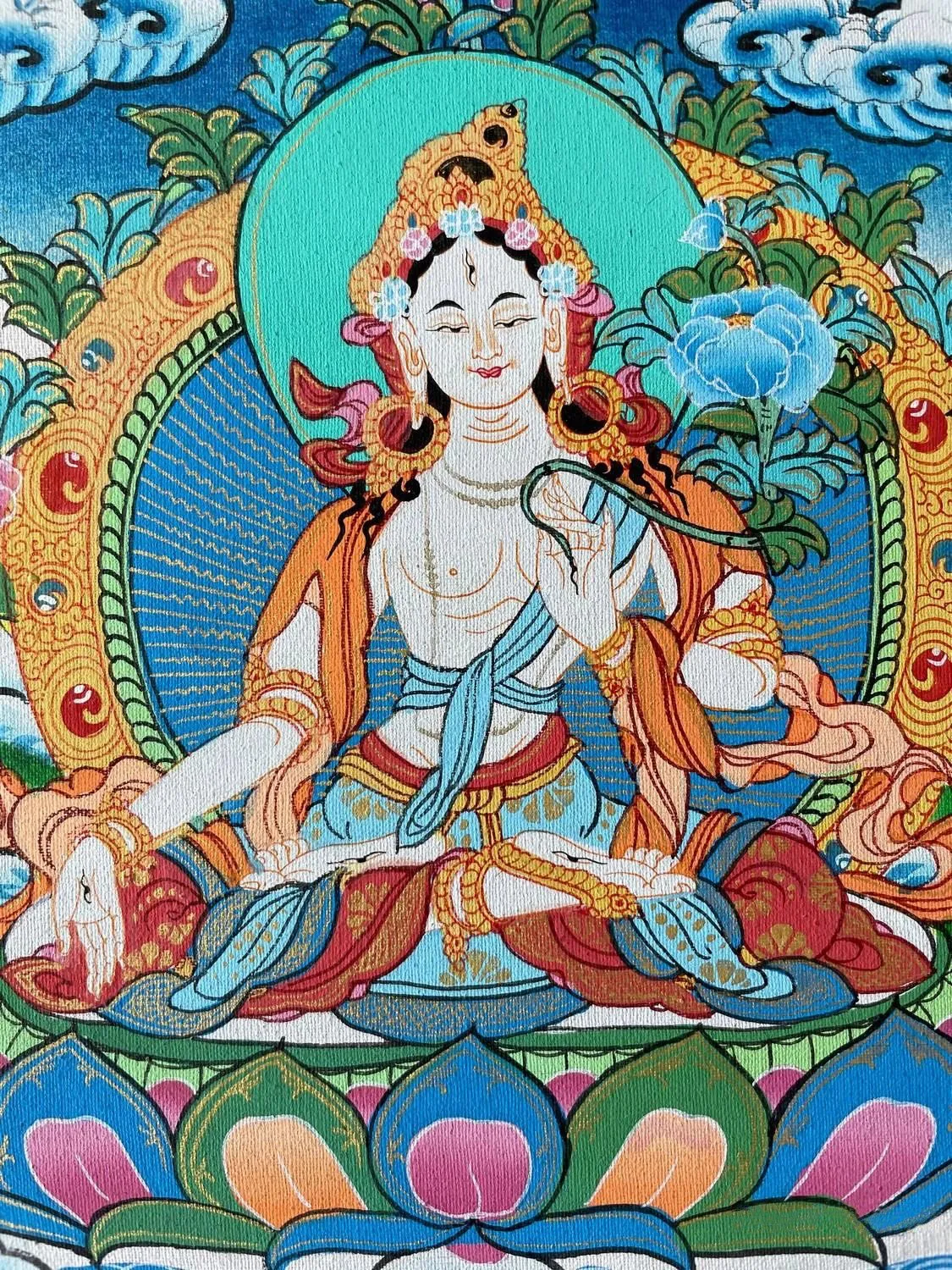 Devotees turn toWhite Tara to heal physically and spiritually, and she is also invoked forprotection and guidance. The mantra associated with White Tara is "Om TareTuttare Ture Mama Ayuh Punya Jnana Pustim Kuru Svaha," chanted to connectwith her compassionate and nurturing qualities. Thangkas depicting White Taraserve as powerful focal points for meditation and inspire practitioners ontheir spiritual journey toward well-being and enlightenment.